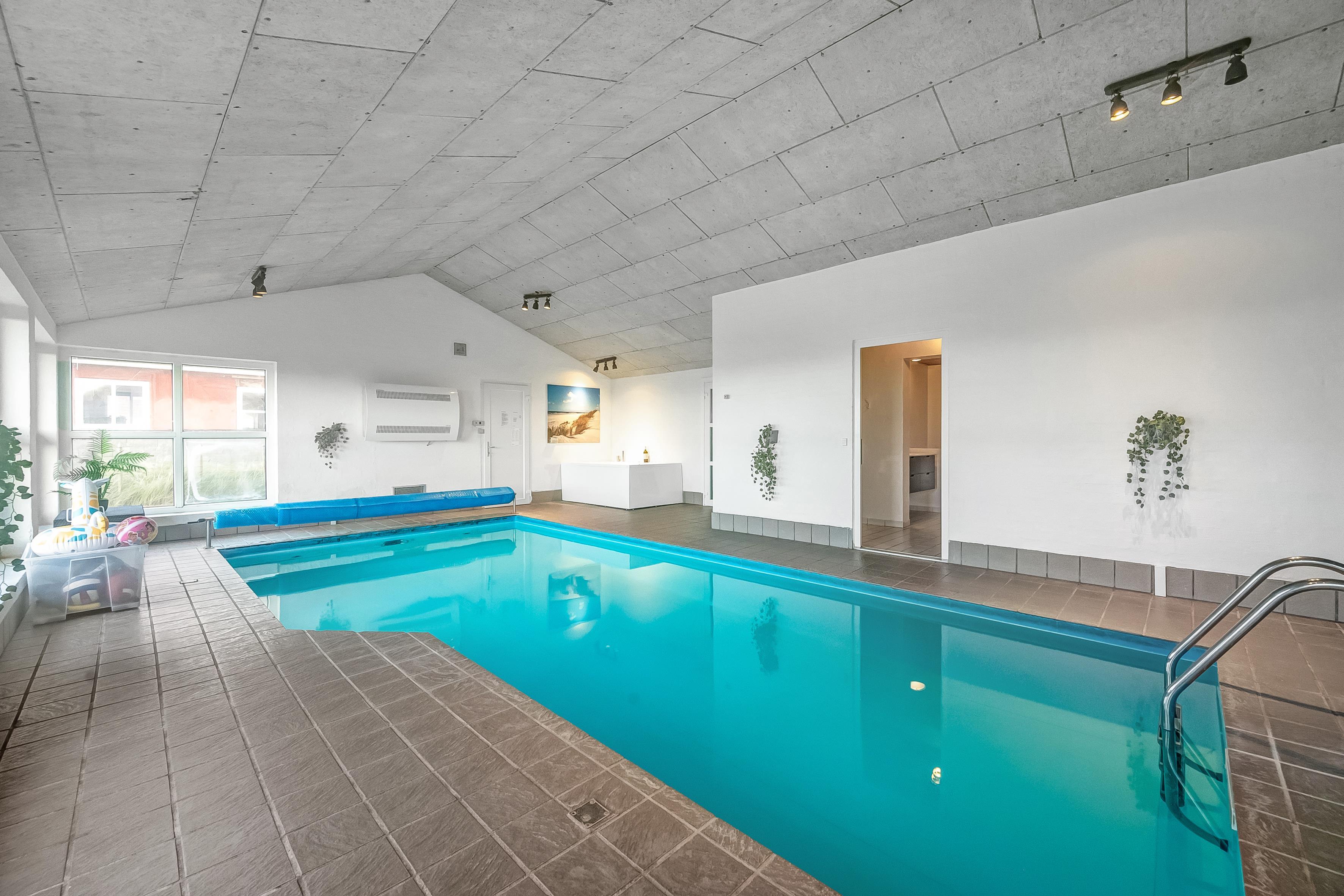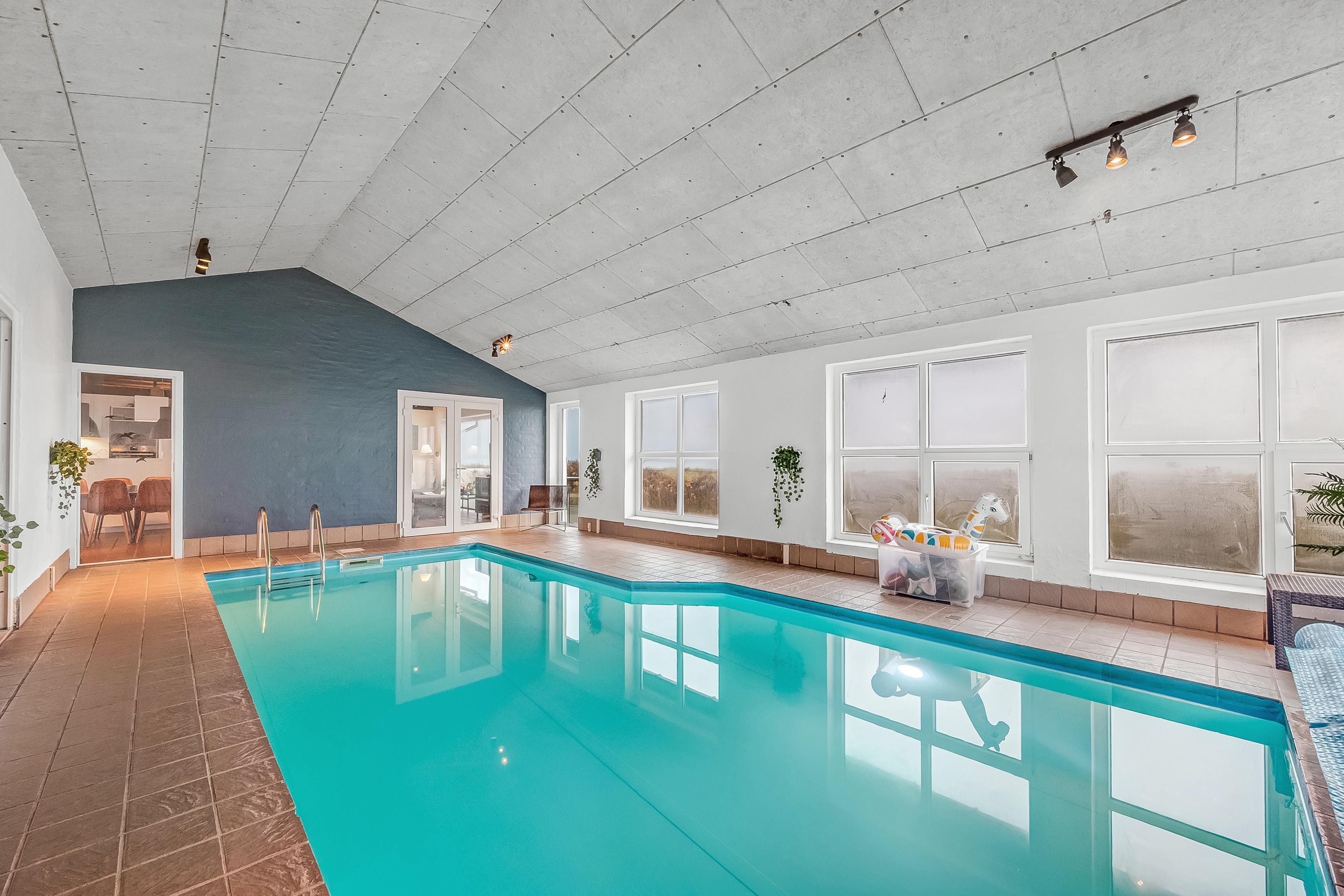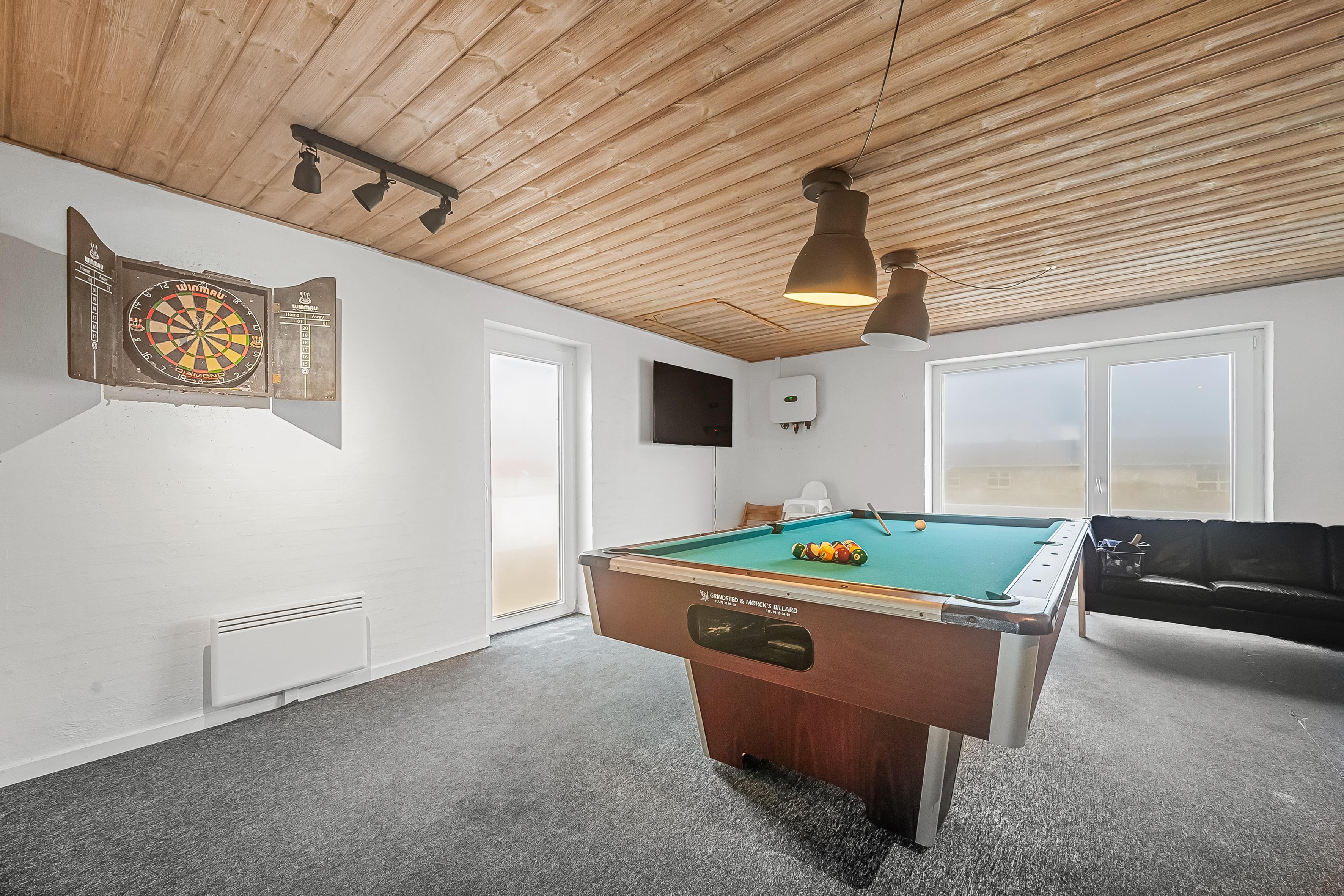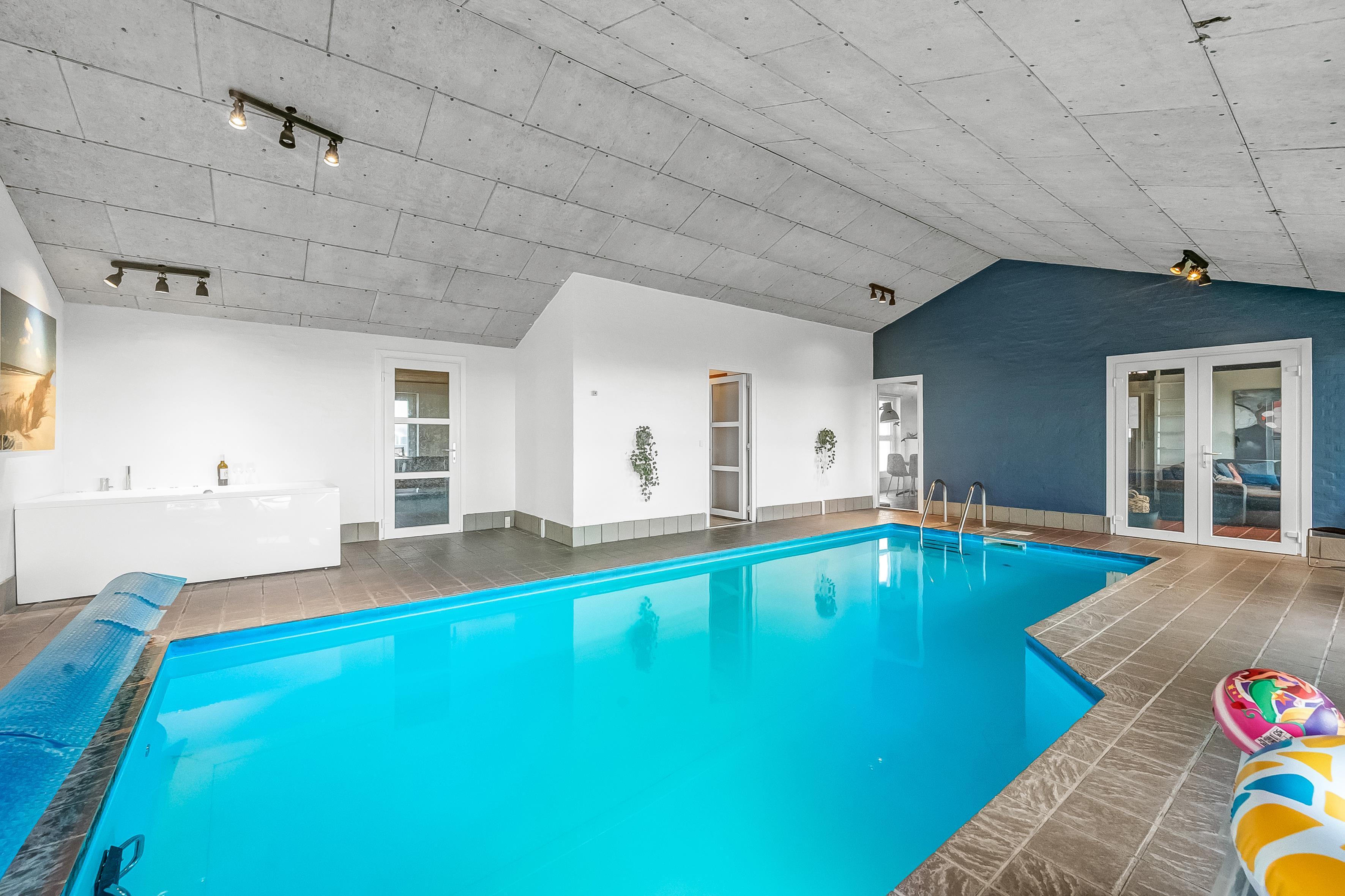Indendørs byder sommerhuset på masser af plads og aktiviteter. Poolhuset har en skøn swimmingpool, hvor vandet altid er dejligt varmt – perfekt til både leg og afslapning. Derudover er der mulighed for at underholde sig i husets aktivitetsrum med billard, dart og bordfodbold. De fem rummelige soveværelser og hemsen sikrer god nattesøvn for hele familien, mens den indendørs spa og sauna tilbyder afslapning og velvære efter en lang dag i naturen.
