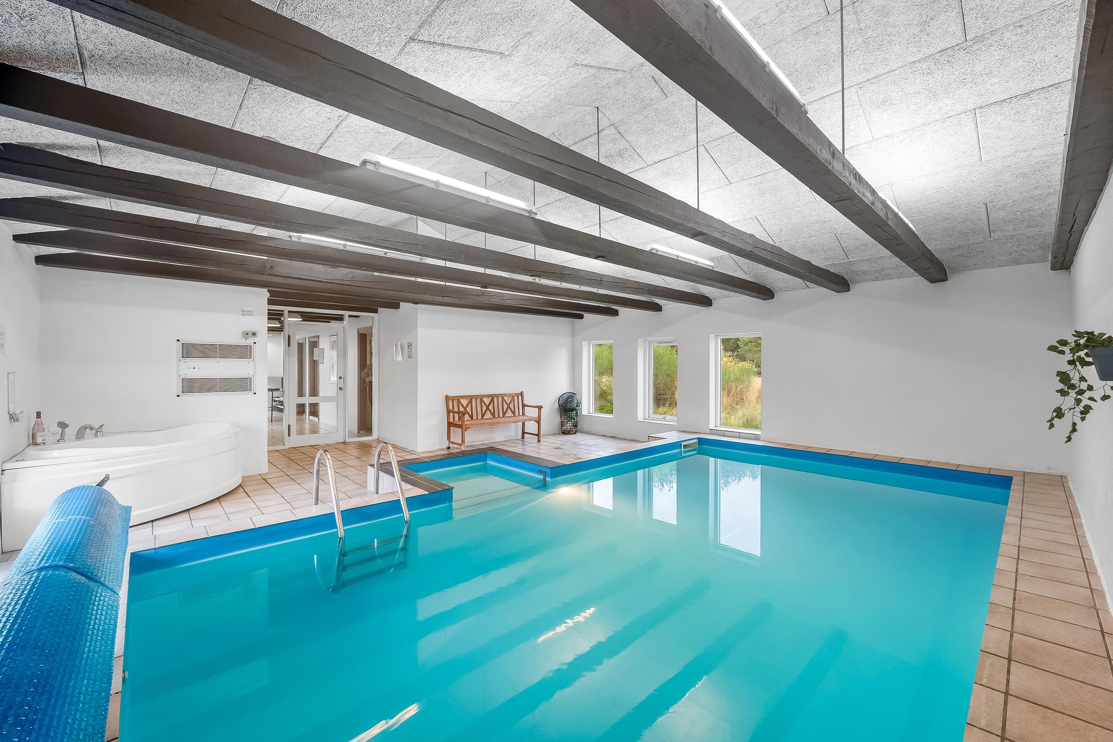 Feriehuset er udstyret med alt, hvad I behøver for at slappe af og nyde ferien. Den store swimmingpool (6,5 m x 3,5 m) indbyder til sjov og afslapning, mens den varme sauna og spaen til to personer, tilbyder det perfekte sted til at lade batterierne op, efter en dag i naturen. Her er også brændeovn, energivenlig varmepumpe og gulvvarme, som sørger for, at I altid har det behageligt.