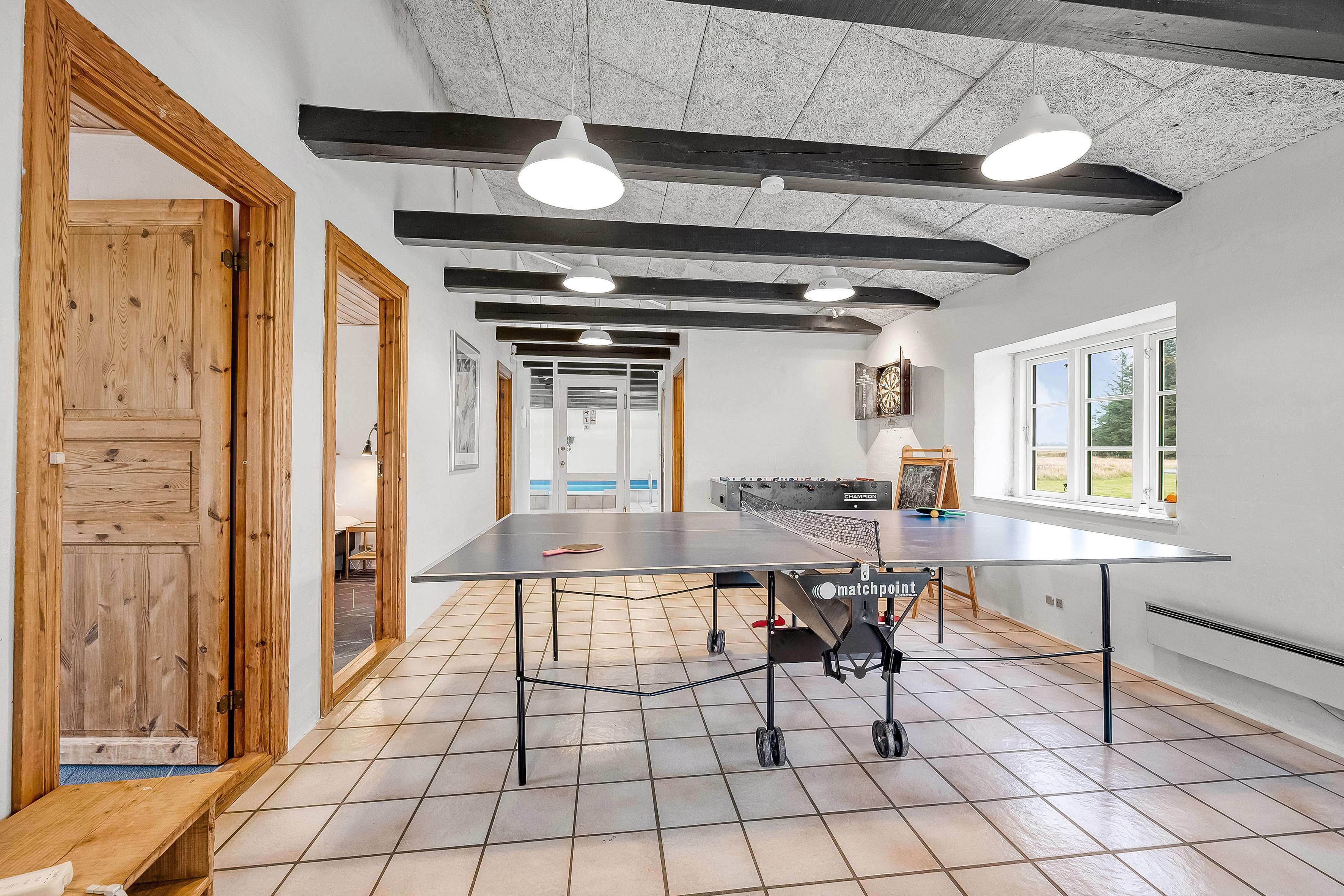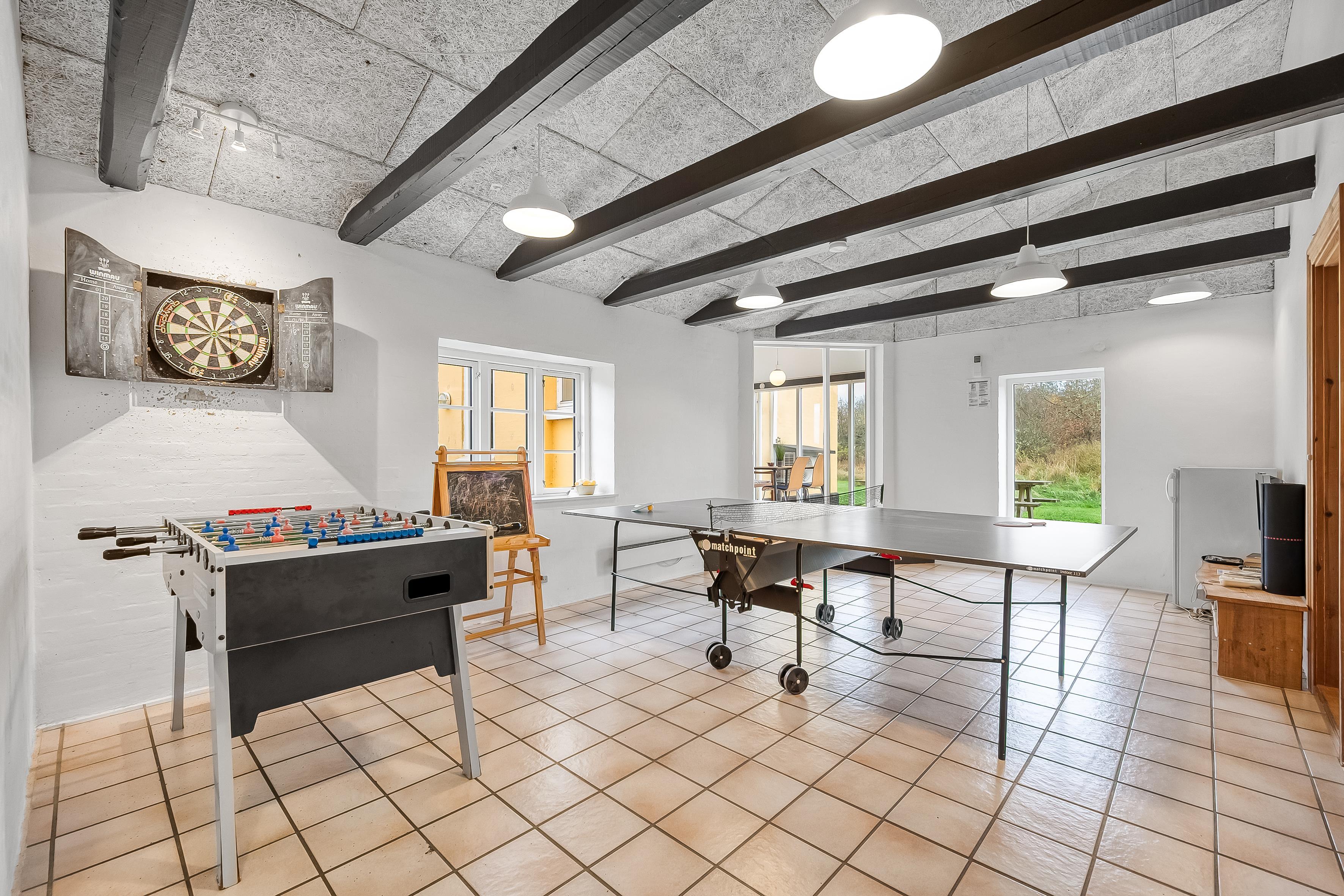 I feriehusets store aktivitetsrum, kan i spille både bordtennis, bordfodbold og dart, så kan resultatet afgøre, hvem der skal stå for morgenmaden.