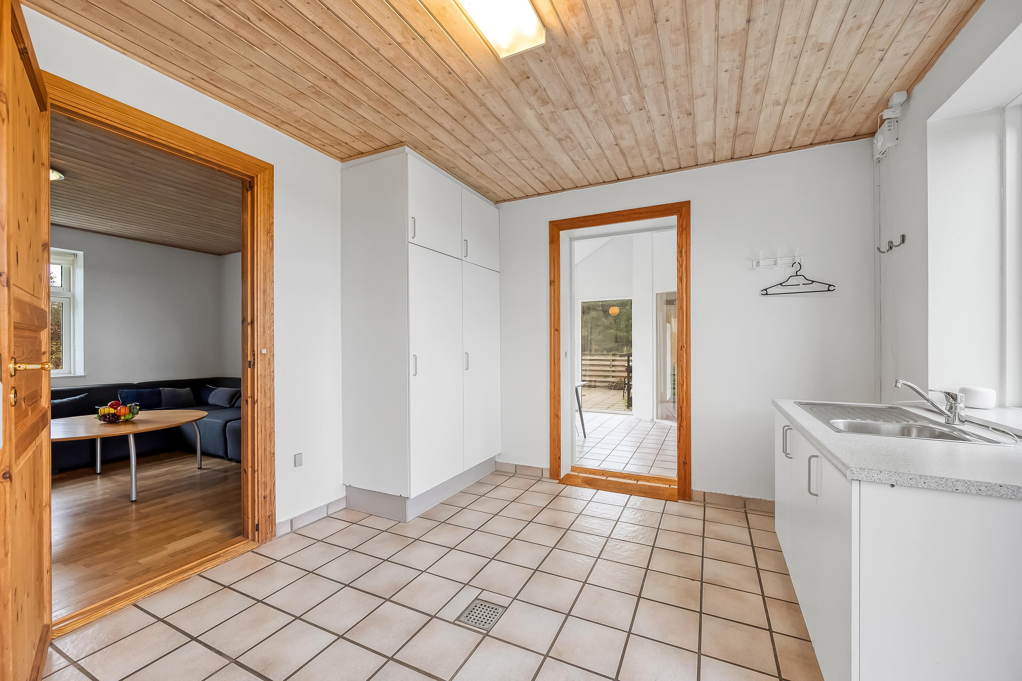 Udendørs glæder På den store terrasse (68 m²) er der masser af plads til at nyde solen, grille lækre måltider eller lade børnene lege på gyngen og i sandkassen. Den store naturgrund er et paradis for udendørsaktiviteter, og der er rig mulighed for at parkere lige ved sommerhuset.