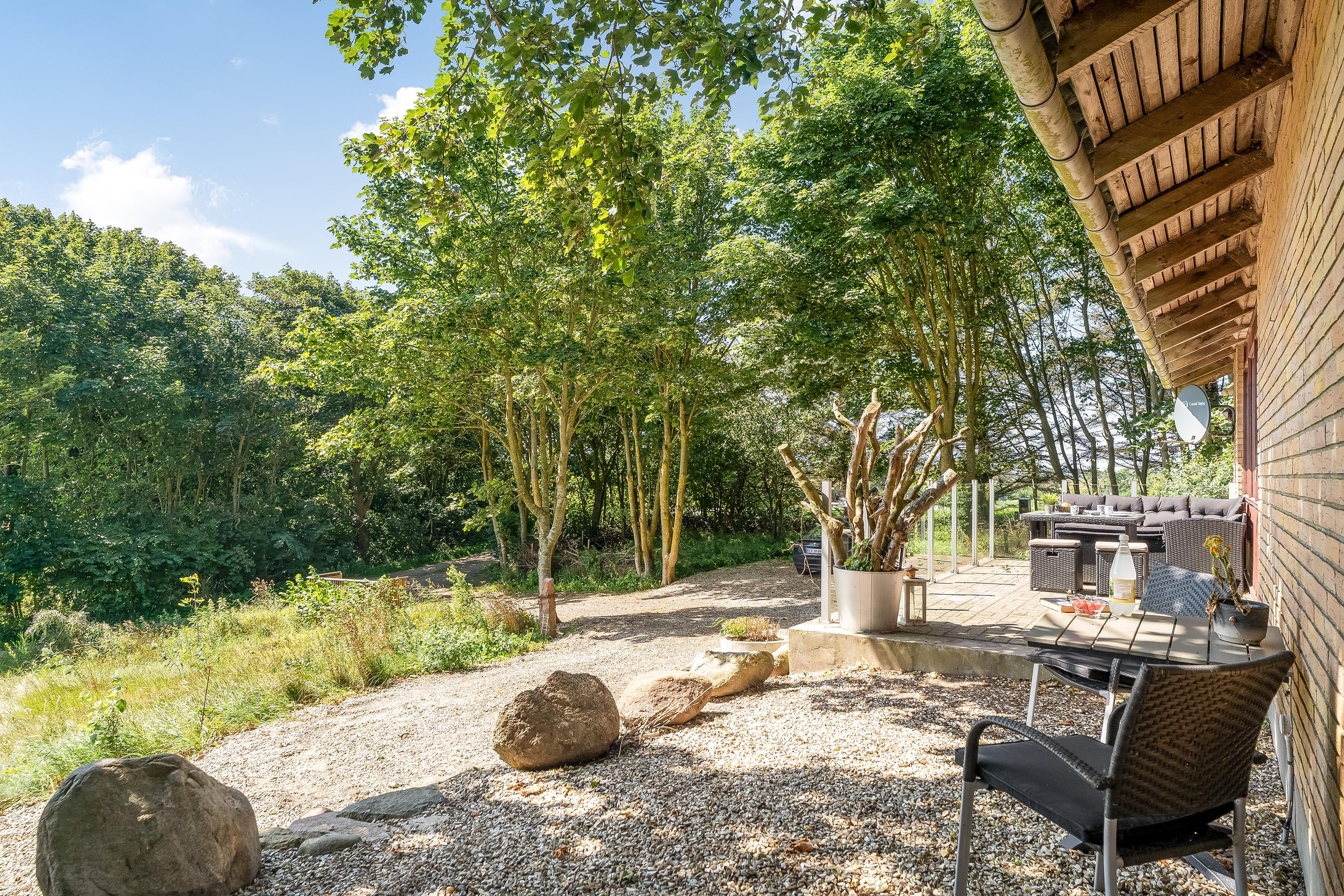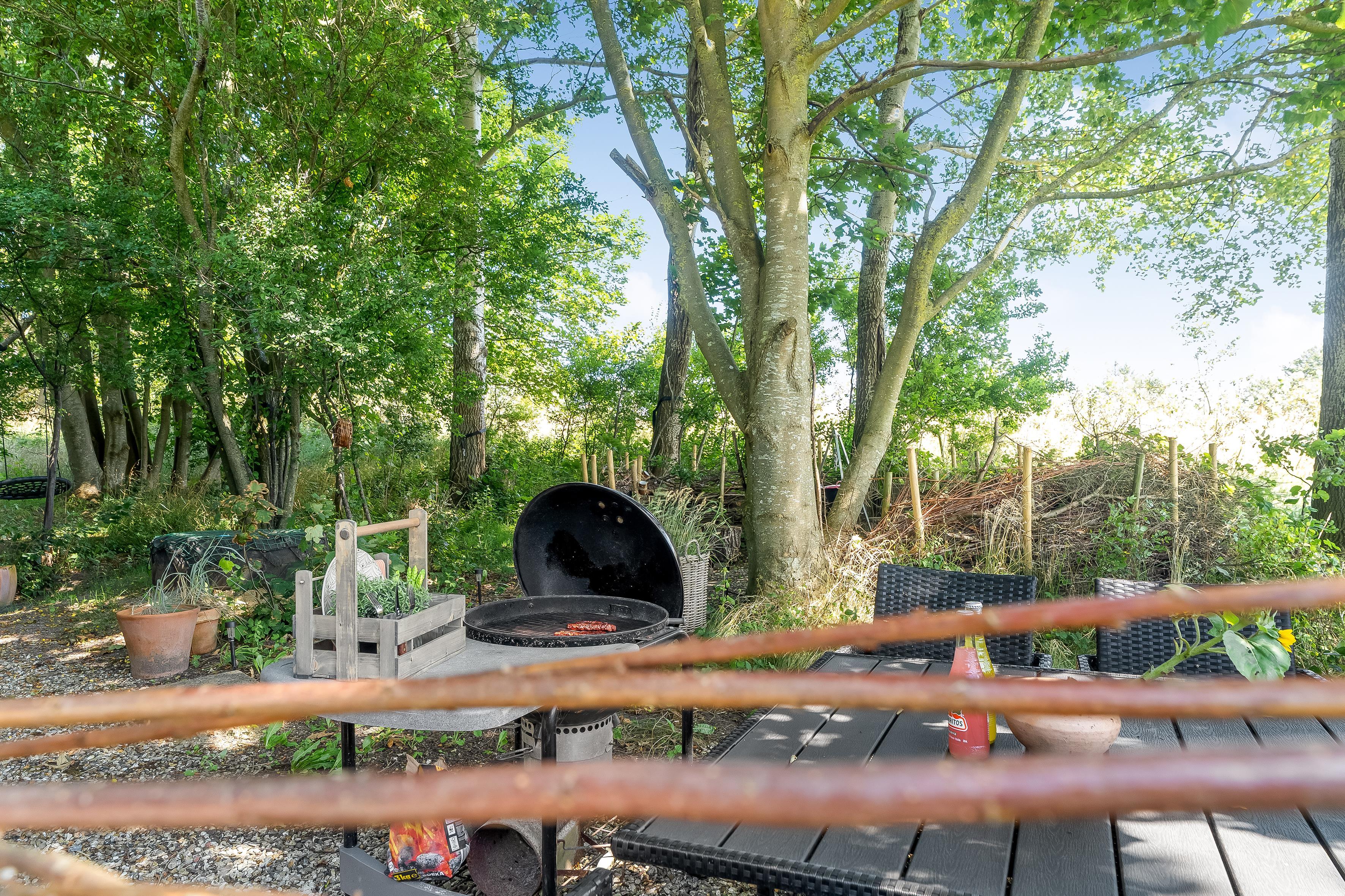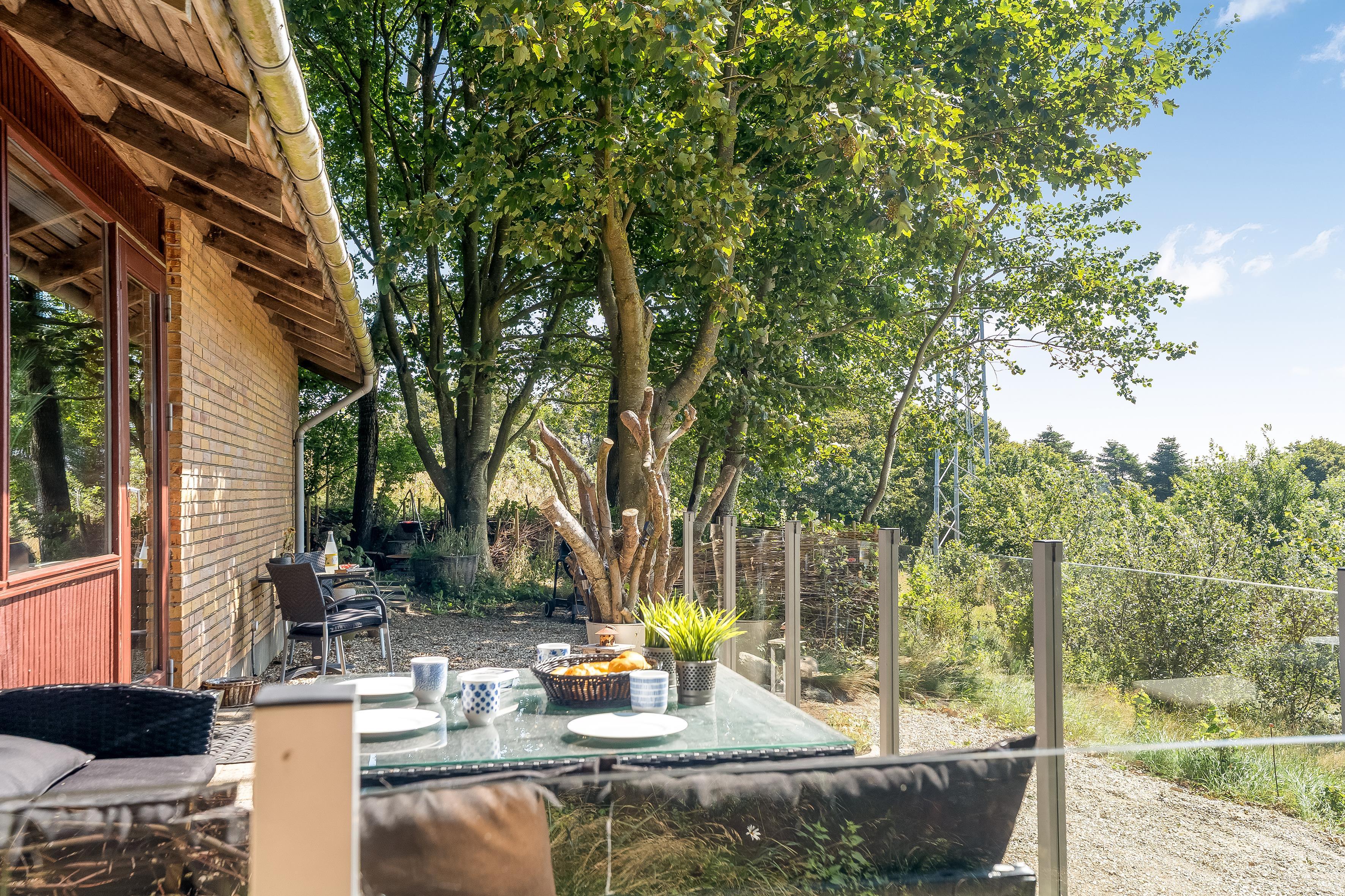 Udenfor er der en dejlig terrasse, hvor du kan nyde morgenkaffen eller grille om aftenen. Terrassen er omkranset af en dejlig naturgrund, der inkluderer et bålsted, gynger og en sandkasse til børnene - perfekt til sjov og leg. Det udendørs område er ideelt til at nyde den friske luft og den smukke natur.