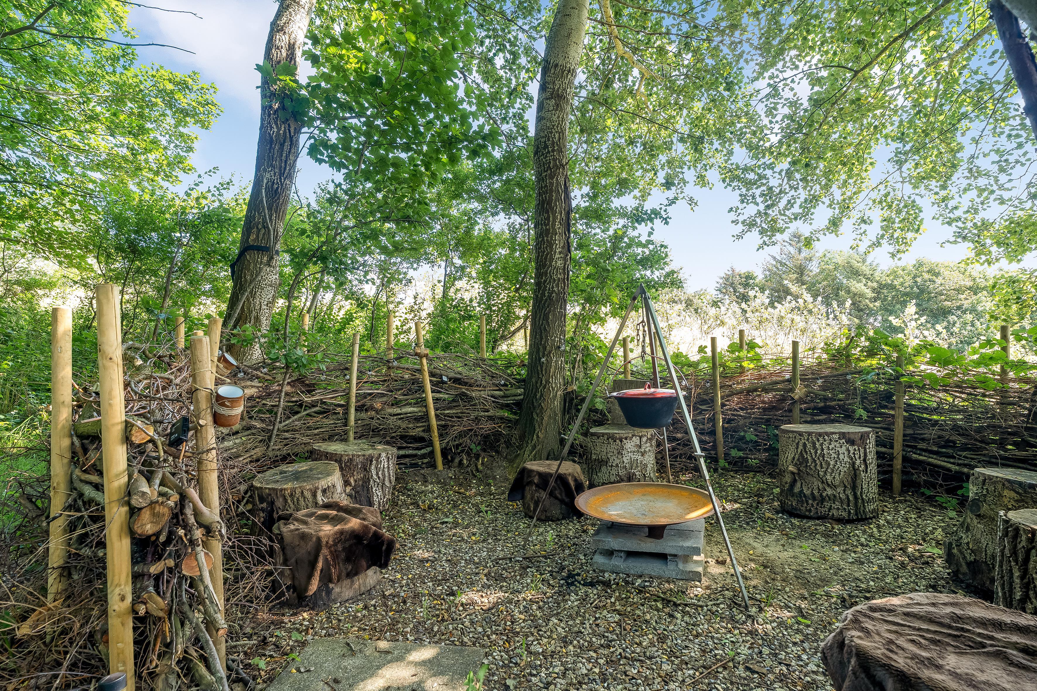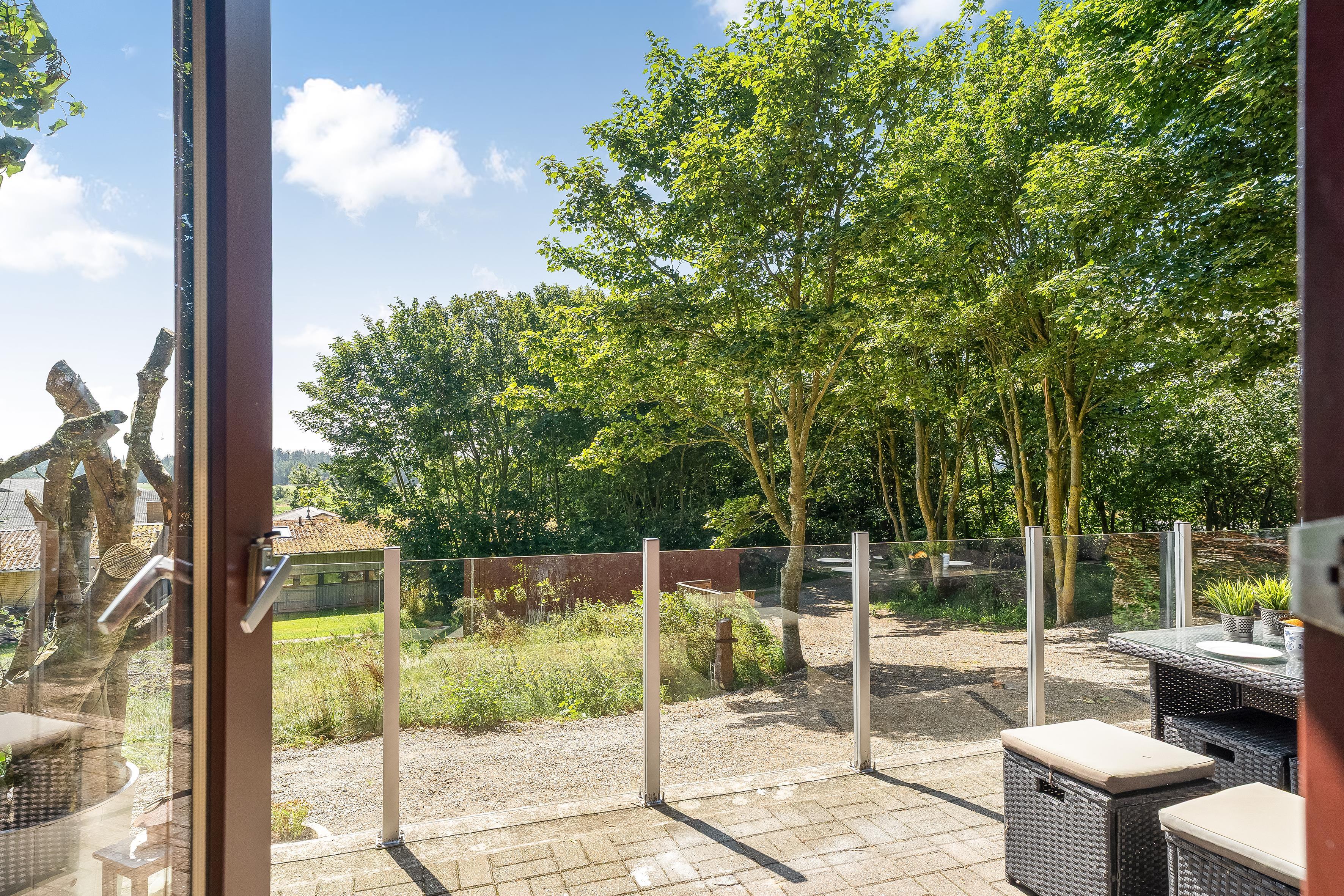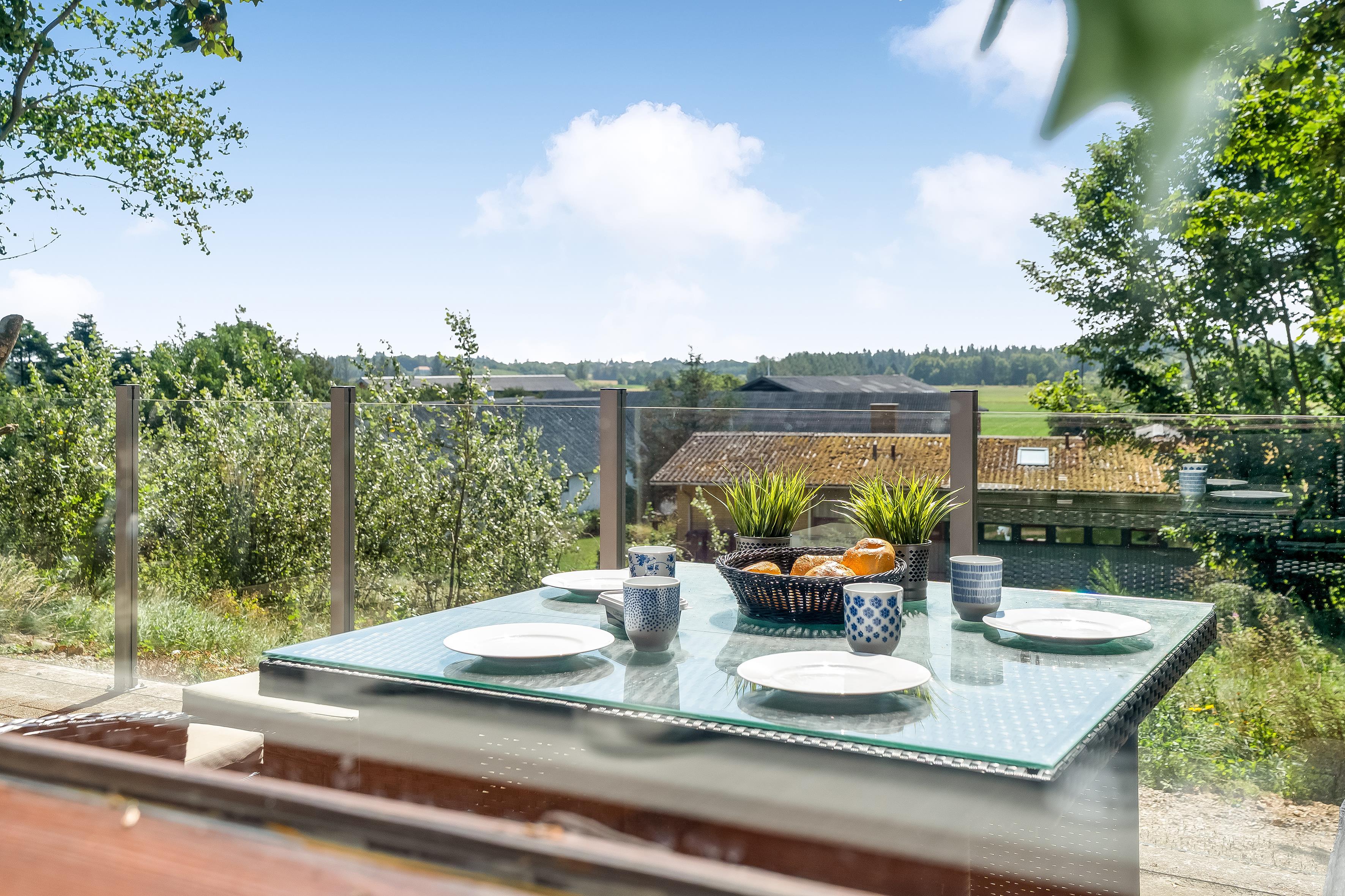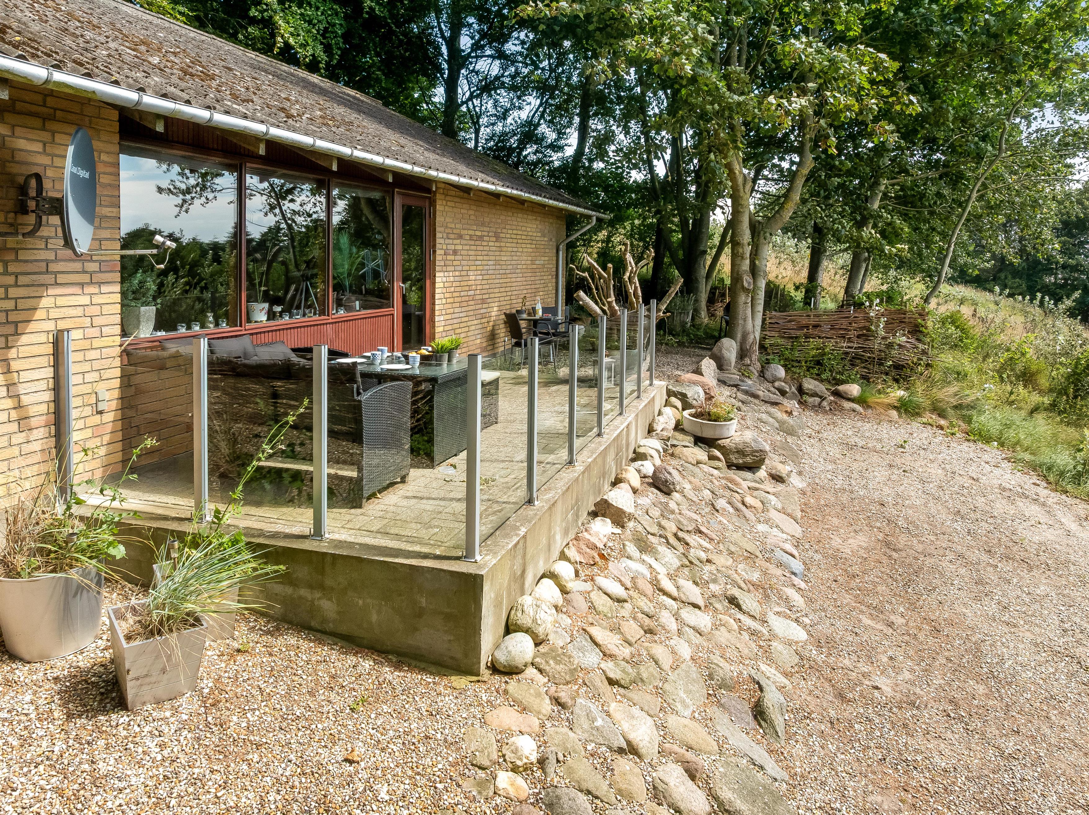 Udenfor er der en dejlig terrasse, hvor du kan nyde morgenkaffen eller grille om aftenen. Terrassen er omkranset af en dejlig naturgrund, der inkluderer et bålsted, gynger og en sandkasse til børnene - perfekt til sjov og leg. Det udendørs område er ideelt til at nyde den friske luft og den smukke natur.