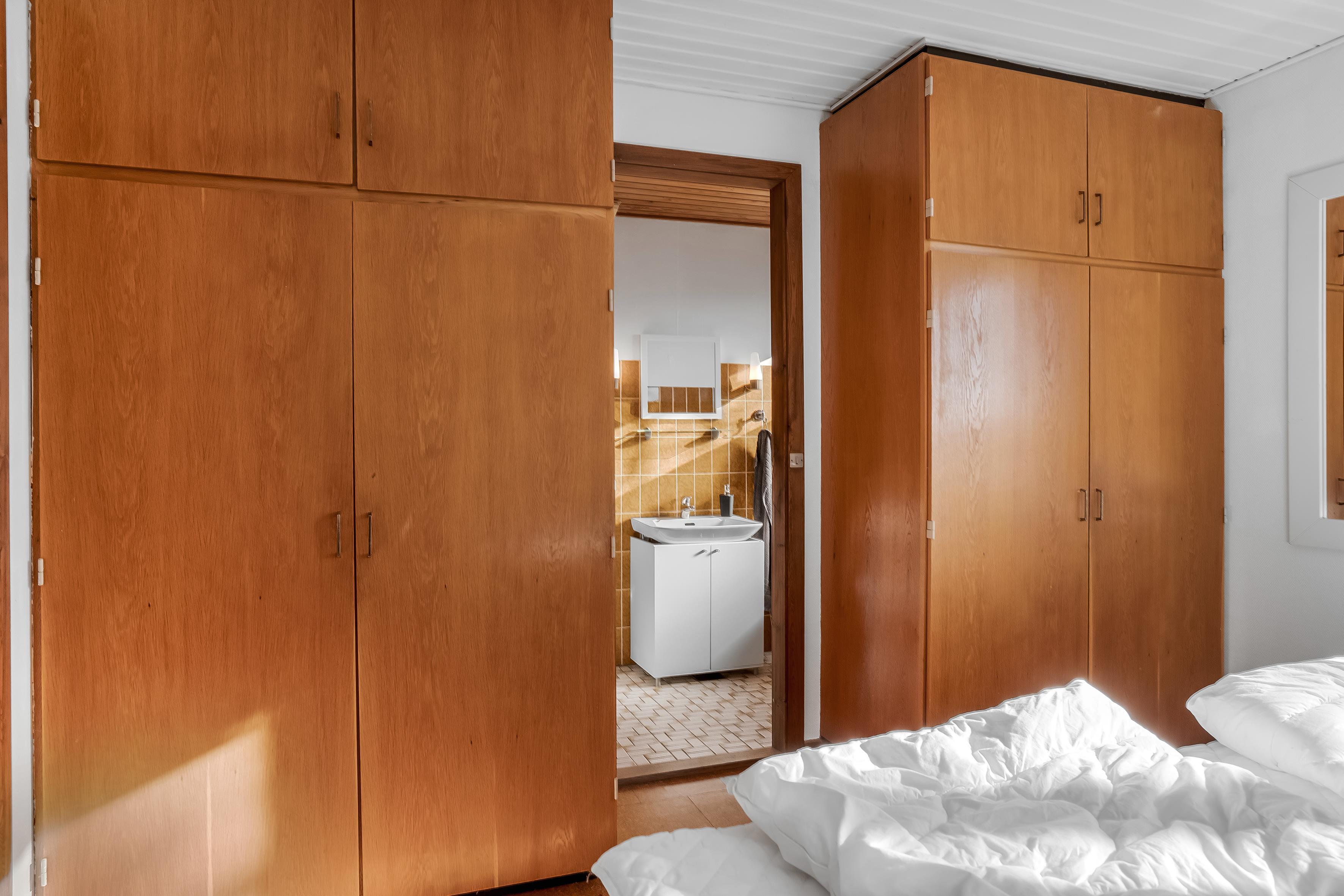 Det samlede husareal på 100 kvadratmeter er fint indrettet med to komfortable soveværelser. Det første soveværelse indeholder en dobbeltseng, mens det andet soveværelse er udstyret med to enkelt senge, hvilket giver fleksibilitet til at imødekomme forskellige behov. Huset er perfekt til en børnefamilie og tilbyder både barnestol og barneseng, så de små kan sove trygt og komfortabelt.