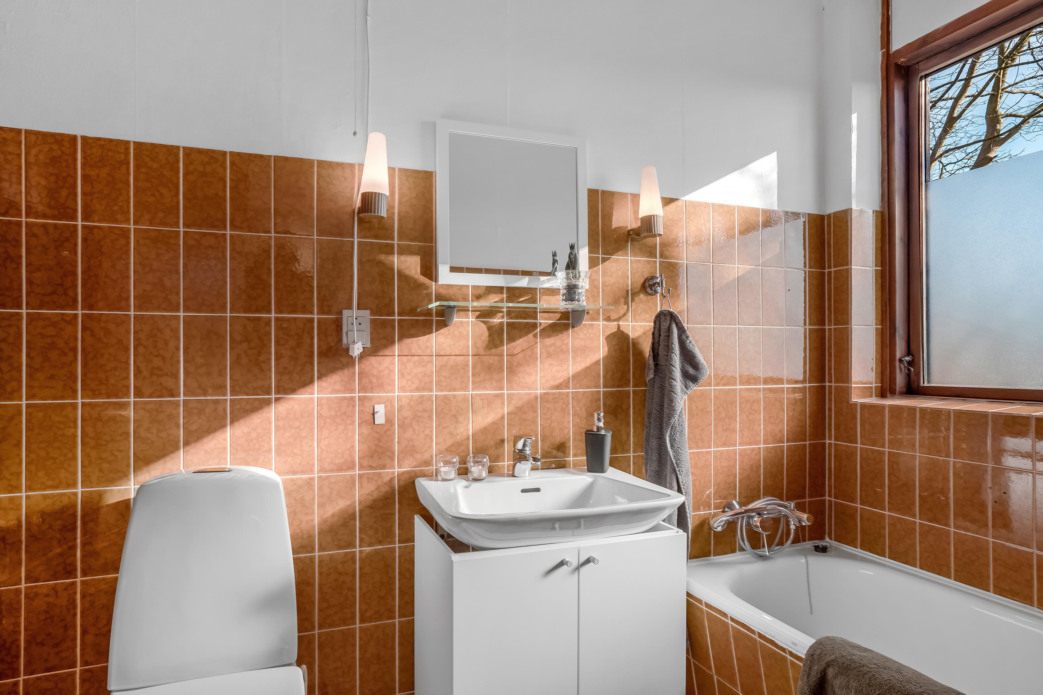 Sommerhusets badeværelse er med toilet, bruser og badekar, samt gulvvarme, hvilket sikrer en behagelig temperatur året rundt.