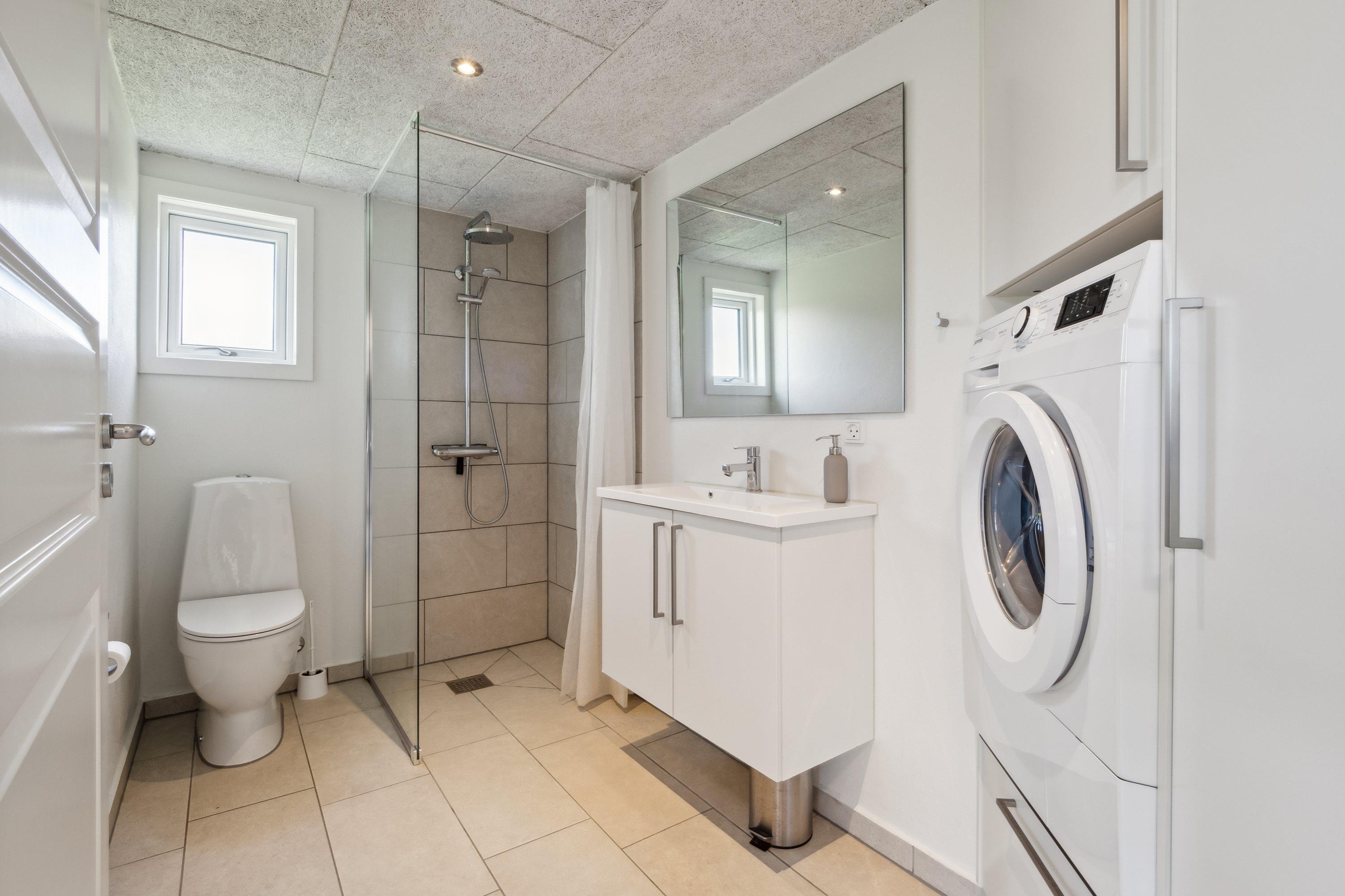 Badeværelset er komfortabelt indrettet med toilet, håndvask og bruseniche. Her er der også gulvvarme, så du kan nyde en varm bruser eller et afslappende bad. Huset er udstyret med en brændeovn, der skaber en hyggelig atmosfære, perfekt til kolde vinteraftener.