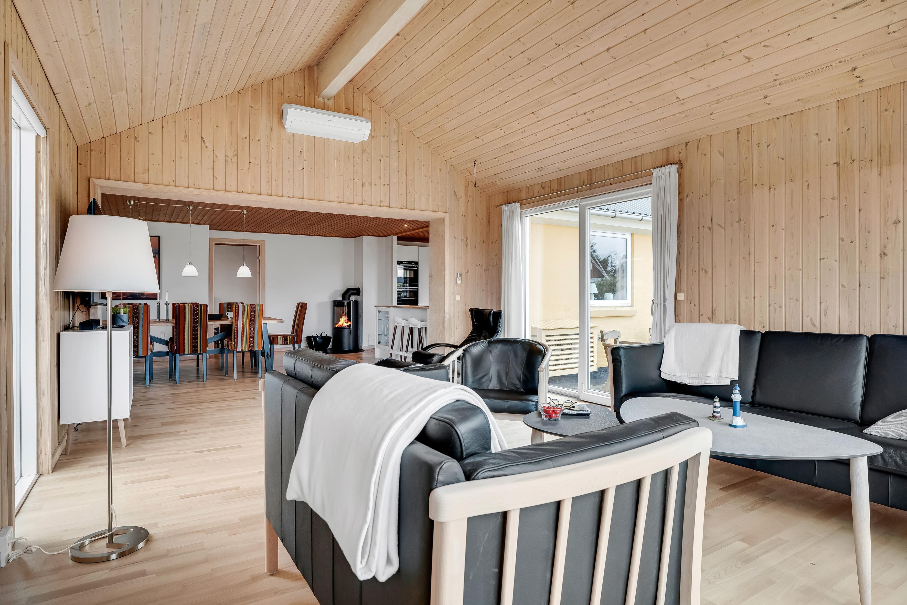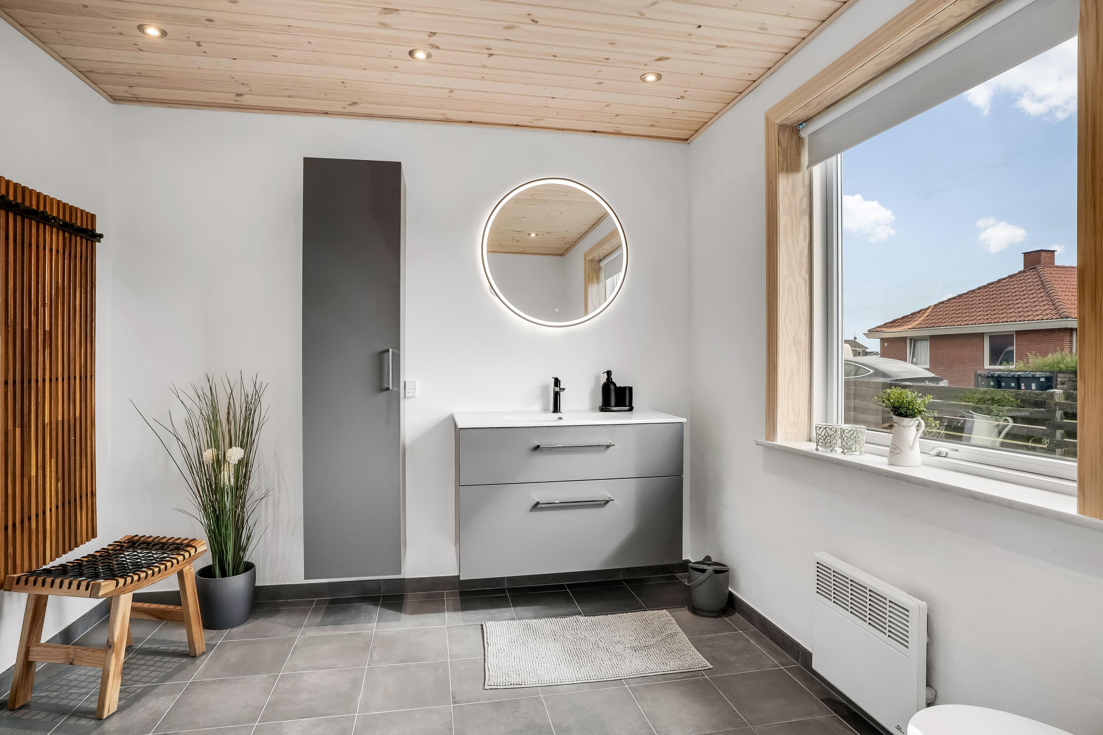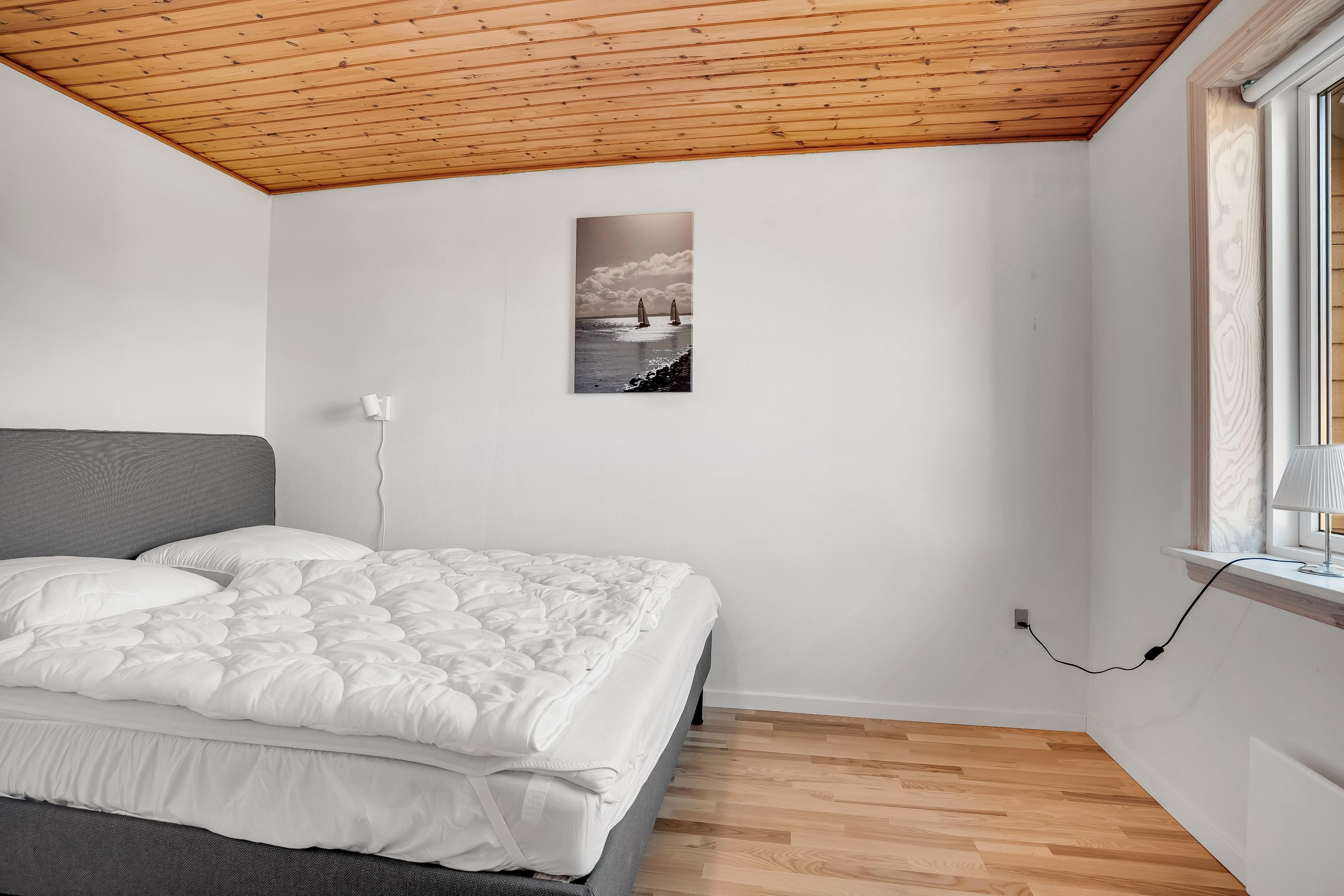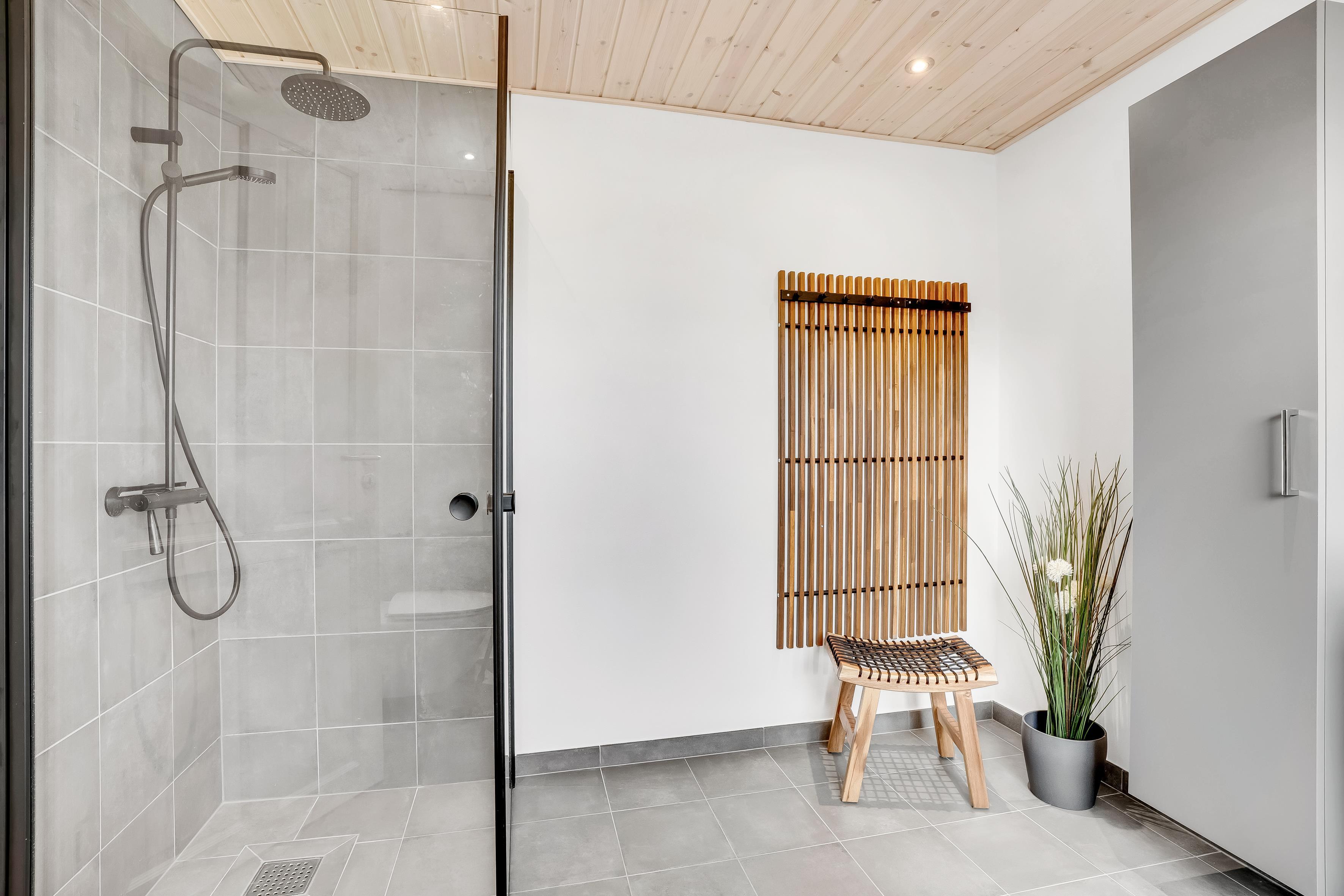 Badeværelset er udstyret med gulvvarme for ekstra komfort og har en bruser samt et toilet. Det er det perfekte sted at friske sig op efter en dag i solen eller efter en lang udendørs aktivitet. Derudover er der en energibesparende varmepumpe, der også kan fungere som aircondition, så du kan sikre et behageligt indeklima året rundt.