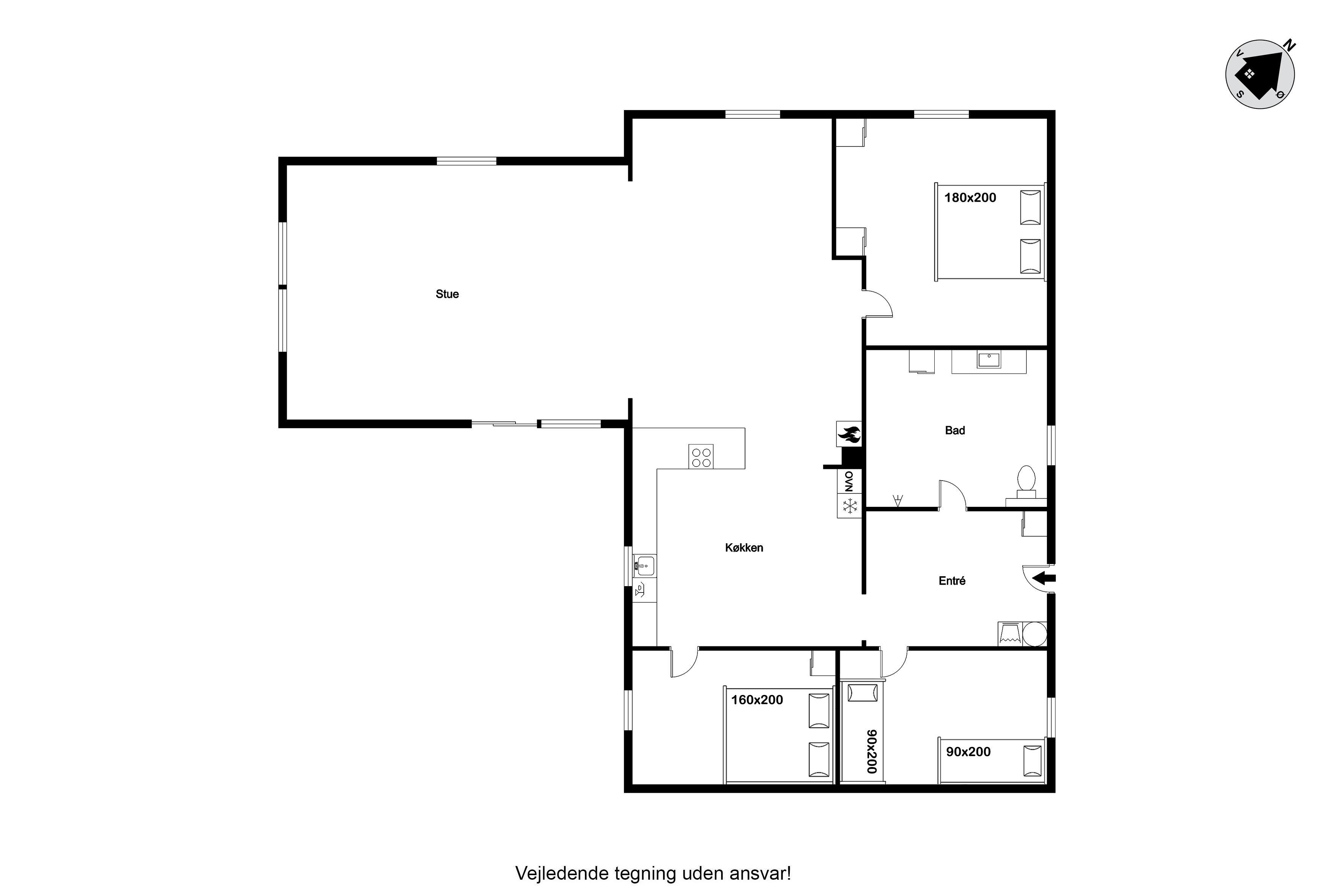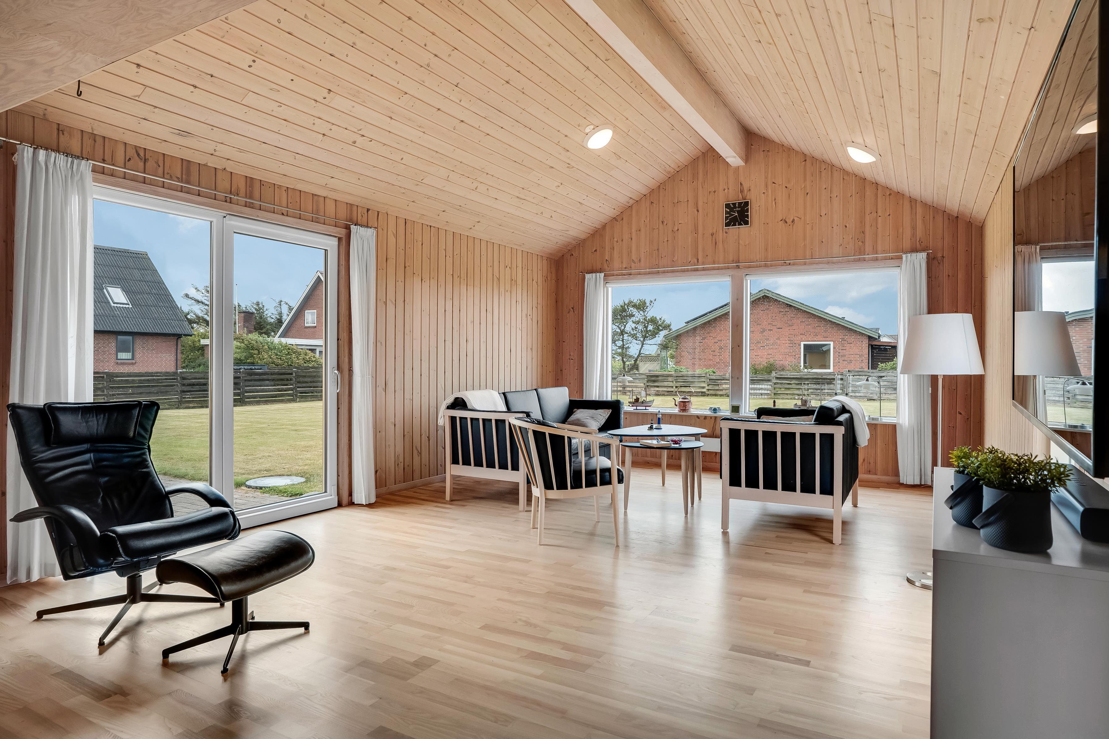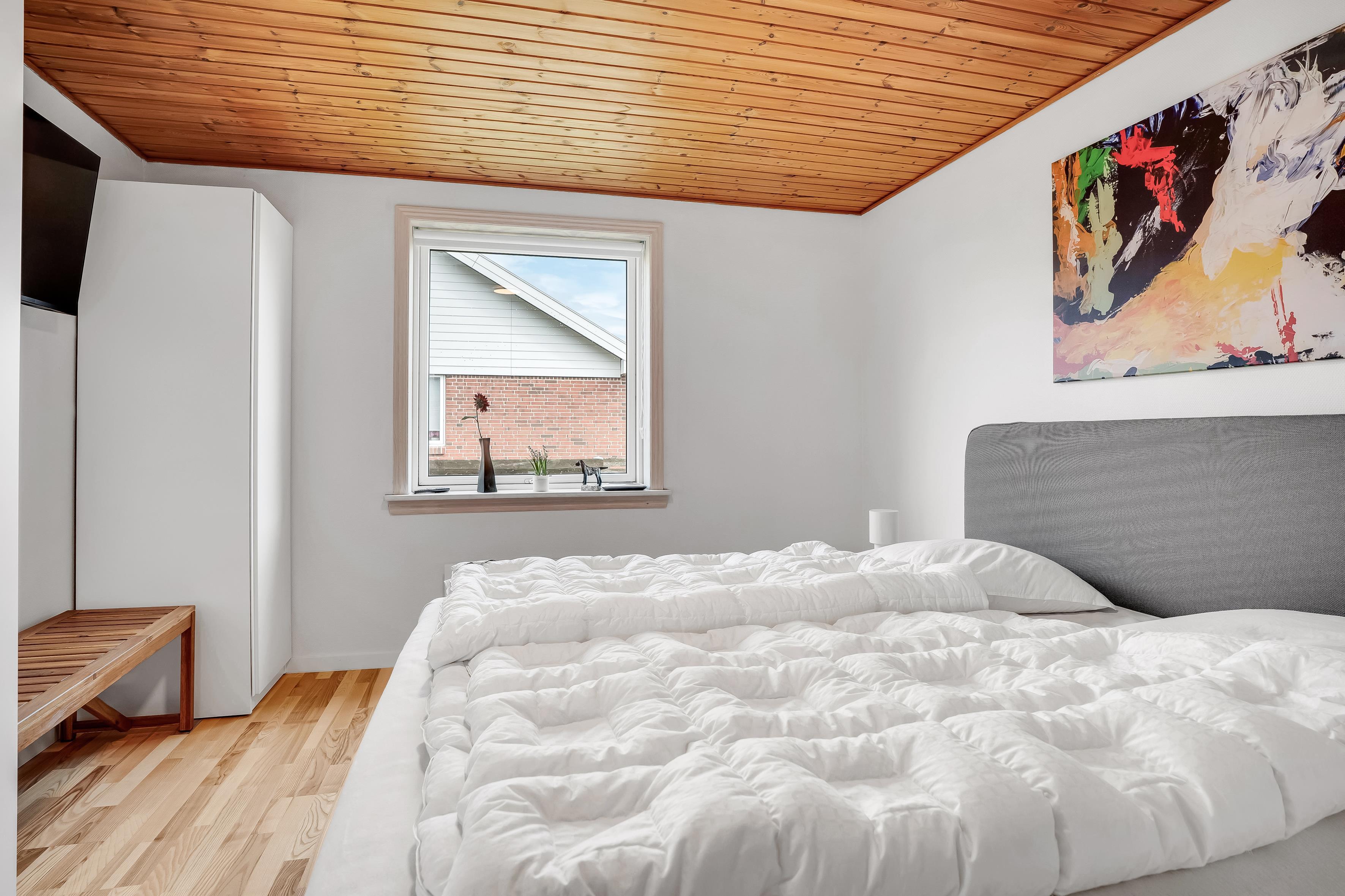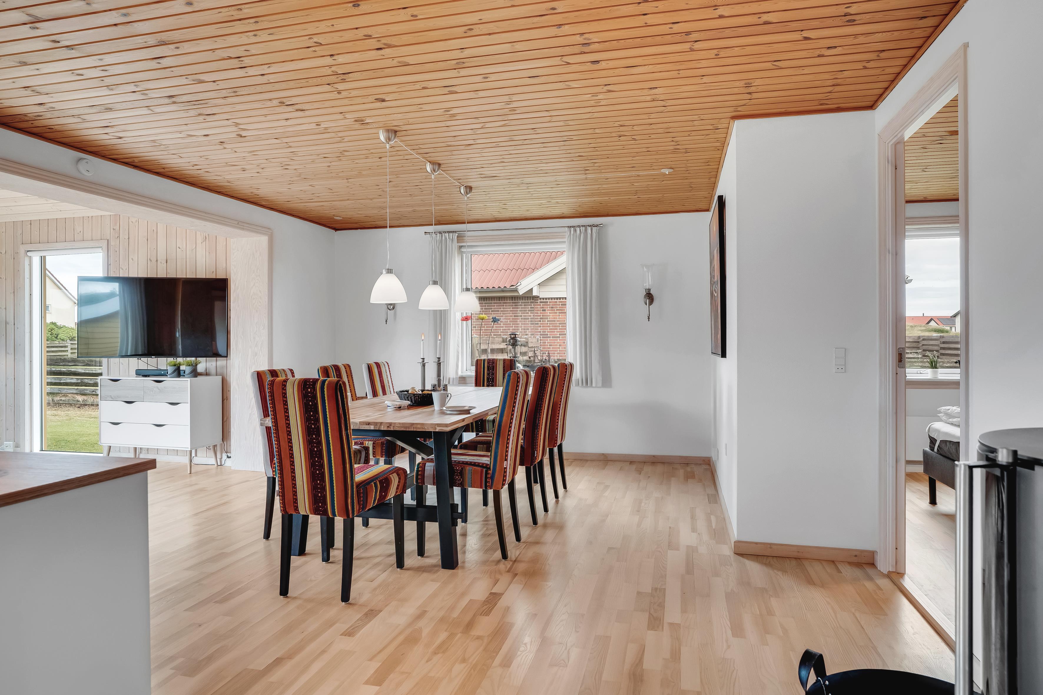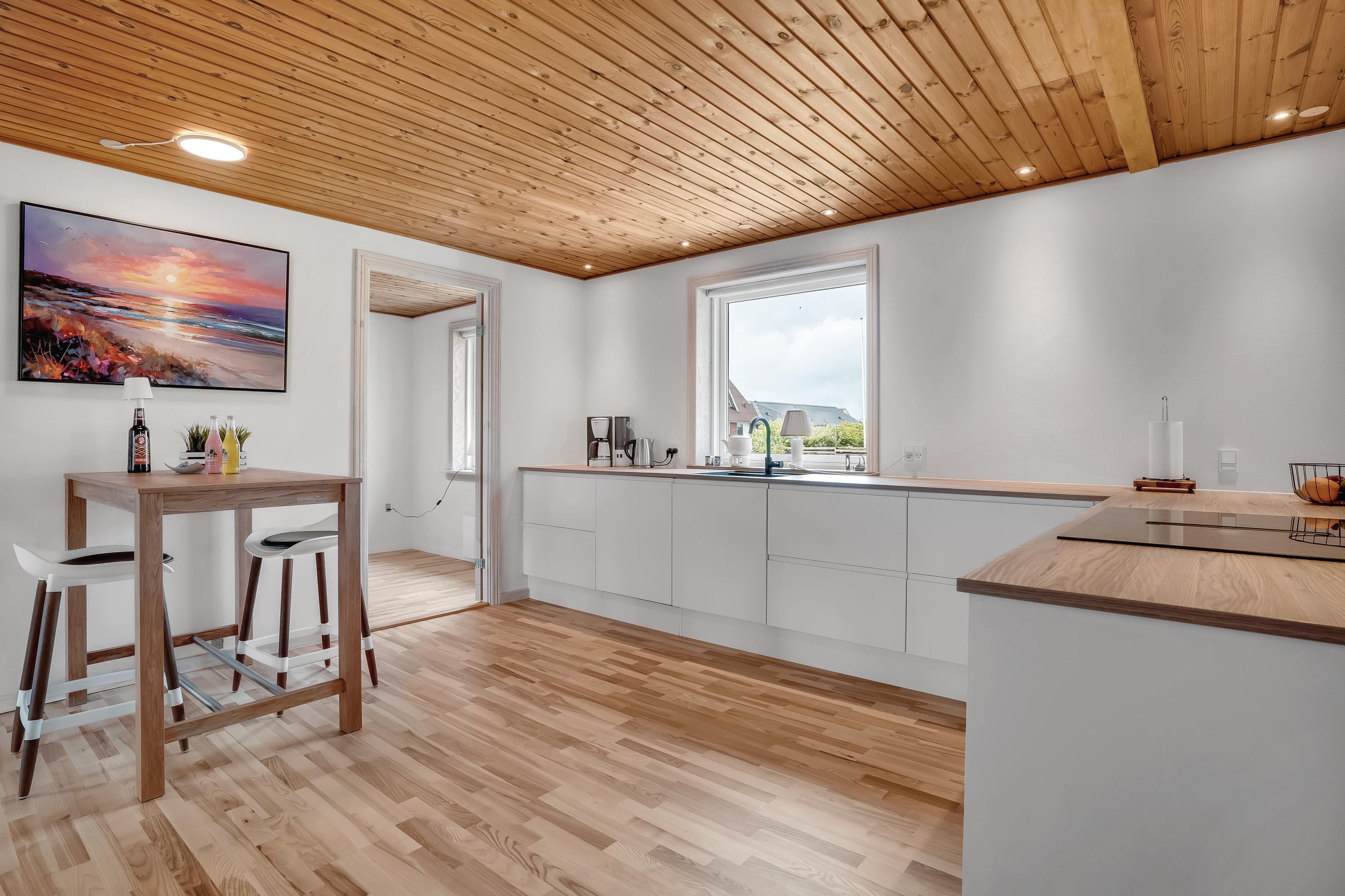 Indenfor finder du tre indbydende soveværelser, heraf to med en komfortabel dobbeltseng og et med 2 enkeltsenge, der sikrer en god nattesøvn for op til 6 gæster. De lyse og luftige rum er indrettet med moderne møbler og stilfulde detaljer, der skaber en hyggelig atmosfære. Stuen er udstyret med fjernsyn, herunder mulighed for at se både dansk og tysk TV, samt en Chromecast, så du kan streame dine yndlingsserier og film.