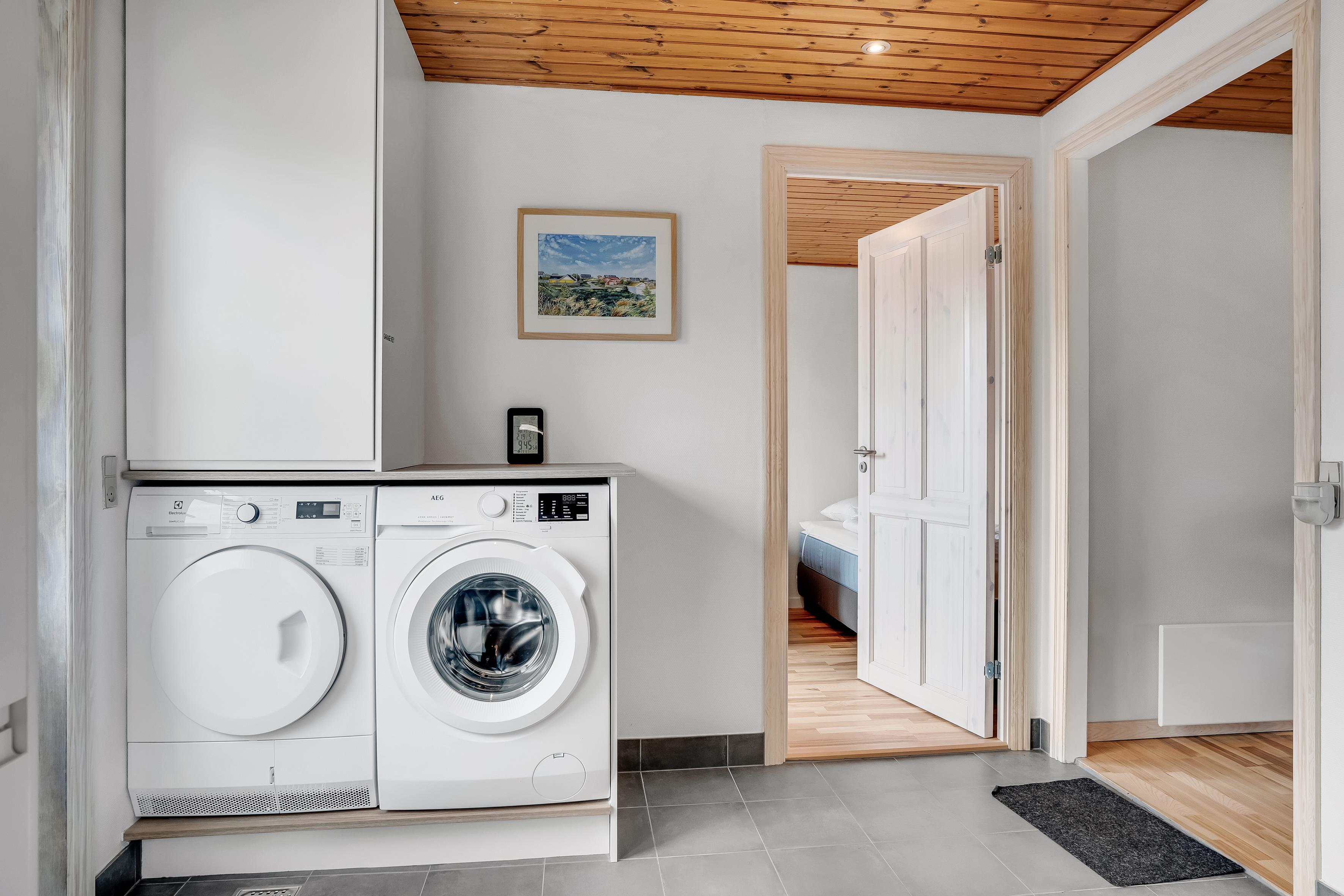 Køkkenet er fuldt udstyret med moderne apparater, herunder et induktionskomfur, ovn, mikrobølgeovn, opvaskemaskine, køleskab og fryser med en kapacitet på 50 liter. Det åbne køkken giver mulighed for socialt samvær, mens du forbereder måltider til familien. Der er også en vaskemaskine og tørretumbler til rådighed, hvilket gør det nemt at holde tøjet rent under dit ophold.