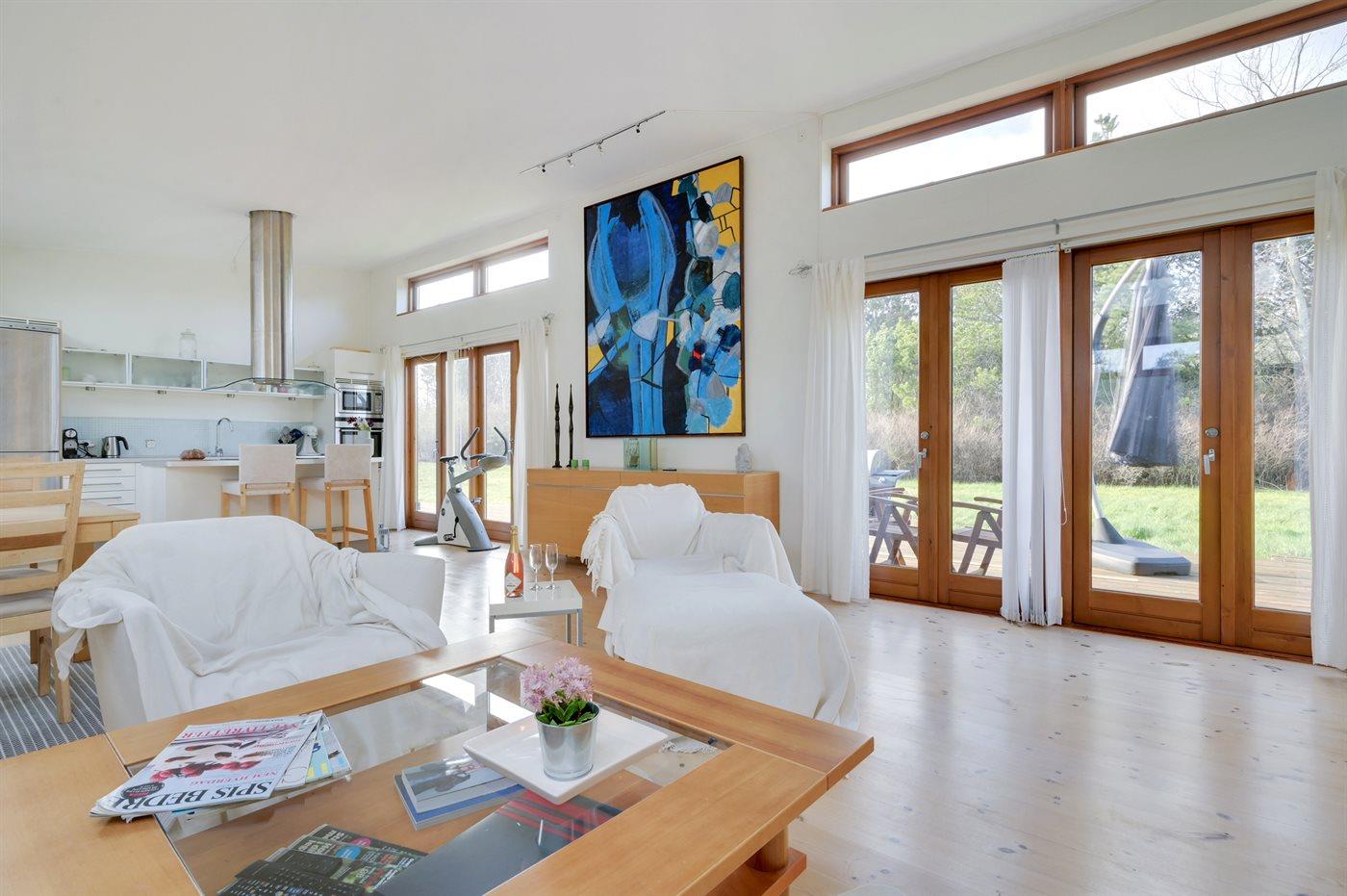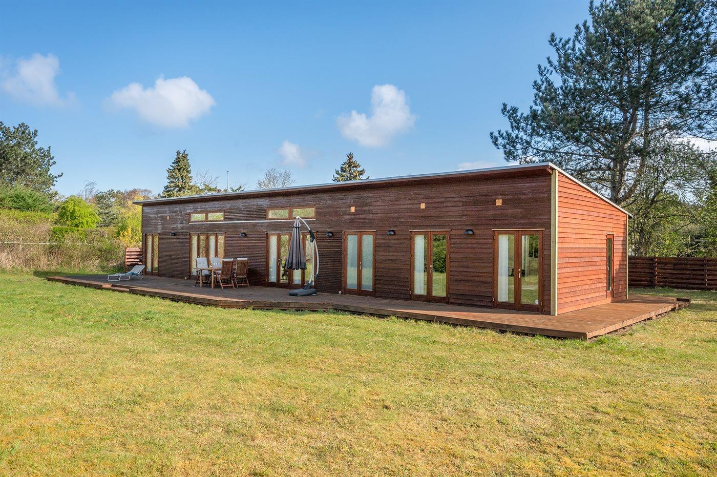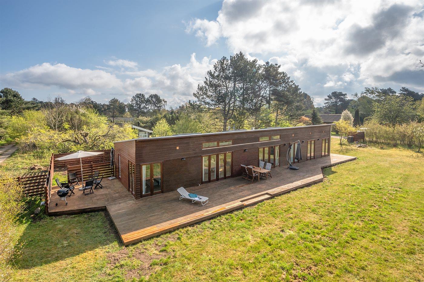 Lækkert, moderne og lyst sommerhus med udgang fra alle værelser til stor træterrasse. Huset er beliggende på en rolig vej i gåafstand til skøn badestrand.