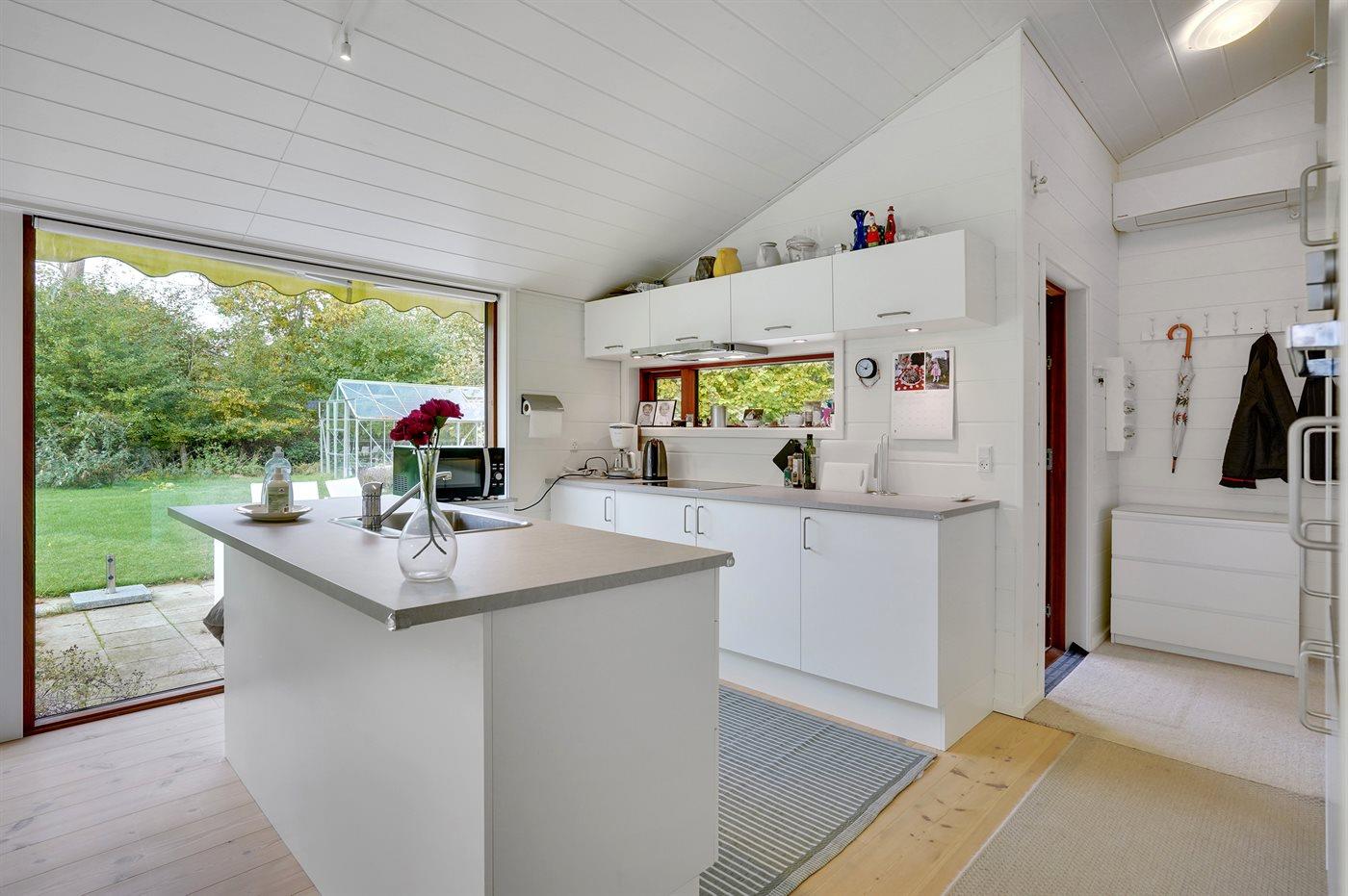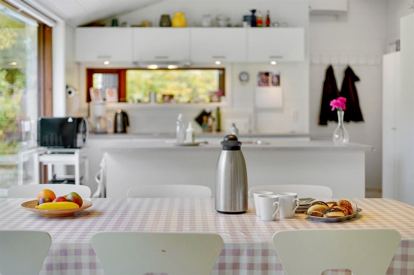 Køkkenet er udstyret med 1 køleskab. Der er 4 keramiske kogeplader, varmluftovn, mikrobølgeovn samt opvaskemaskine.