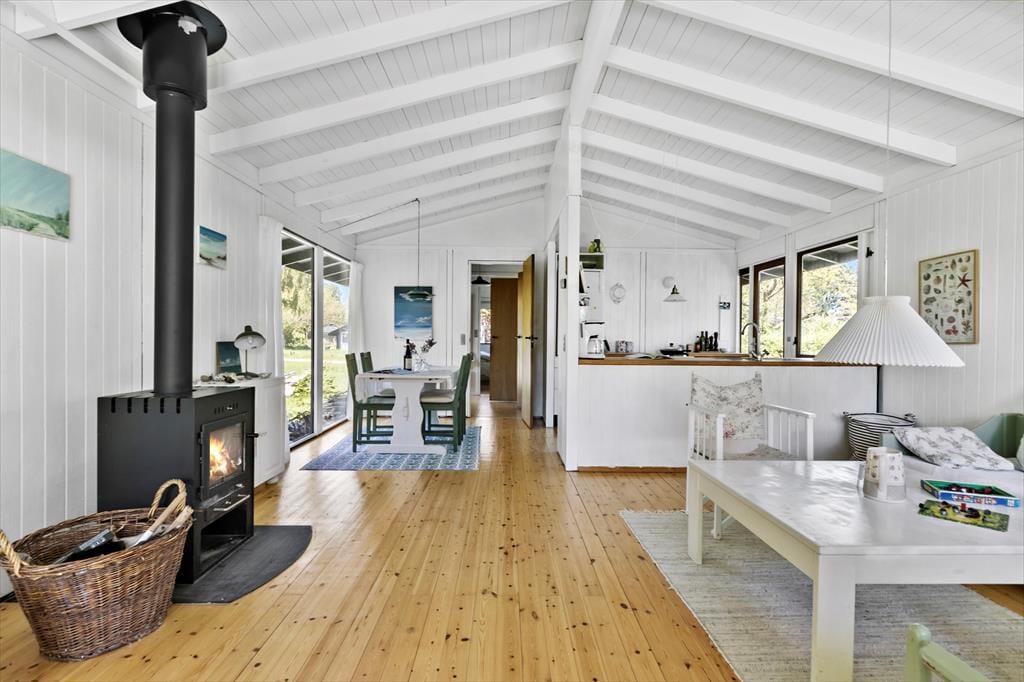 Når du træder indenfor i dette hyggelige ældre sommerhus, mødes du af en varm og indbydende atmosfære. Det åbne køkken og spisepladsen danner rammerne om fælles måltider og hyggelige stunder, hvor du kan dele dagens oplevelser. I stuen kan du lade dig synke ned i sofaen med en god bog eller samle familien til en omgang brætspil foran brændeovnens knitren. Herfra er der direkte adgang til den overdækkede terrasse, som giver mulighed for at nyde aftener i skyggen eller i lyset fra de sidste solstråler.