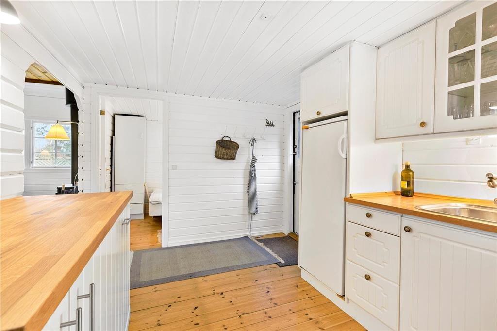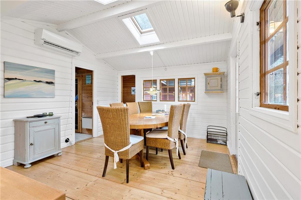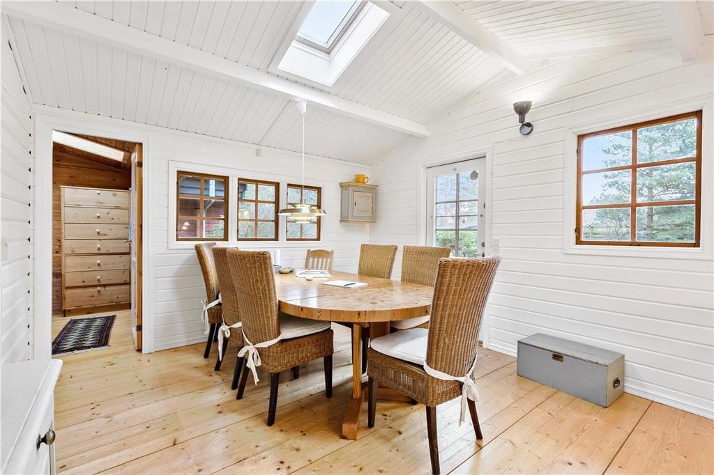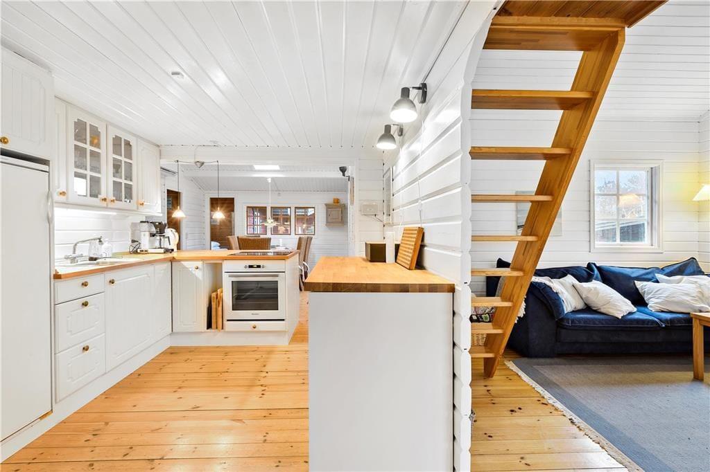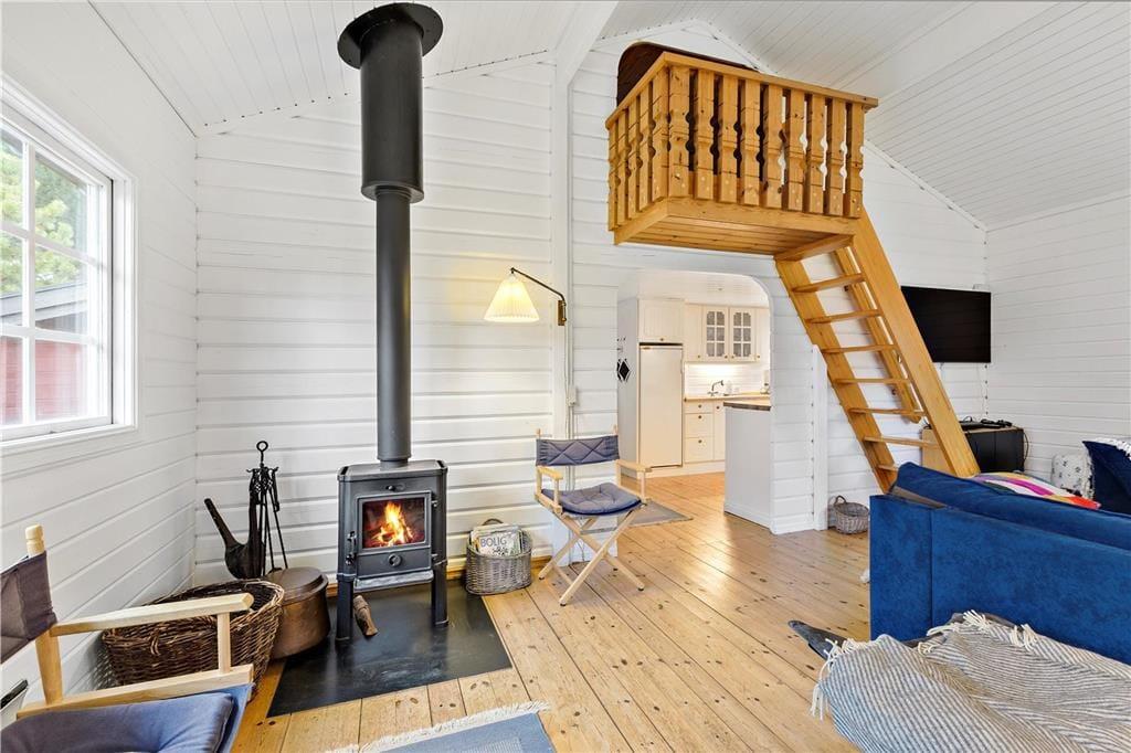 Når du træder ind i opholdsstuen, bliver du straks omfavnet af hyggen fra den knitrende brændeovn. De bløde siddepladser inviterer til afslapning med en god bog eller en varm kop te. I spisestuen, med dens charmerende spiseplads og åbne køkken, kan du nyde lange, afslappede måltider i godt selskab.