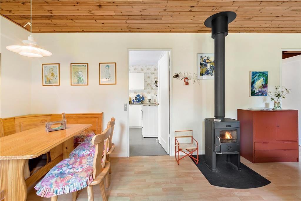 Når du træder indenfor, mødes du af en enkel og ærlig indretning, der emmer af klassisk sommerhusstemning. Køkkenet er placeret i et separat rum, hvor du kan lave måltider i ro og mag, mens spiseområdet og stuen skaber hyggelige rammer for samvær. Stuen inviterer til afslappede aftener med brætspil eller en god bog. Her er der fokus på enkelhed og funktionalitet, og de mindre vinduer giver en intim og hyggelig atmosfære.