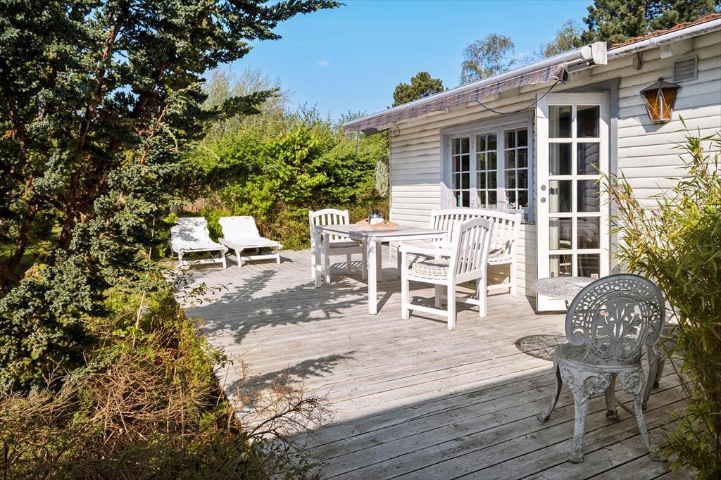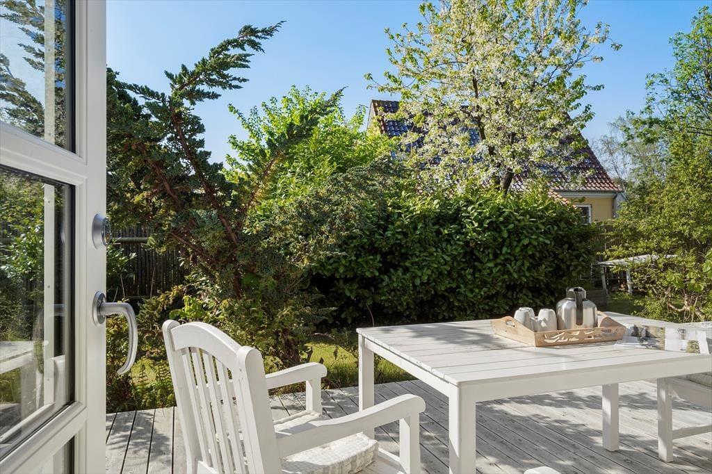 Udenfor byder sommerhuset på en skøn terrasse med havemøbler og grill – perfekt til lange sommeraftener med god mad og hyggeligt samvær. Haven har flere hyggelige kroge, hvor du kan nyde solen eller finde skygge på varme dage. Her er rigelig plads til leg og aktiviteter for både store og små, hvad enten det er boldspil på plænen eller en rolig stund med en bog i det fri.