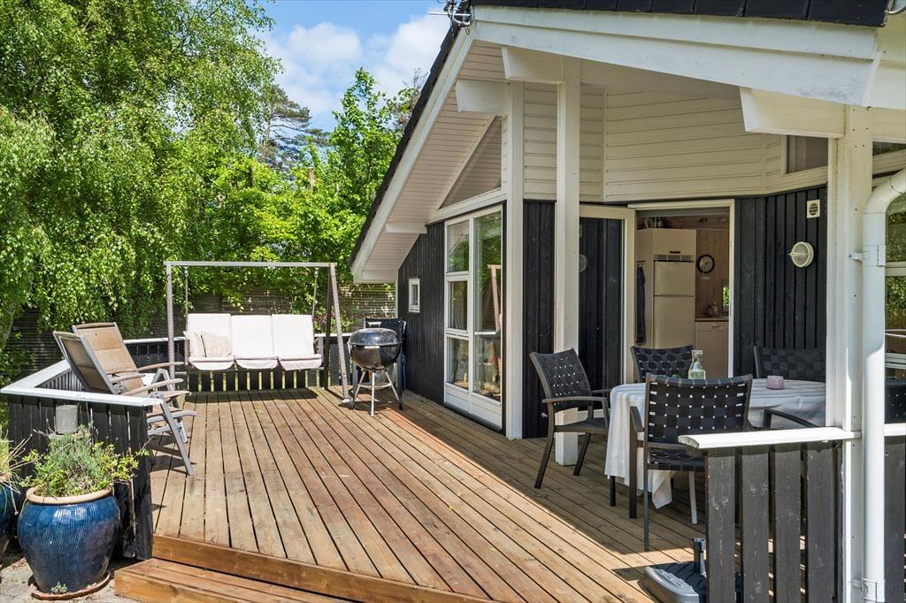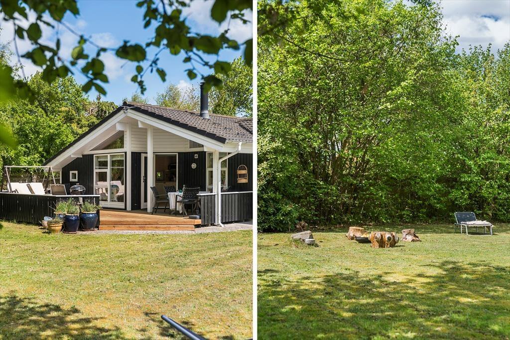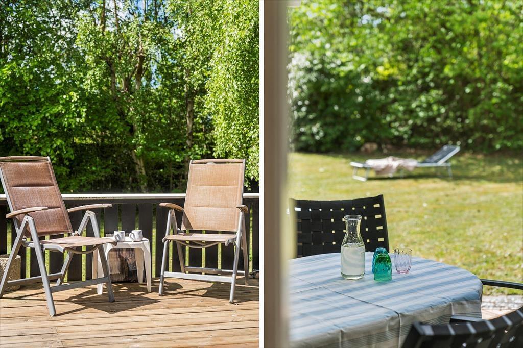 Den skønne træterrasse er delvist overdækket, så du både kan nyde solen og finde skygge på varme dage. Terrassen er oplagt til morgenkaffe i ro og mag eller lange grillaftener med familien. Haven byder på flere små hyggelige kroge, hvor du kan slappe af i solen eller finde et roligt sted med en god bog.