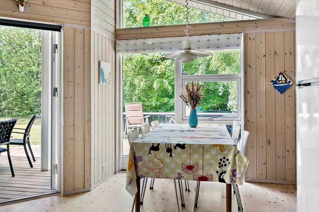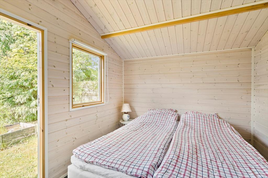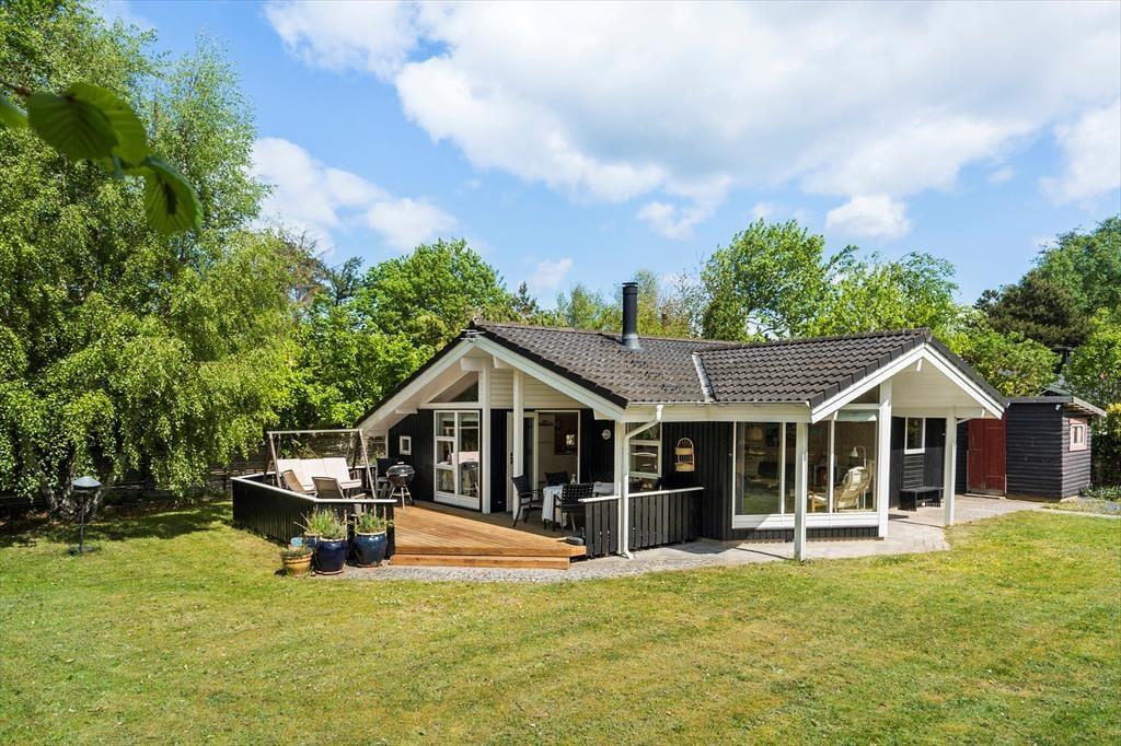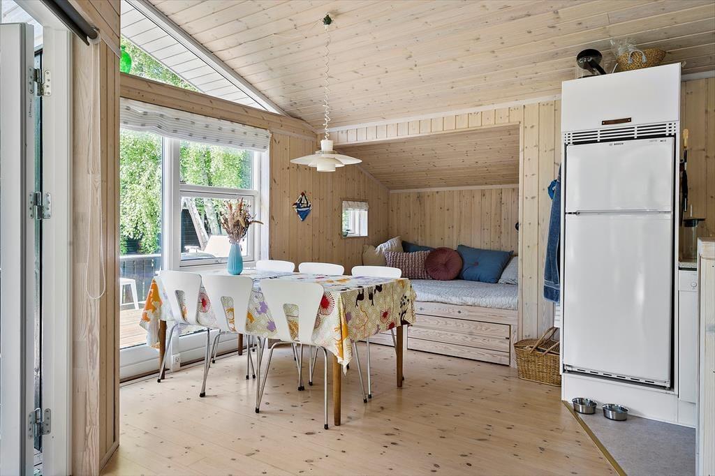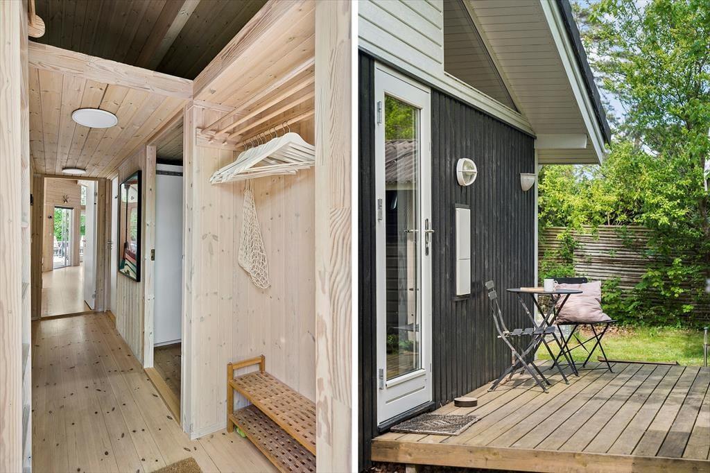 Den hyggelige indretning skaber en varm og indbydende atmosfære, hvor hele familien kan finde ro. Sommerhuset har desuden en hems, som giver ekstra sovepladser og mulighed for en sjov soveoplevelse for de yngste. De store vinduer i opholdsrummet lader lyset strømme ind og skaber en skøn forbindelse til haven, og herfra er der direkte udgang til den dejlige træterrasse.