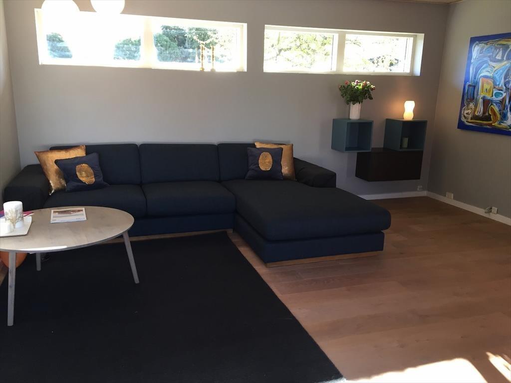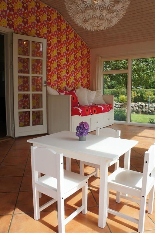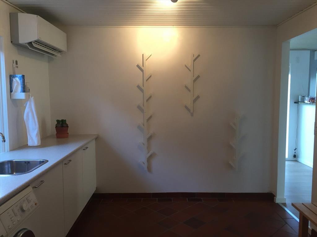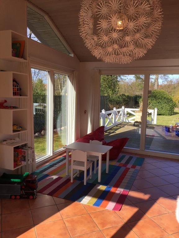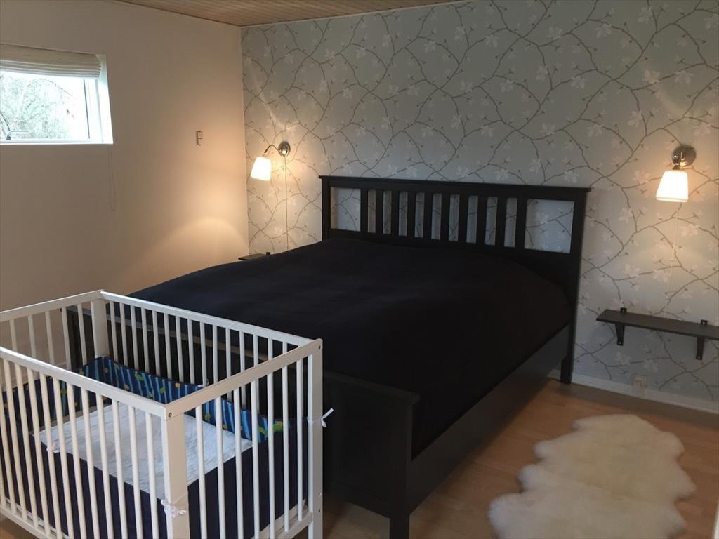 Husets store soveværelse har direkte adgang til badeværelset, hvilket gør det ekstra bekvemt. Der findes også et gæstetoilet for at sikre komfort for alle. Et af husets smukkeste rum, med højt til loftet og store vinduer på alle fire sider, åbner via en fransk dør direkte ud til haven. Dette rum er indrettet med en enkeltseng, som kan trækkes ud til en dobbeltseng, hvilket giver fleksible overnatningsmuligheder og et lyst og luftigt miljø at vågne op til hver morgen. I tillæg til de to dobbeltsenge er der en ekstra sammenklappelig voksenseng og en juniorseng (70x160 cm). Begge senge er på hjul og kan flyttes, hvilket giver ekstra fleksibilitet for familier med forskellige behov.