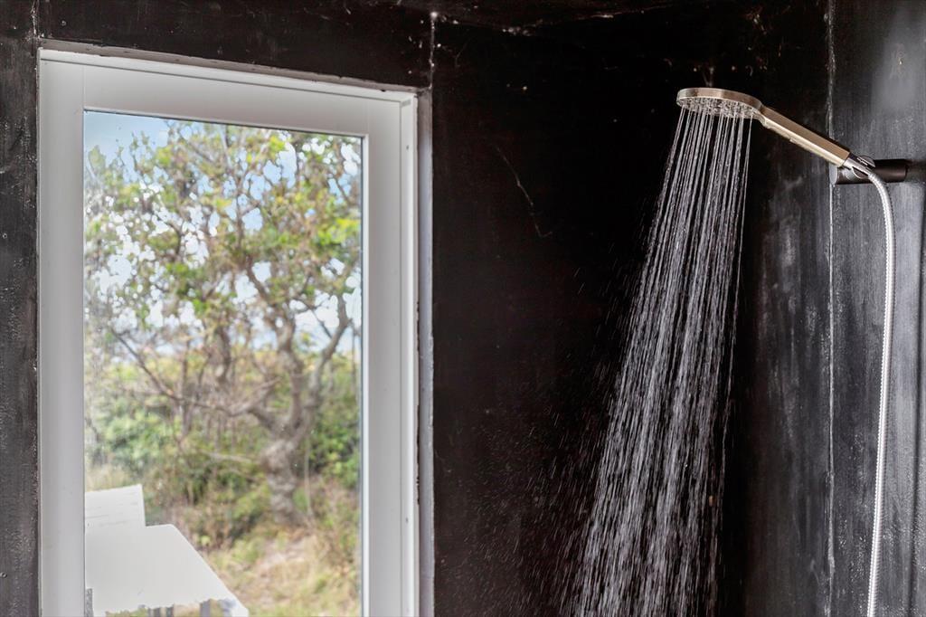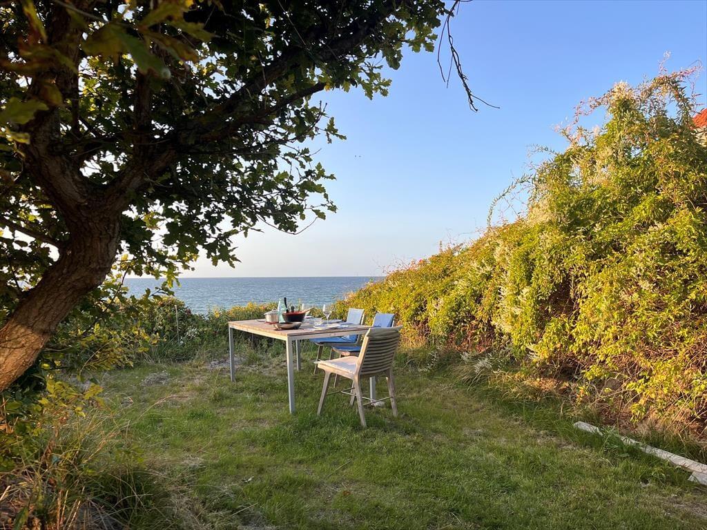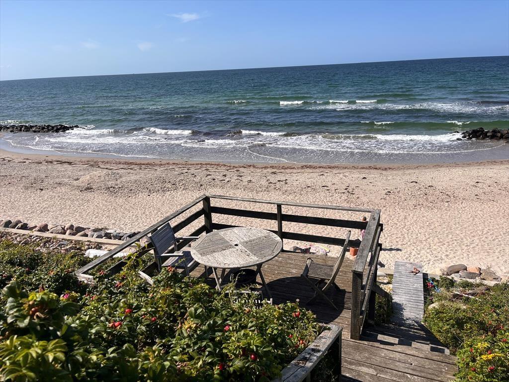 Fra haven fører en privat strandtrappe direkte ned til Kattegat – og undervejs findes en lille privat terrasse halvvejs ned, hvor I kan nyde udsigten i ro og mag. Trappen er ikke lang, men oplevelsen er stor. Et udendørs brusebad giver jer mulighed for at skylle salt og sand af efter en dukkert – eller bare nyde en forfriskning under åben himmel.