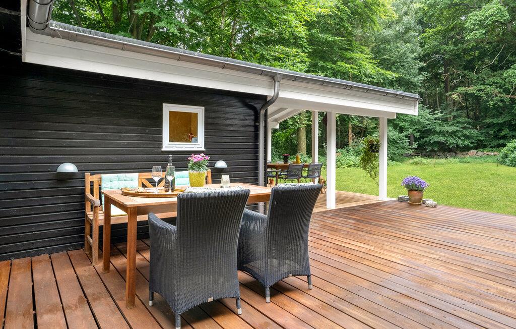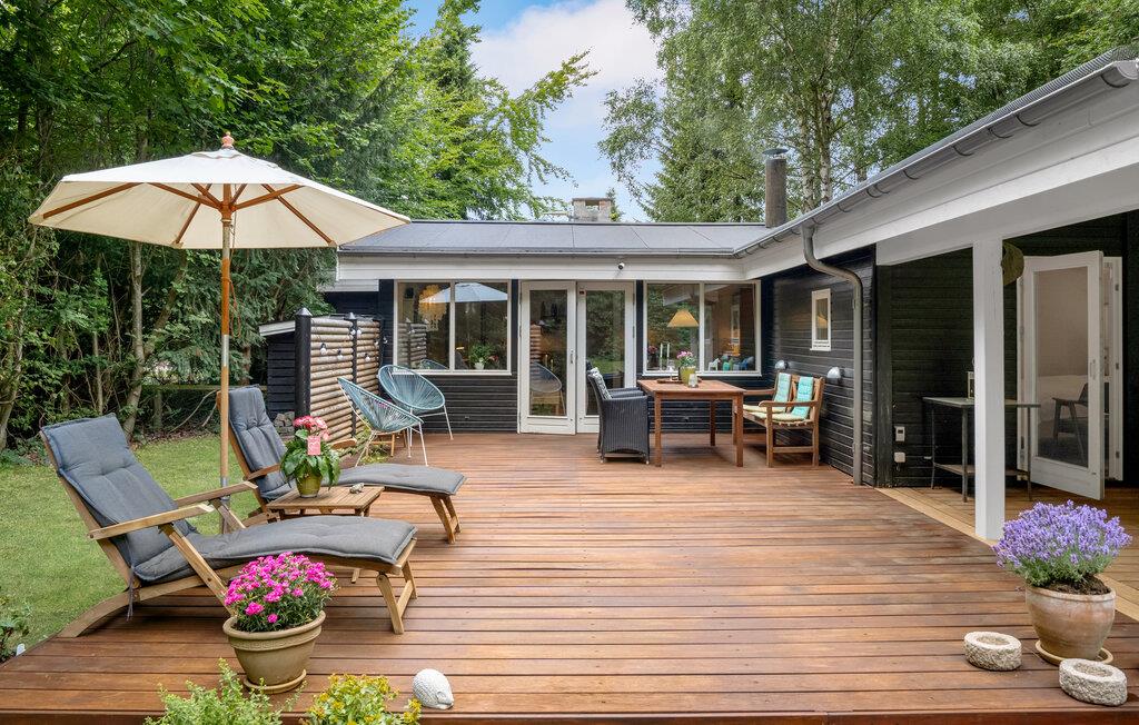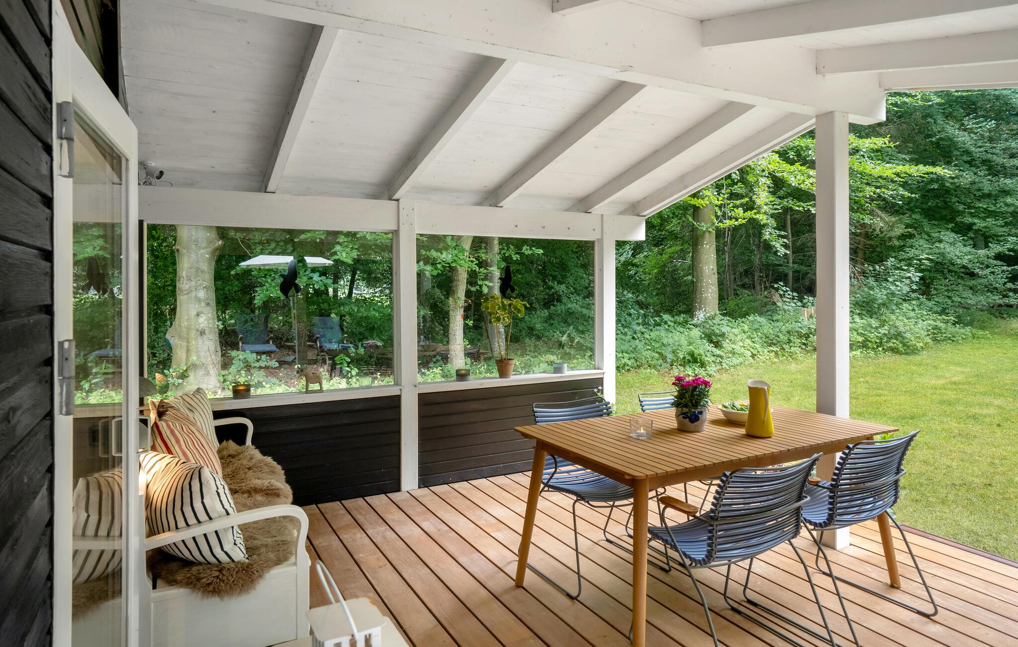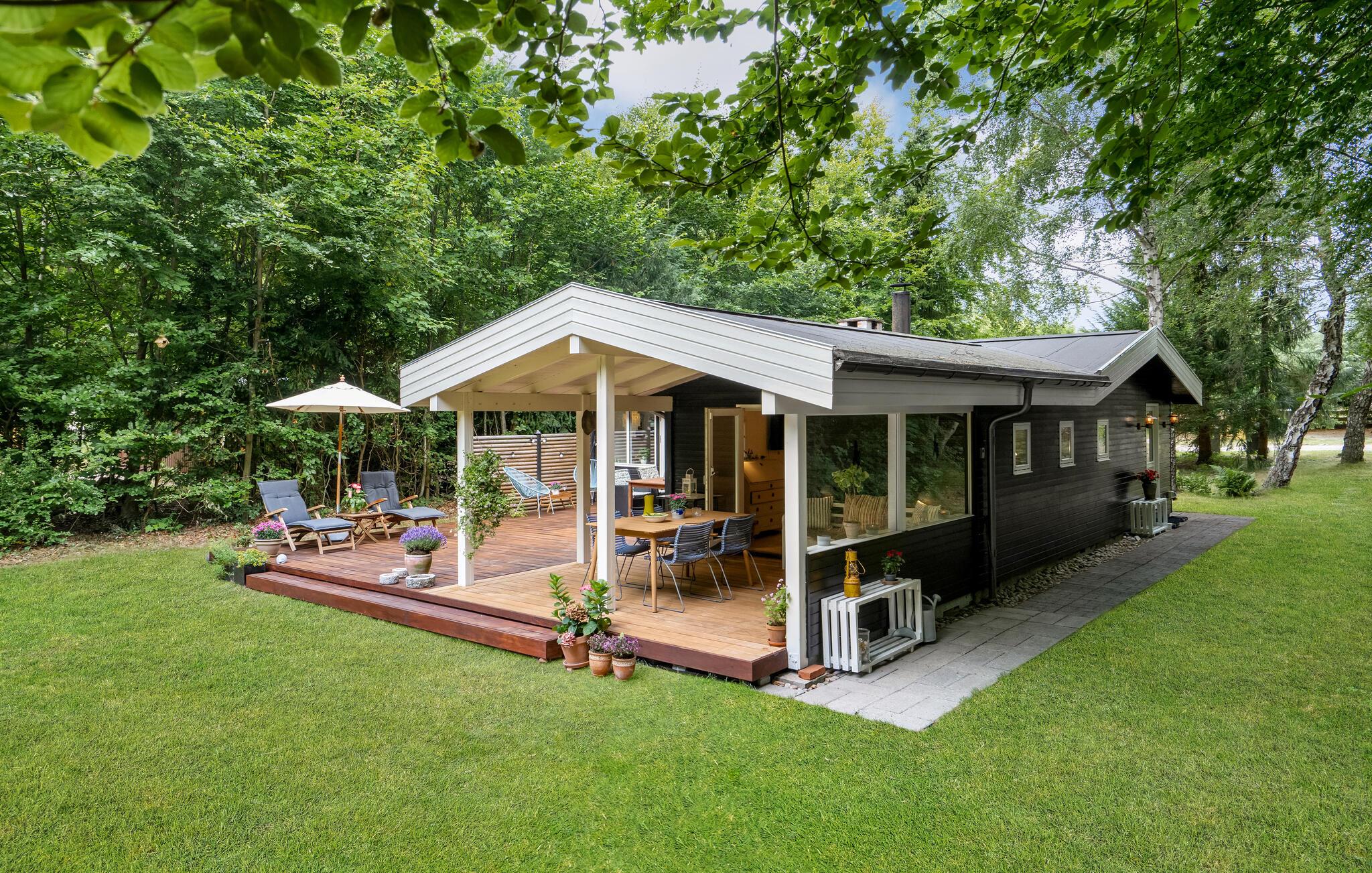 Stilfuldt feriehus i Liseleje med brændeovn, stor terrasse og natur tæt på strand og skov.