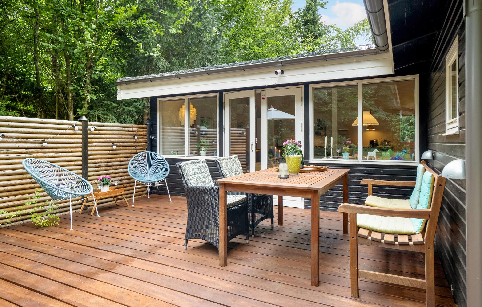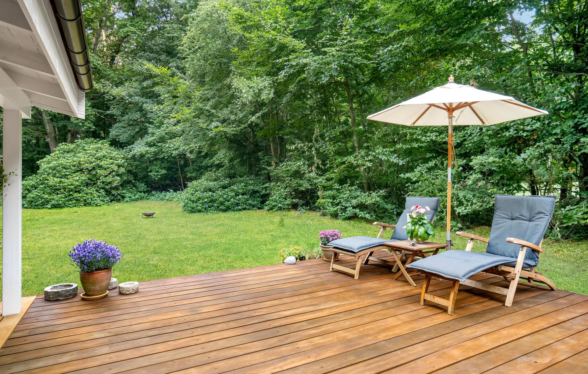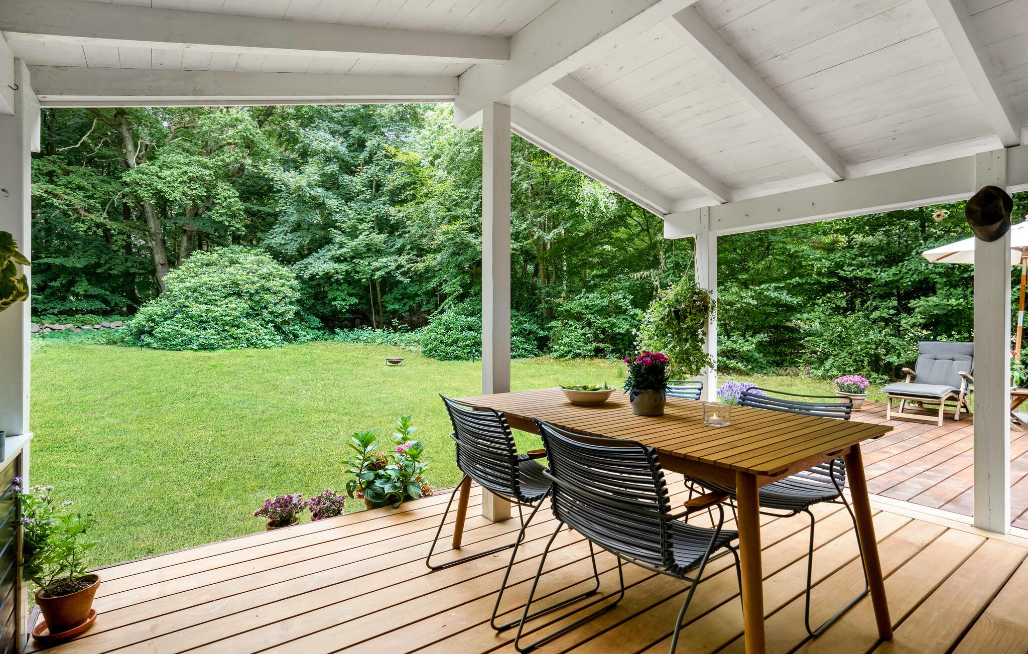 Den store træterrasse er en vidunderlig oase og indbyder til mange afslappende timer i det fri. Slå jer ned i de stilfulde havemøbler og nyd en kold forfriskning, mens I ser børnene lege.