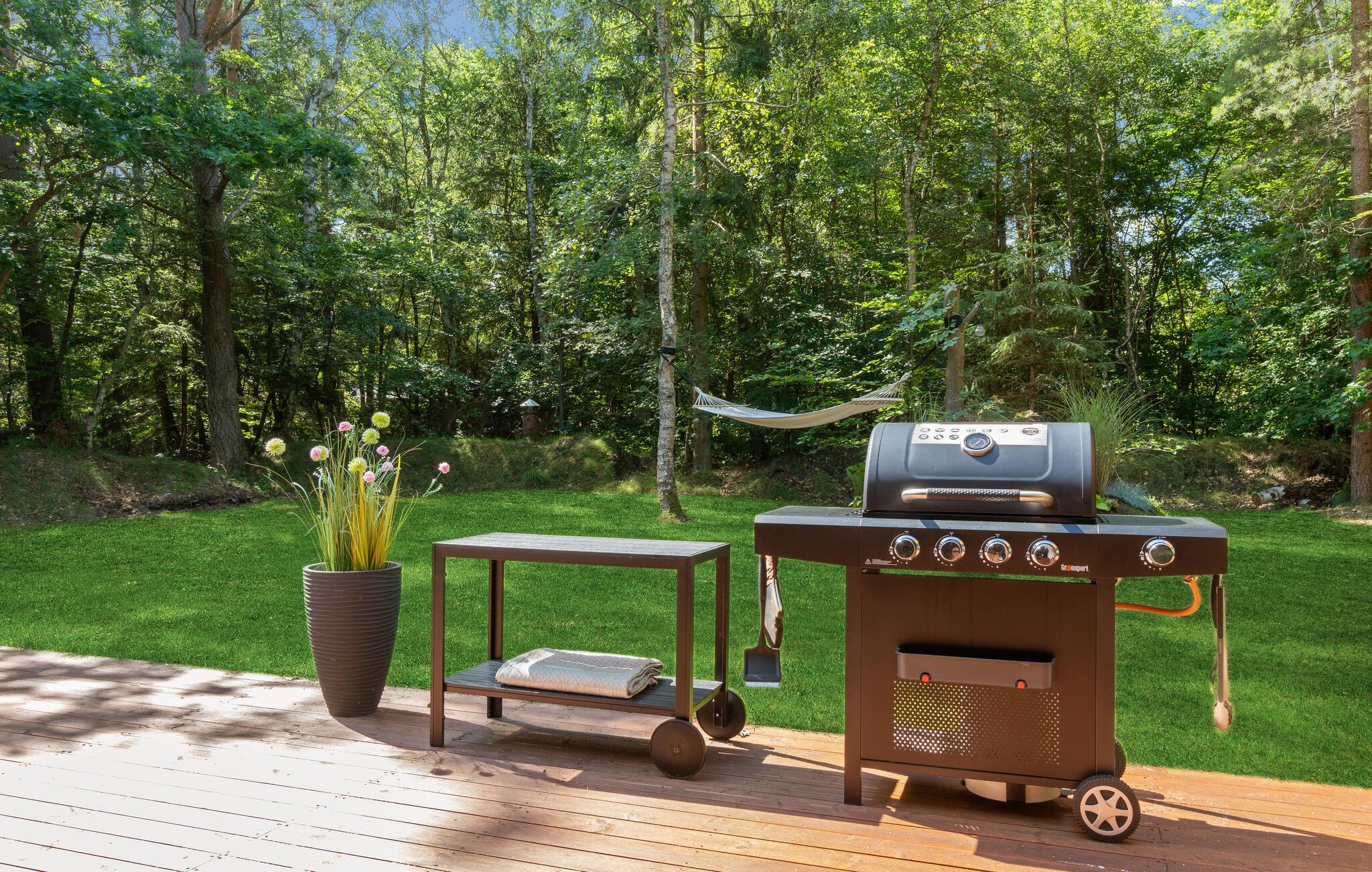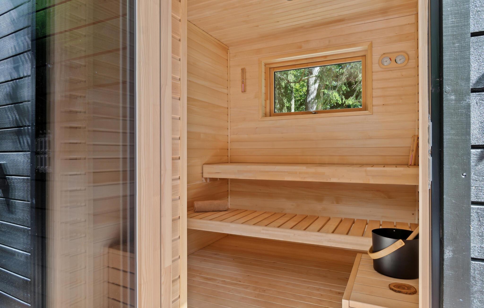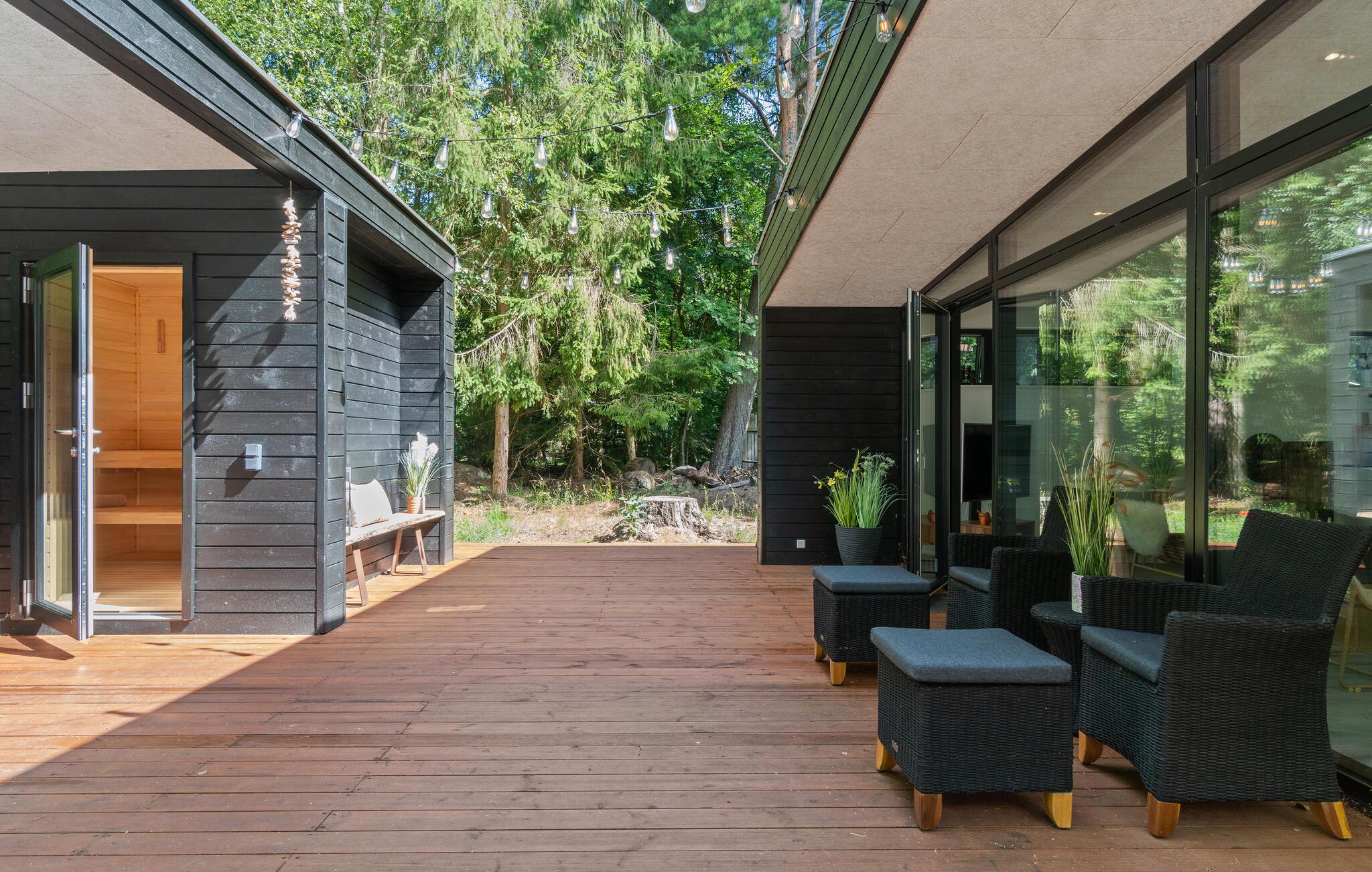 På sommerdagene kan I nyde solen på terrassen og servere dagens måltider udendørs. Som en ekstra luksus er der også et udendørs spabad, så her kan I mærke kombinationen af det varme og vand og den friske luft. Efter en lang gåtur i området er det herligt at få varmen i husets sauna.