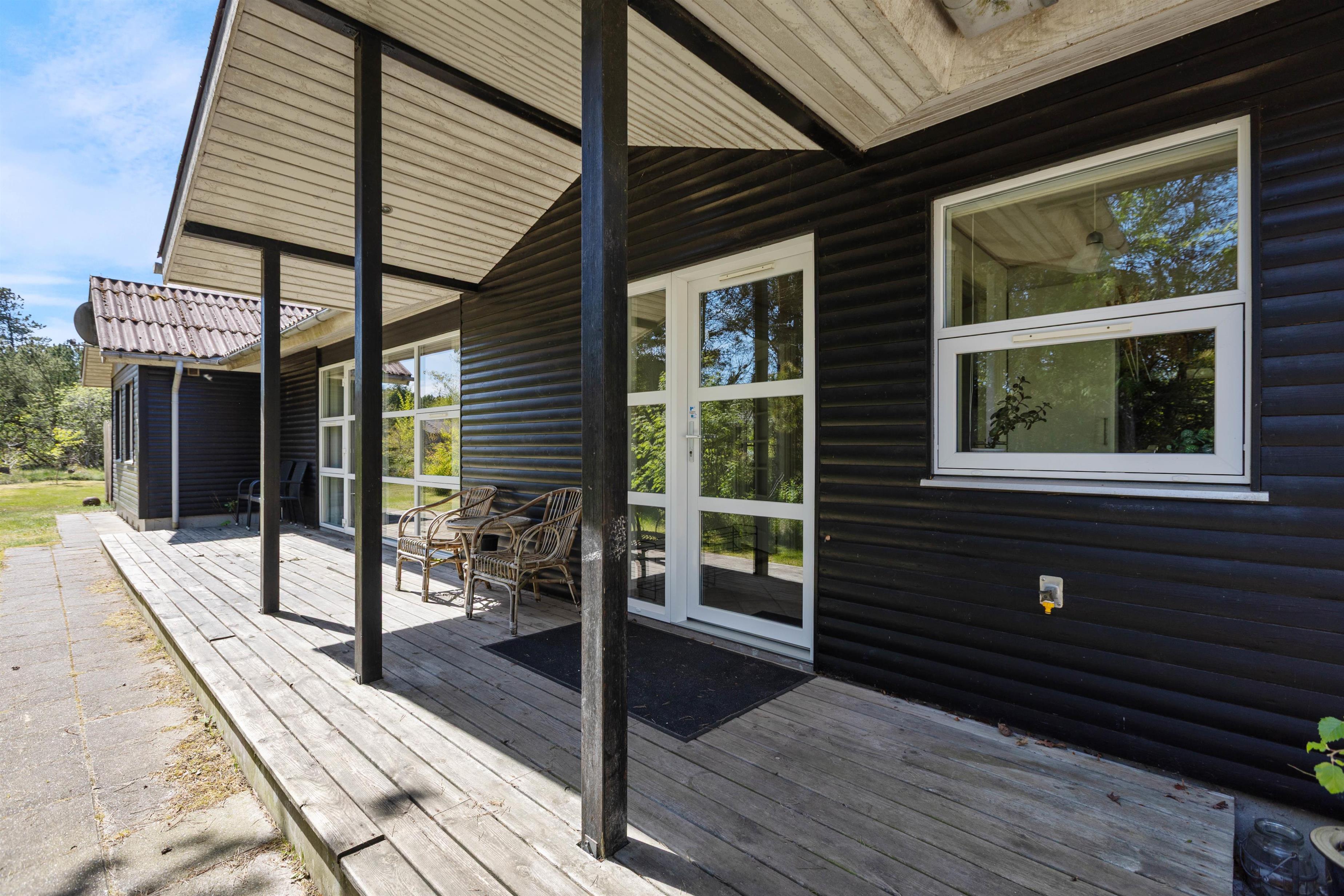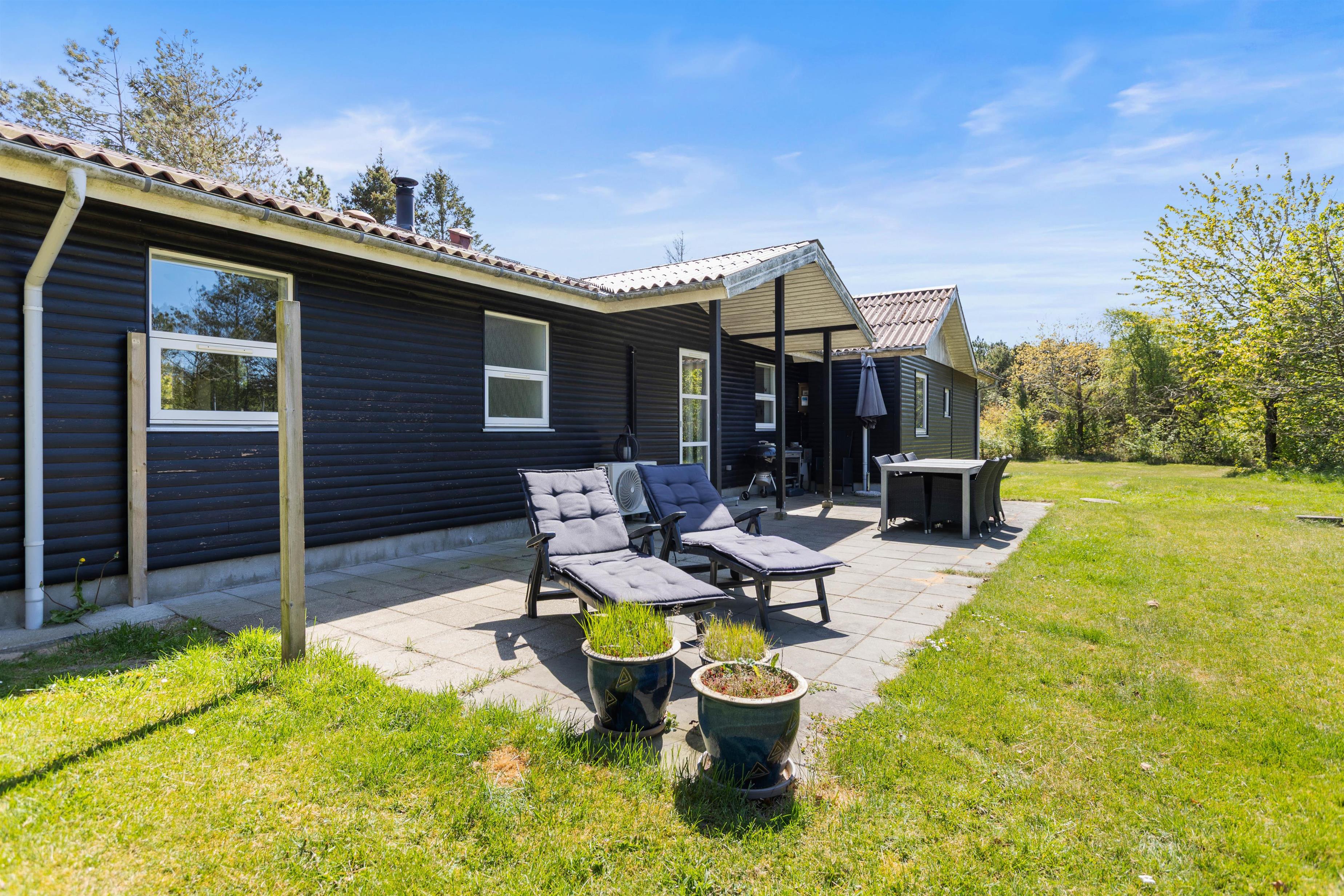 Rundt om sommerhuset finder du flere skønne terrasser, så der altid er et læfyldt hjørne – uanset om du vil nyde morgenmaden i skyggen eller slappe af i solen på en liggestol. Her er der plads til afslapning dagen lang.
