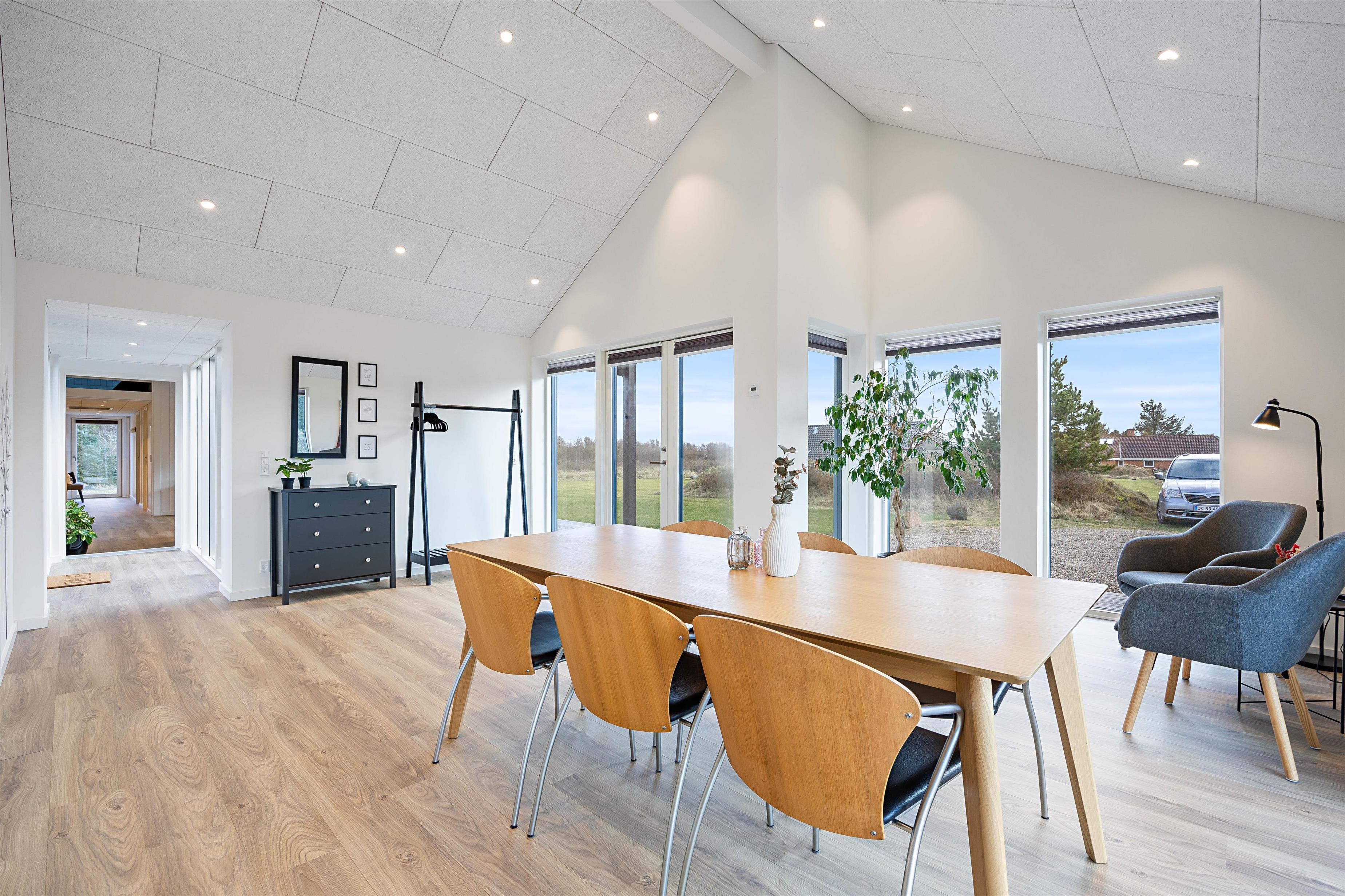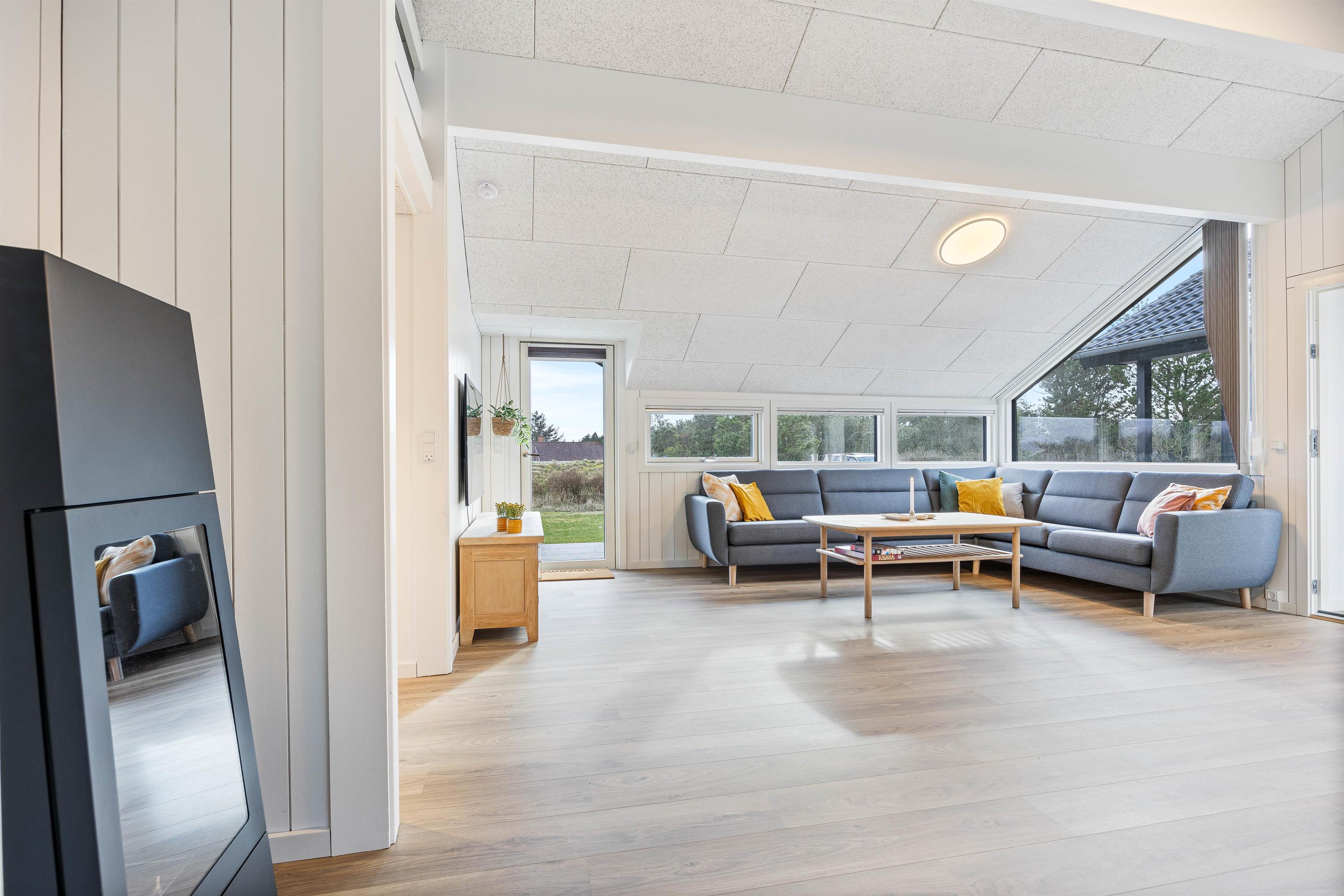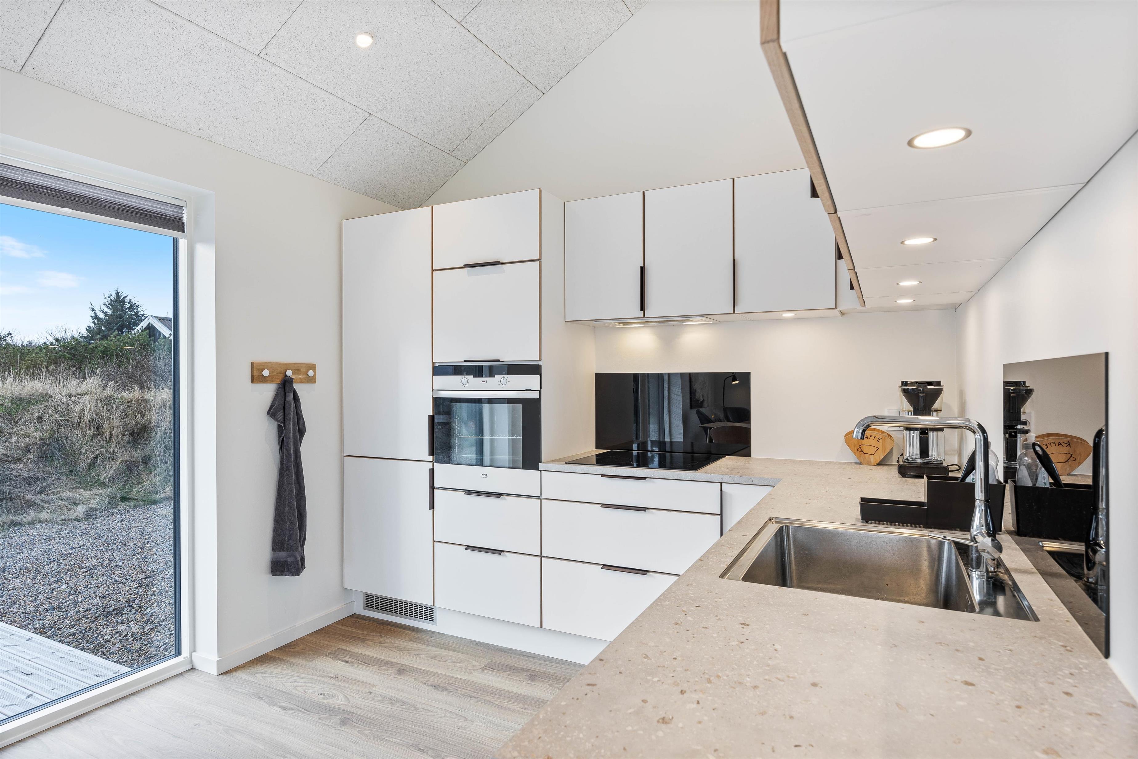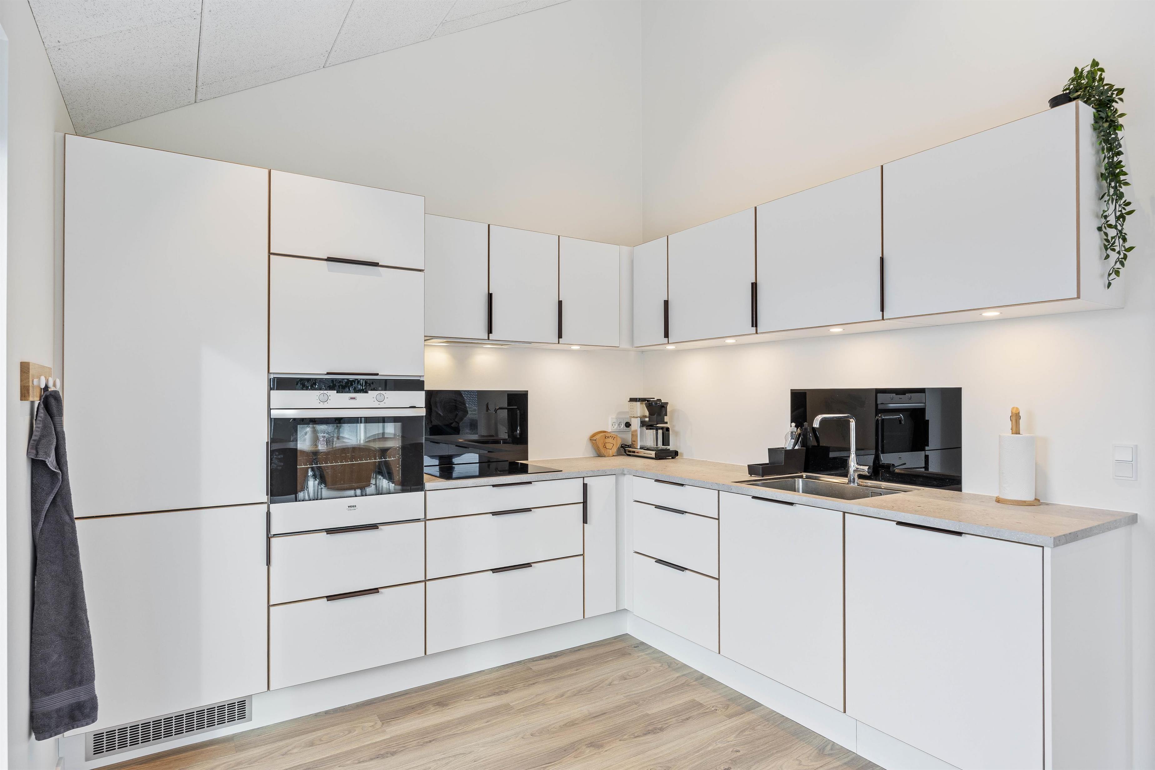 Da feriehuset er nybygget i 2024 vil I derfor blive mødt af en moderne indretning, når I træder ind i feriehuset. Sommerhuset består af 2 afdelinger, der er forbundet med en entre. Det er især praktisk, hvis I skal arrangere en spilleaften sammen, og børnene allerede sover, da køkken og spiseplads ligger i den ene halvdel af feriehuset, mens stue og soveværelser ligger i den anden halvdel. De to badeværelser i feriehuset er placeret med ét i hver afdeling af feriehuset. Hele sommerhuset er udstyret med gulvvarme, så I slipper for at få kolde fødder. Biopejsen i stuen er med til at give en hyglig stemning i feriehuset.
