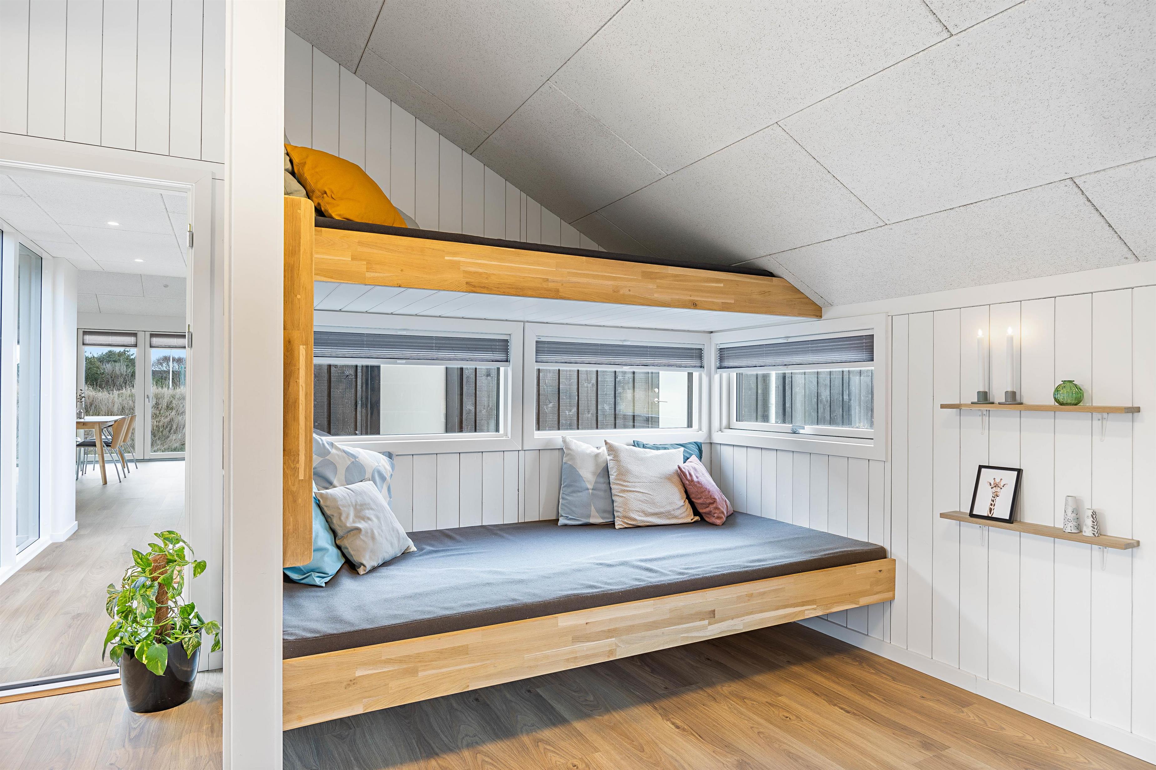Om aftenen kan I fordele jer ud på feriehusets 3 soveværelser og lade batterierne op efter en begivenhedsrig feriedag. 2 af soveværelserne er udstyret med en dobbeltseng, mens det 3. soveværelse har en køjeseng, som dine børn helt sikkert vil synes er et højdepunkt. Der er også tænkt på praktiske ting som vaskemaskine, tørretumbler og opvaskemaskine i dette feriehus, så I slipper for de fleste huslige pligter. Ydermere finder I flere steder hyggekroge inde i feriehuset i form af alkove og hems, som også børnene kan have stor glæde af.