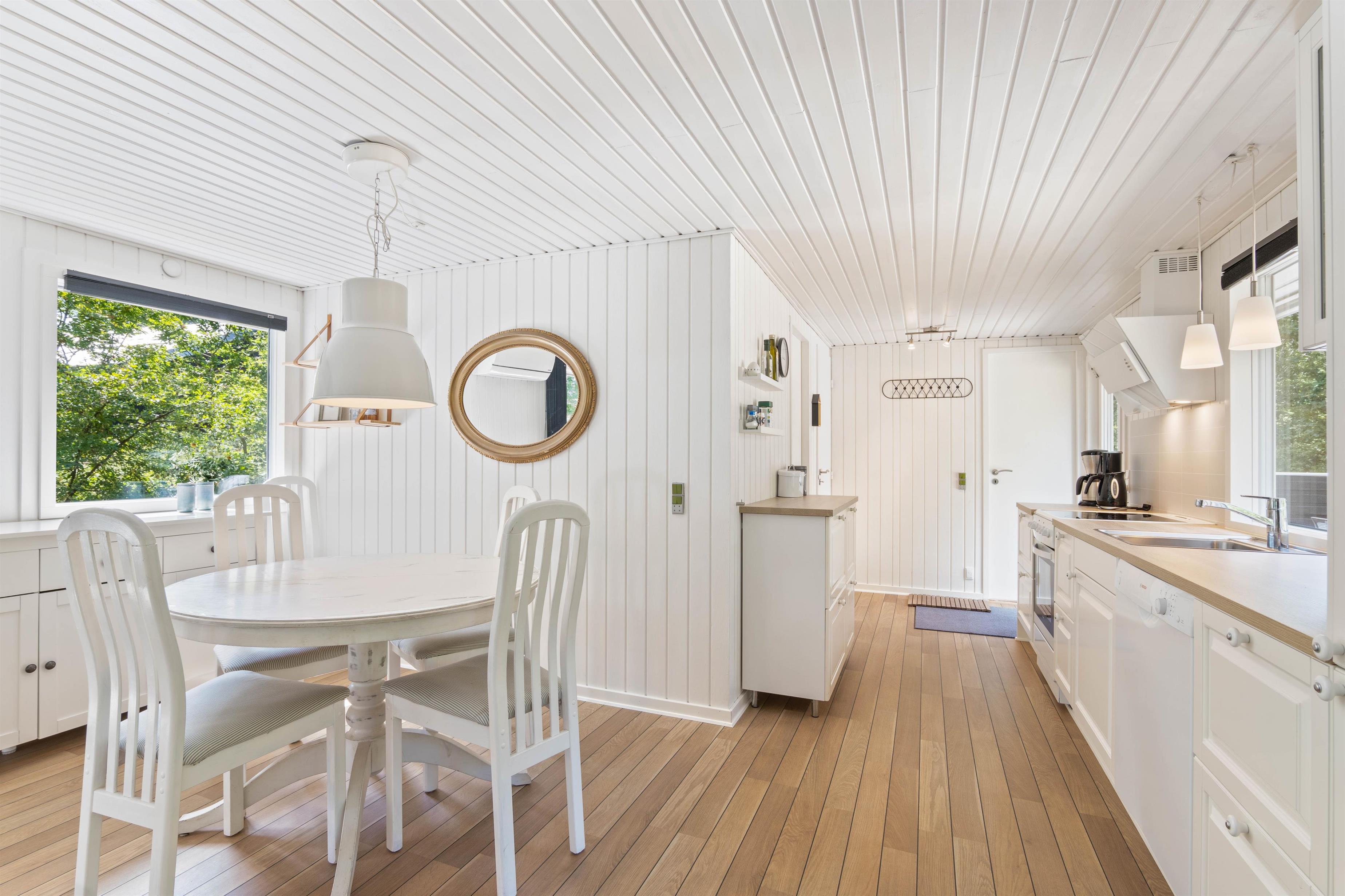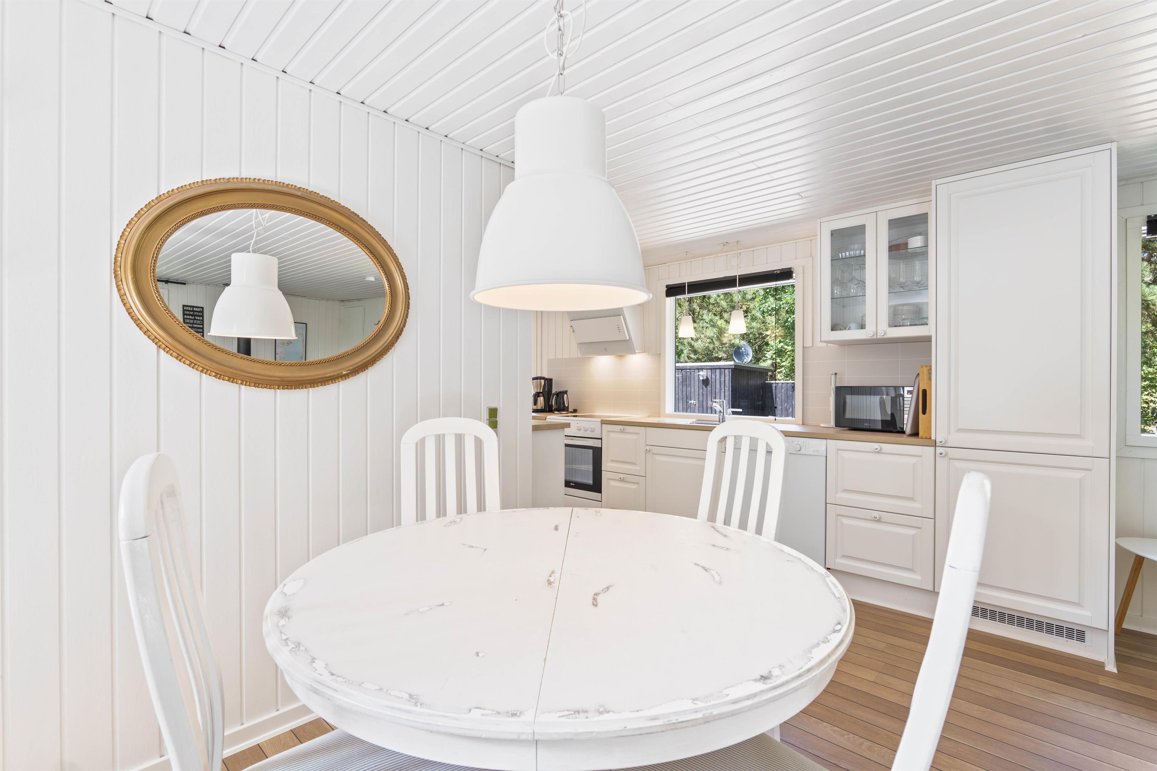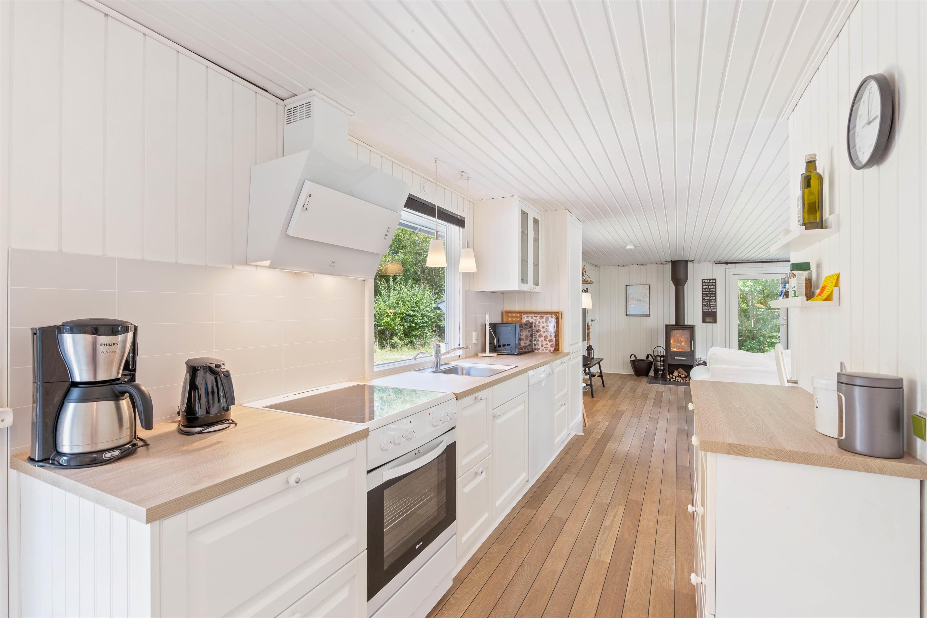 Huset er charmerende og helt lyst indrettet og fremstår indbydende, på trods af de mange træer omkring huset. En skøn kombination! Den flotte brændeovn er populær mange af årets måneder, især efter en lang travetur i området eller ved Vesterhavet. Køkken og spiseafdelingen er tæt forbundet, så man kan nyde tiden og ferien sammen alle sammen.