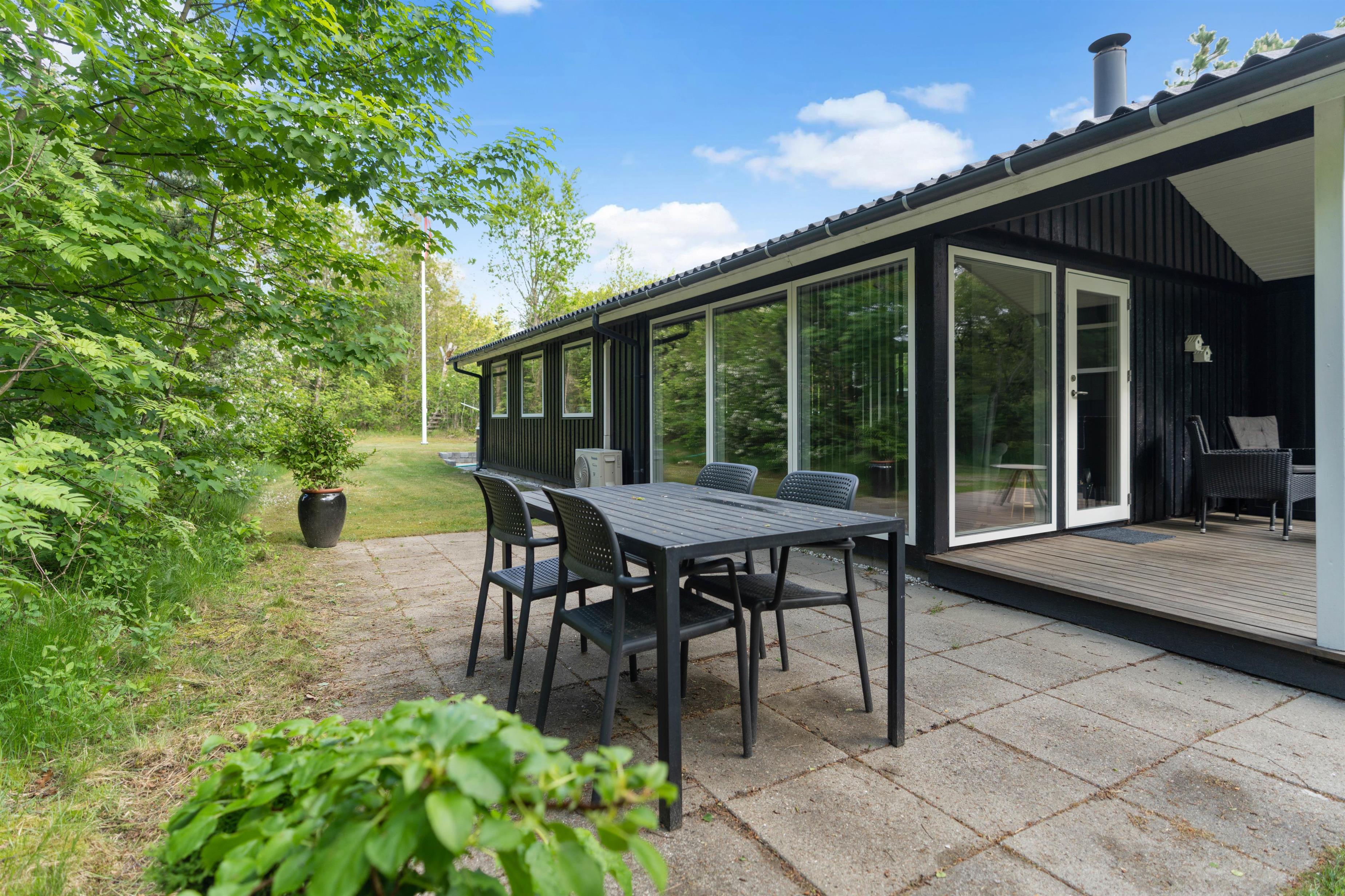 Et feriehus på en læfyldt grund med ny terrasse, vildmarksbad og udebruser