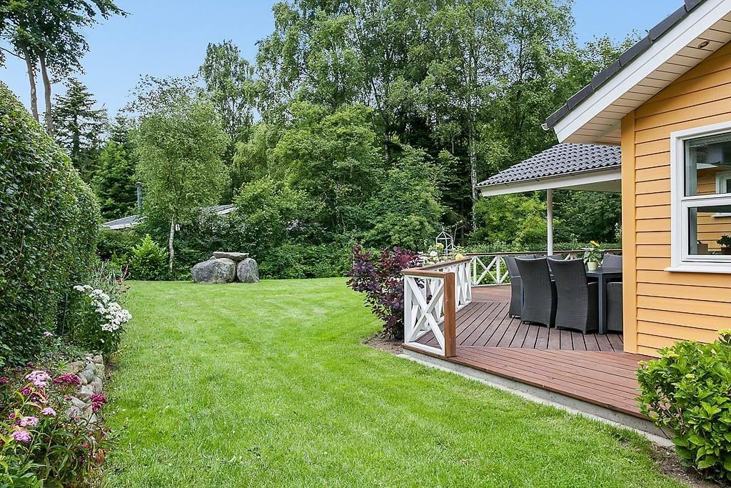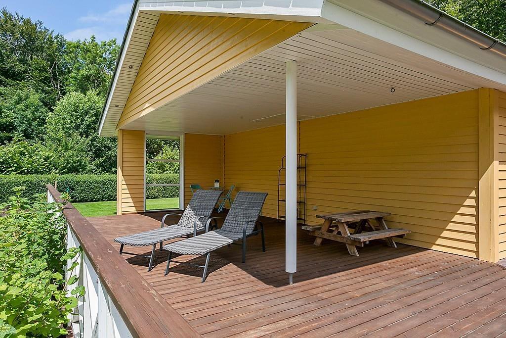 Udelivet får perfekte betingelser på den store, delvist overdækkede terrasse, hvor feriens måltider, kaffepauser og lange sommeraftener kan nydes i ro og mag. Her kan du finde både sol og læ, mens fuglene kvidrer i baggrunden, og duften af sommer breder sig. Haven er indrettet med tanke på både store og små – børnene kan more sig på gyngen eller bygge sandslotte i sandkassen, mens de voksne læner sig tilbage med en god bog eller et køligt glas i hånden. Terrassen bliver hurtigt et naturligt samlingspunkt, hvor dagens oplevelser deles, og nye ferieminder opstår under åben himmel.
