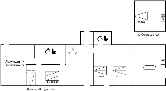 Der er i alt 4 soveværelser. Sovepladserne fordeler sig på: 8 sovepladser i dobbeltsenge. 2 sovepladser i sovesofa (dobbelt). Derudover er der 1 stk. barneseng.