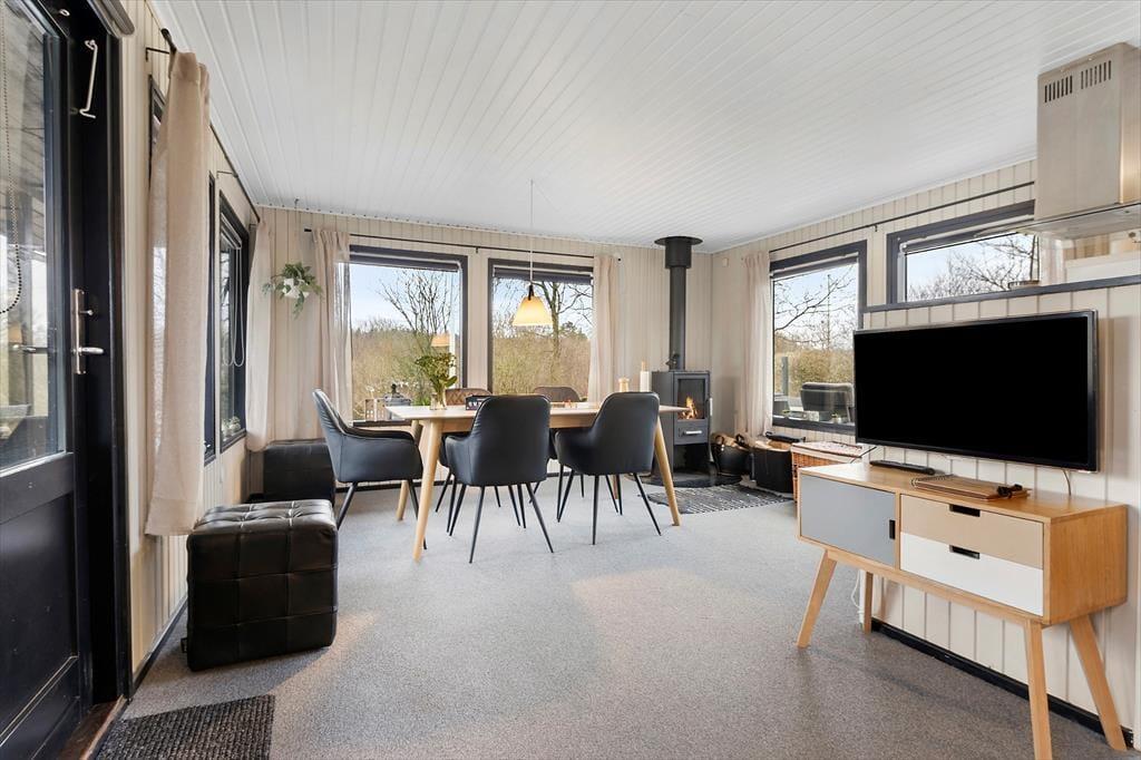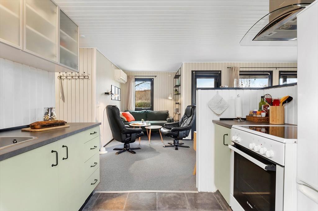 Indenfor mødes du af en varm og hjemlig atmosfære, hvor lyset får lov at fylde rummene og skabe en behagelig ro. Indretningen er enkel og hyggelig, så det er nemt at føle sig hjemme fra første øjeblik. Stuen indbyder til afslappede stunder i sofaen, hvor brændeovnen knitrer i baggrunden og spreder både varme og hygge på kølige dage. Her er det oplagt at fordybe sig i en god bog, spille spil eller bare lade tankerne vandre, mens flammerne danser. Køkken og opholdsrum hænger naturligt sammen, så samværet fortsætter, uanset om der laves mad eller dækkes op til fælles måltider. Stemningen er uformel og afslappet – præcis som en ferie skal være – og rammerne er ideelle for både familier og par, der ønsker en rolig base tæt på fjorden.