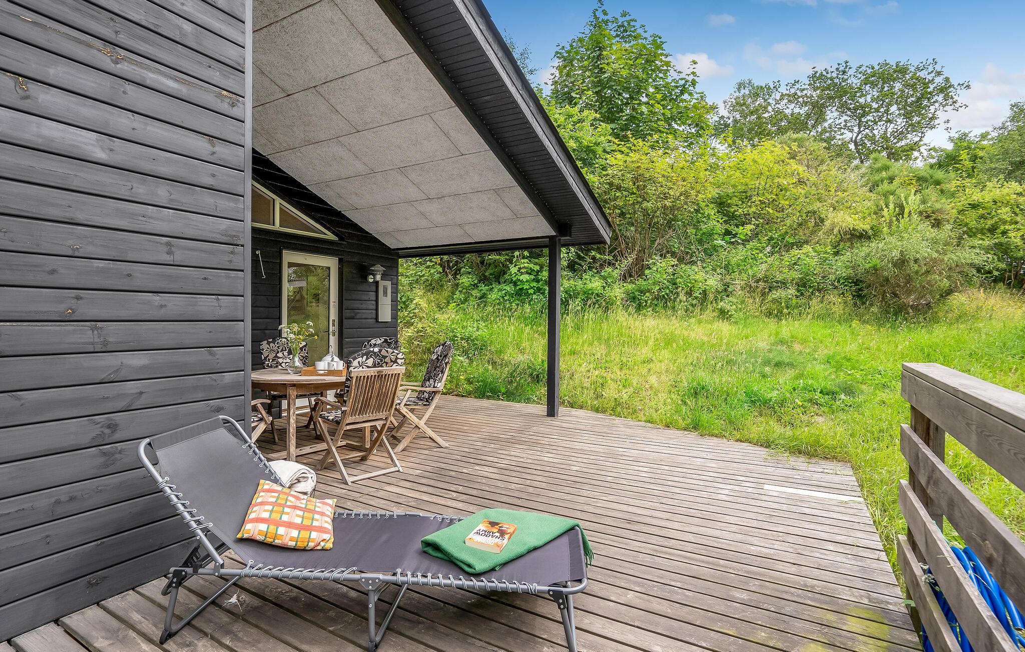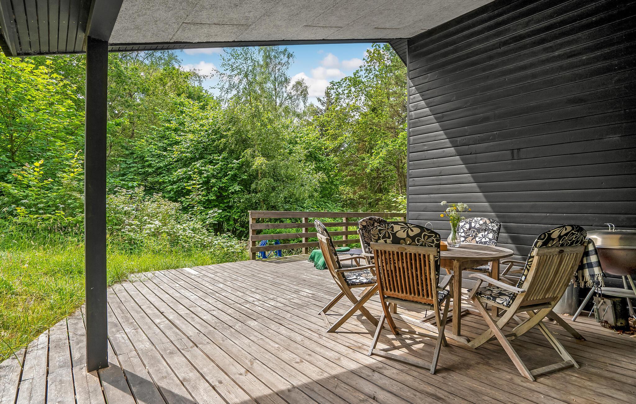 På terrassen kan du sidde under taget og nyde udsigten over de grønne områder og solskin.