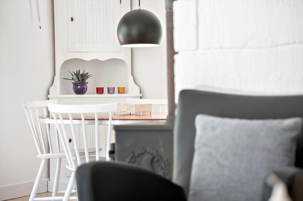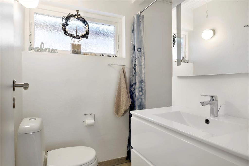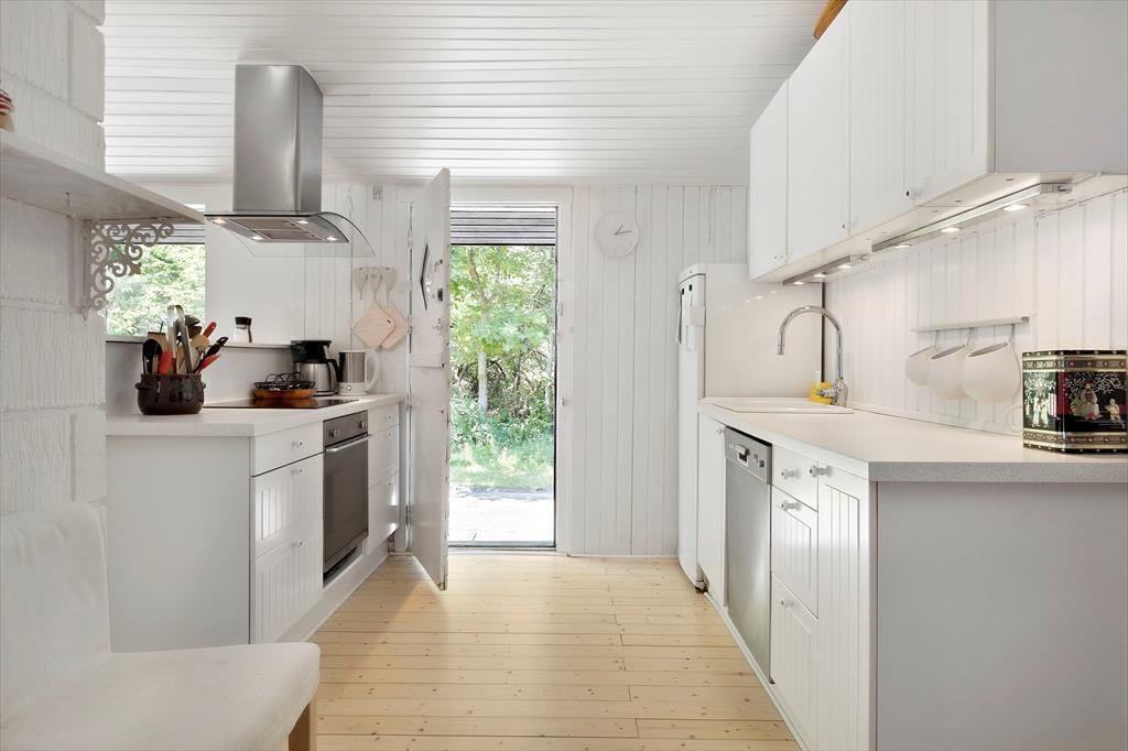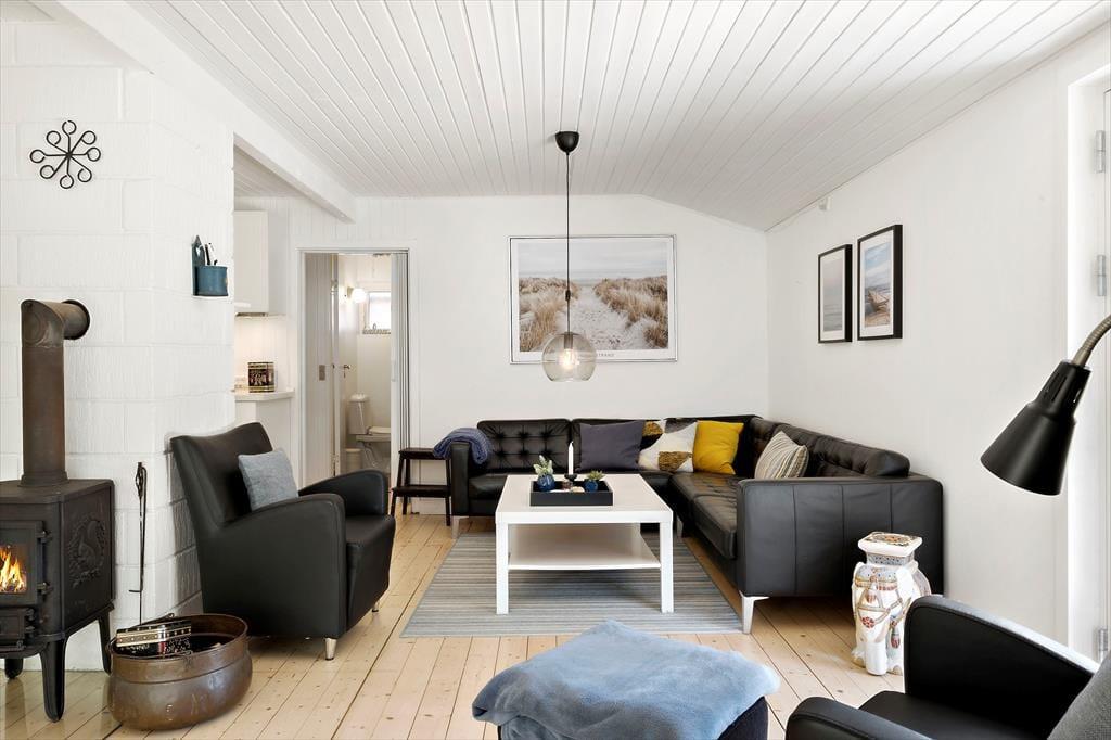 Inde i det 69 m2 store sommerhus er der rart at være. Stuen er rummelig og indrettet med flere gode siddepladser – blandt andet med sofaarrangement nær brændeovnen og en spiseplads ved det integrerede køkken. Endnu en sofakrog er placeret ved et stort sydvendt vindue, så her kan I slappe af i en solstråle og samtidig have fin udsigt til den grønne have. I den anden ende af huset ligger to gode soveværelser og et badeværelse med bruser, og i annekset står der to ekstra senge, så I kan være seks personer i alt. Vaskemaskine og tørretumbler findes i udhuset.