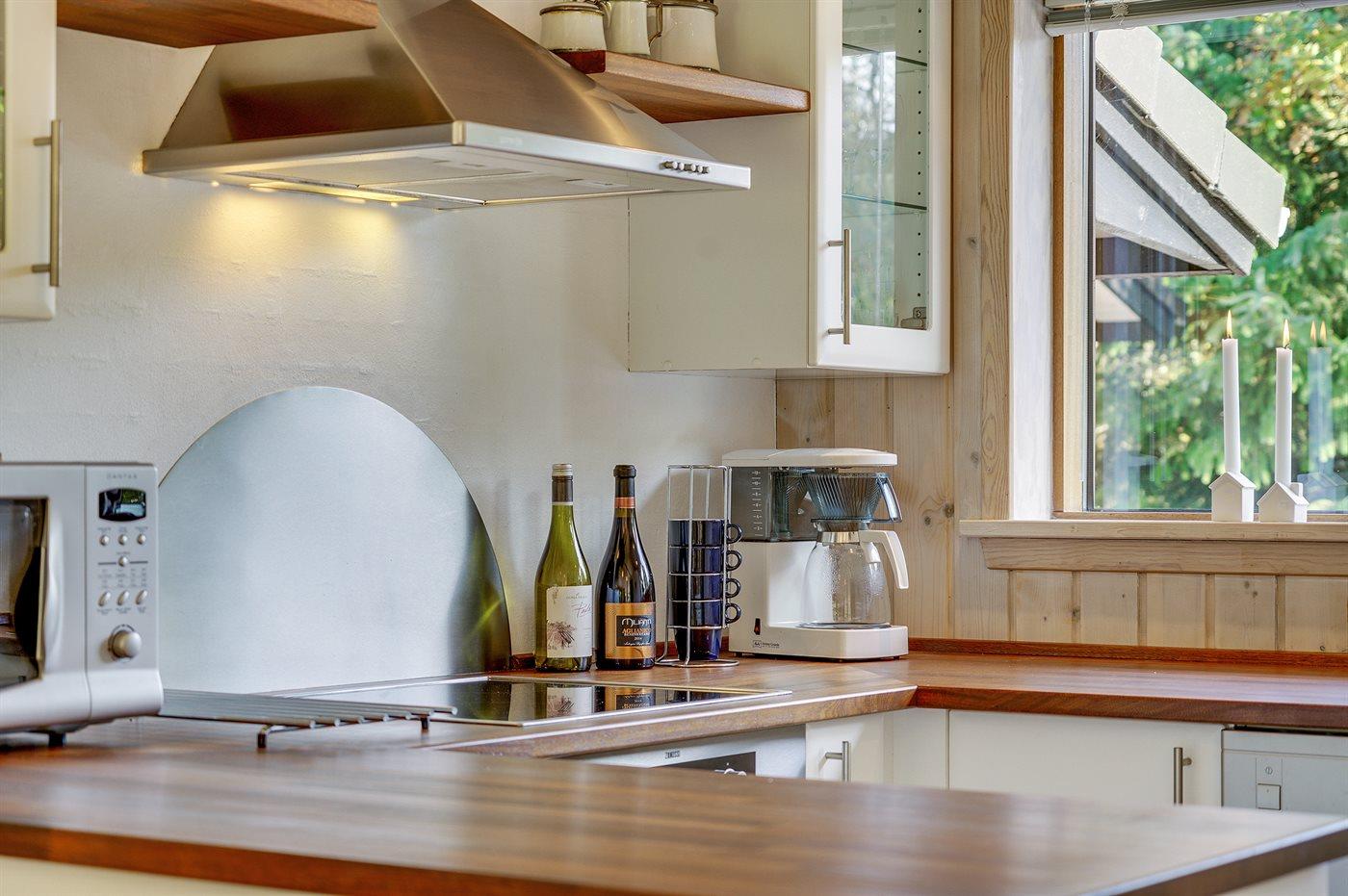 Køkkenet er udstyret med 1 køleskab, varmluftovn, mikrobølgeovn samt opvaskemaskine.