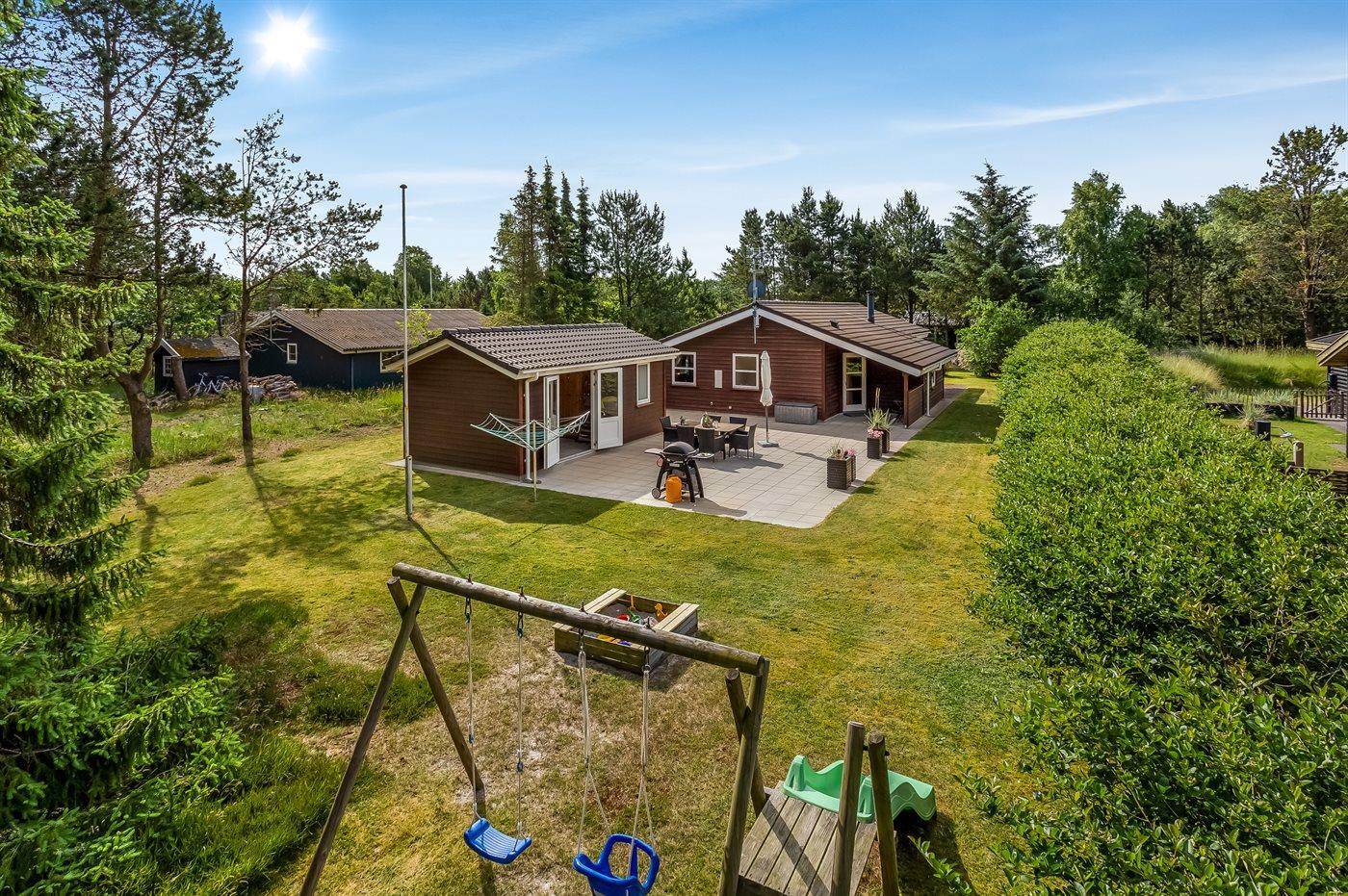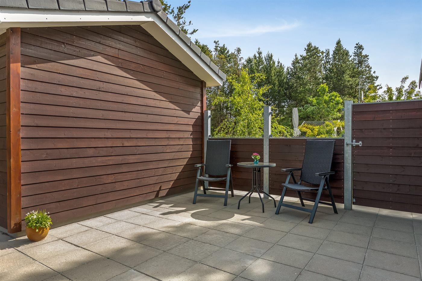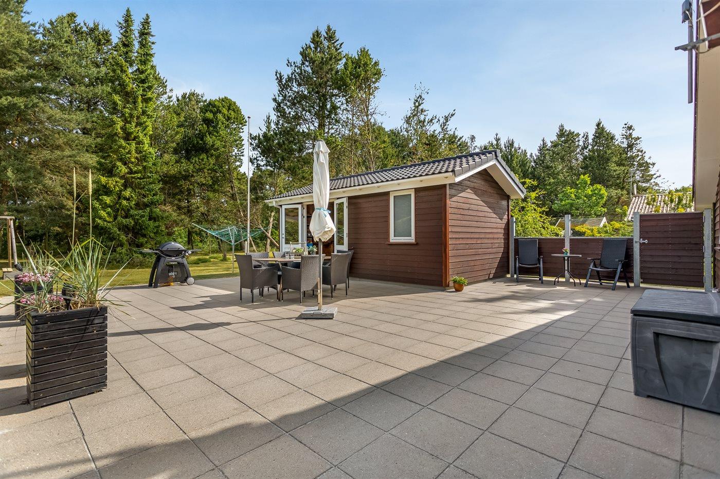 Ferieboligen er beliggende på en 1000 m² stor naturgrund. Der er 200 m til havet. Nærmeste forretning er beliggende i en afstand af 8000 m. Der er en golfbane i en afstand af 10000 m. Til ferieboligen hører 80 m² terrasseareal. Desuden er der 8 m² overdækket terrasse. Der er redskabsrum. Gynge. Sandkasse. Gasgrill står til rådighed. Parkering ved ferieboligen.