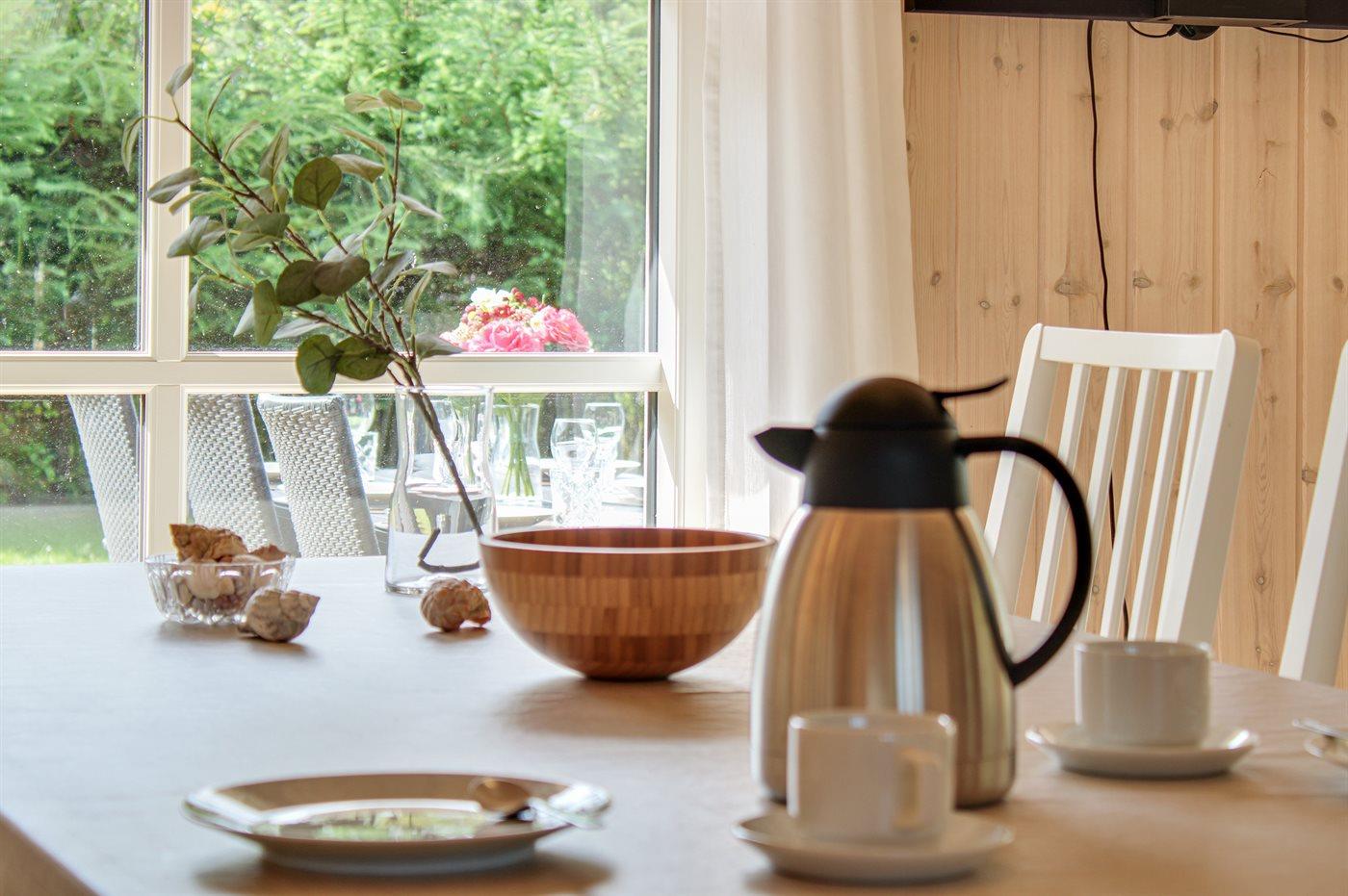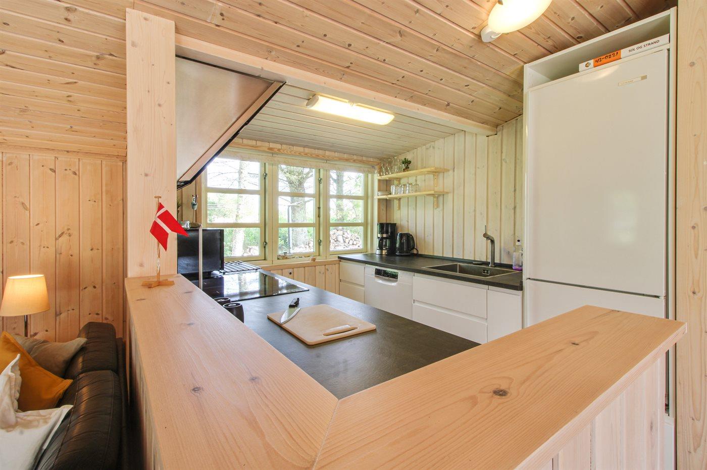 Køkkenet er udstyret med 1 køleskab. Der er 4 induktionskogeplader, varmluftovn, mikrobølgeovn samt opvaskemaskine.