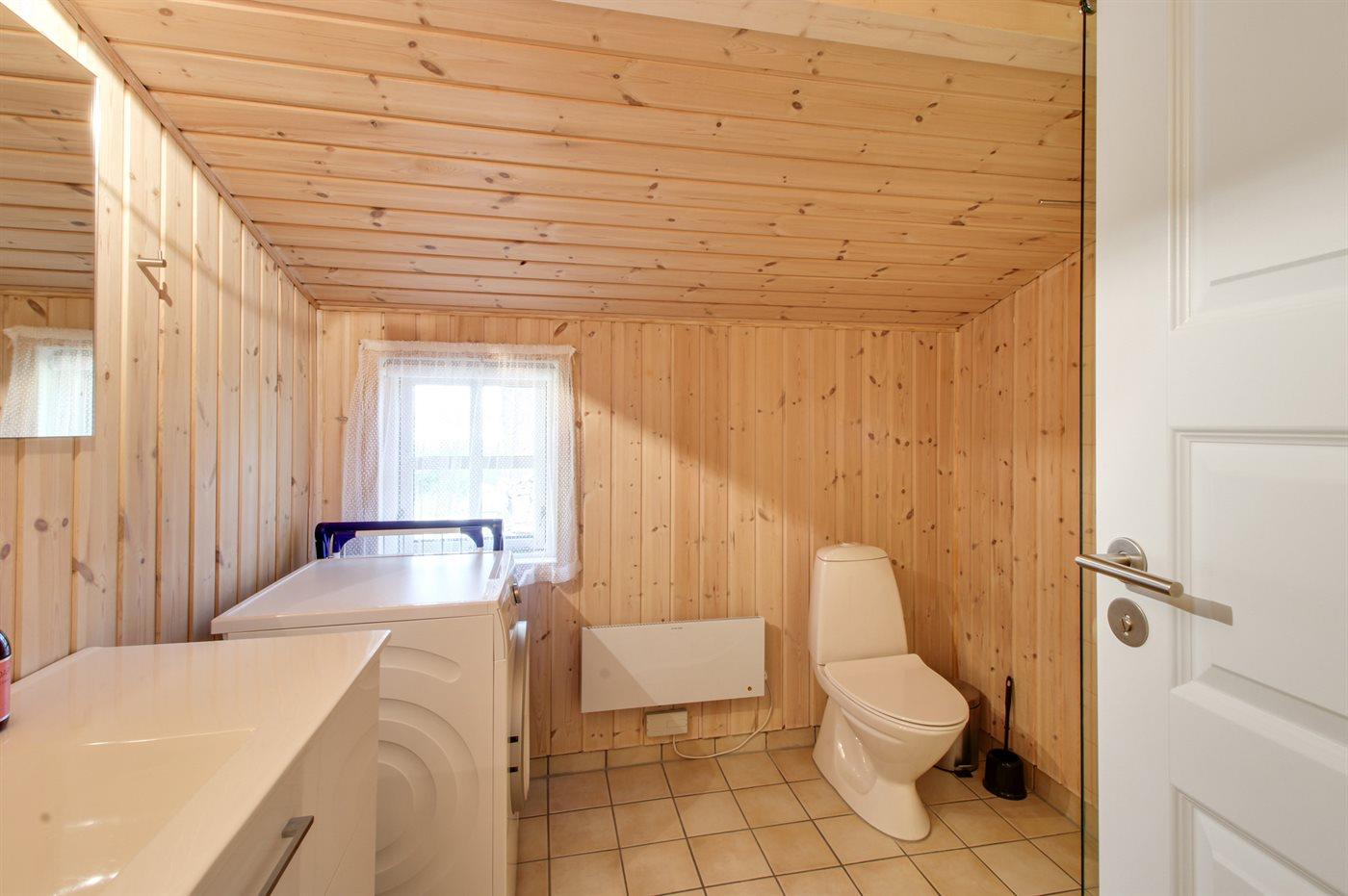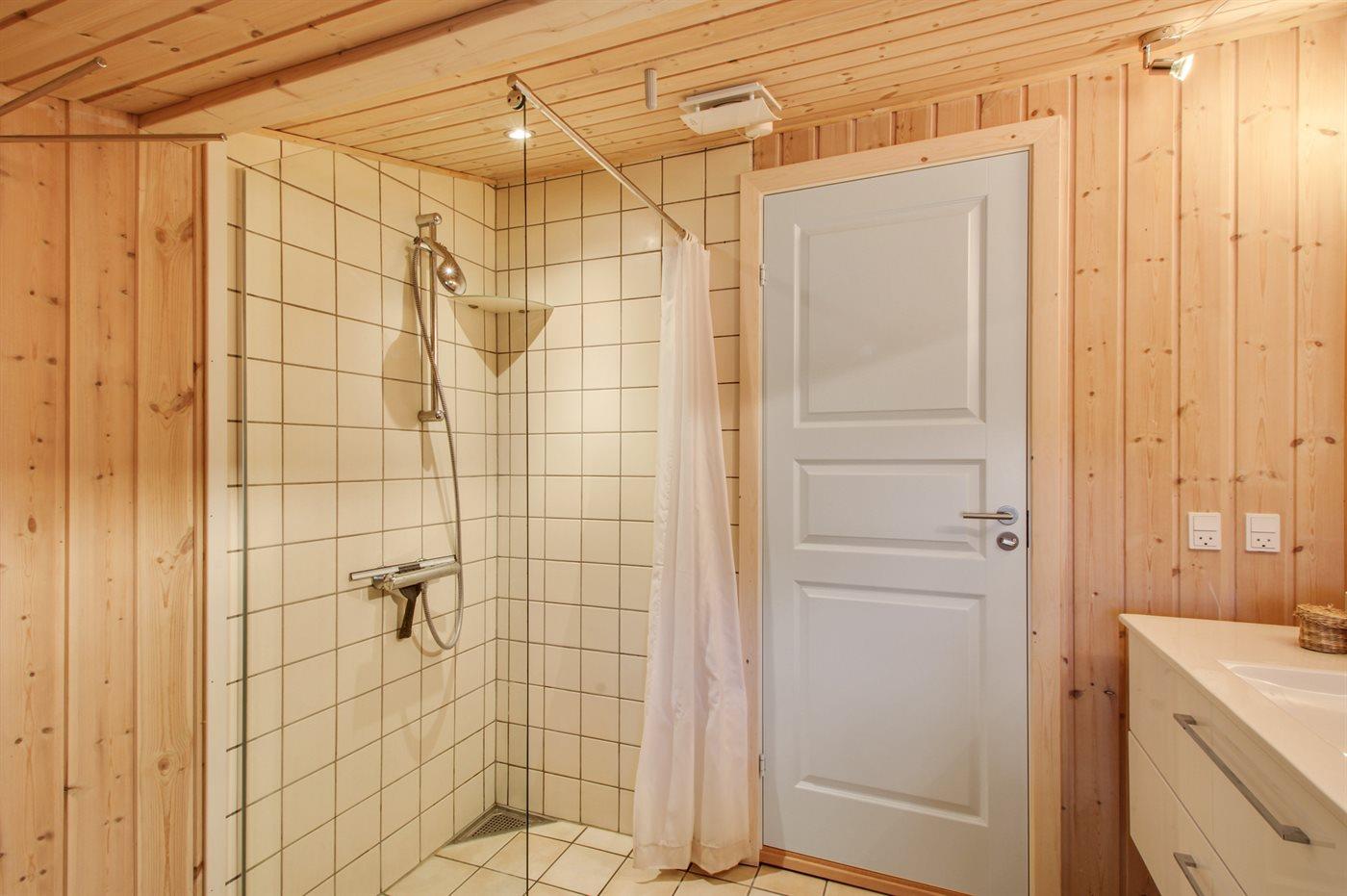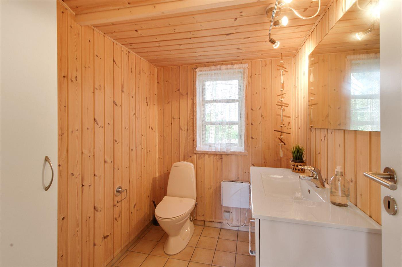 Der er 1 badeværelse med bruser, toilet og gulvvarme. Der er 1 gæstetoilet med gulvvarme.