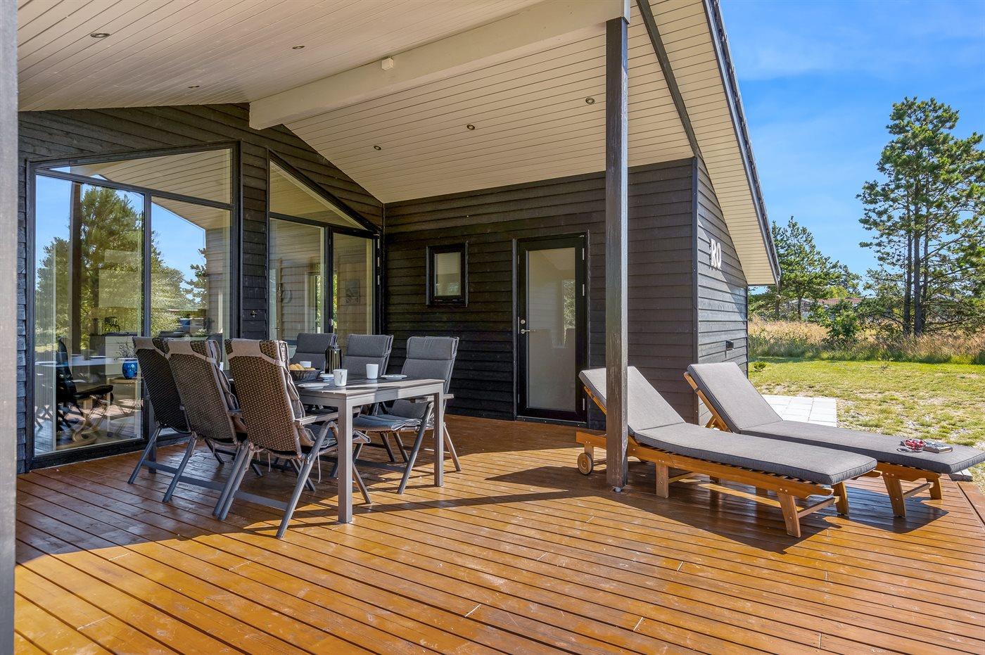 Moderne sommerhus kun 225 meter fra børnevenlig sandstrand med el-lader og hyggelige udendørsfaciliteter.