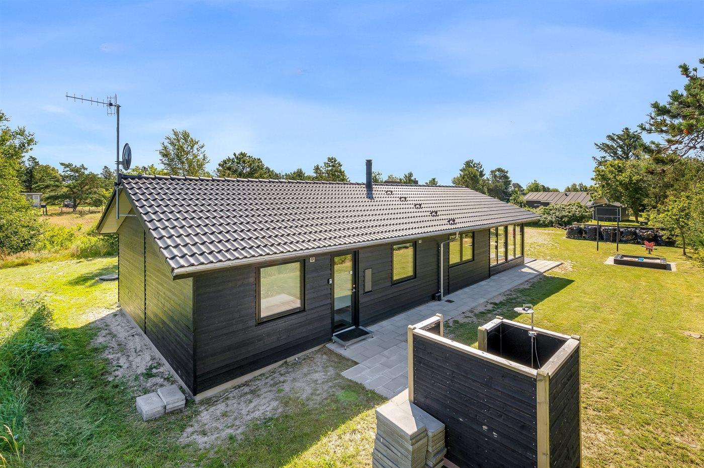 Ferieboligen er beliggende på en 835 m² stor naturgrund. Der er 225 m til havet. Nærmeste forretning er beliggende i en afstand af 5000 m. Desuden er der 24 m² overdækket terrasse. Til ferieboligen hører åbent terrasseareal. Der er redskabsrum. Gynge. Sandkasse. Vippe. Grill til rådighed. Der er installeret stik til opladning af elbil. Parkering ved ferieboligen.