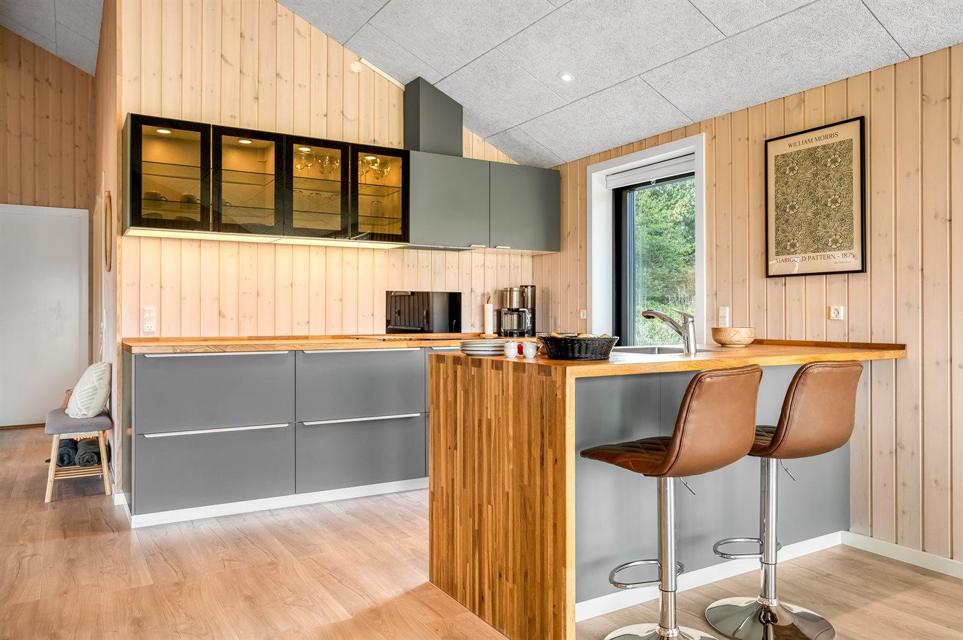 Køkkenet er udstyret med 1 køleskab. Der er 4 keramiske kogeplader, varmluftovn, mikrobølgeovn samt opvaskemaskine.