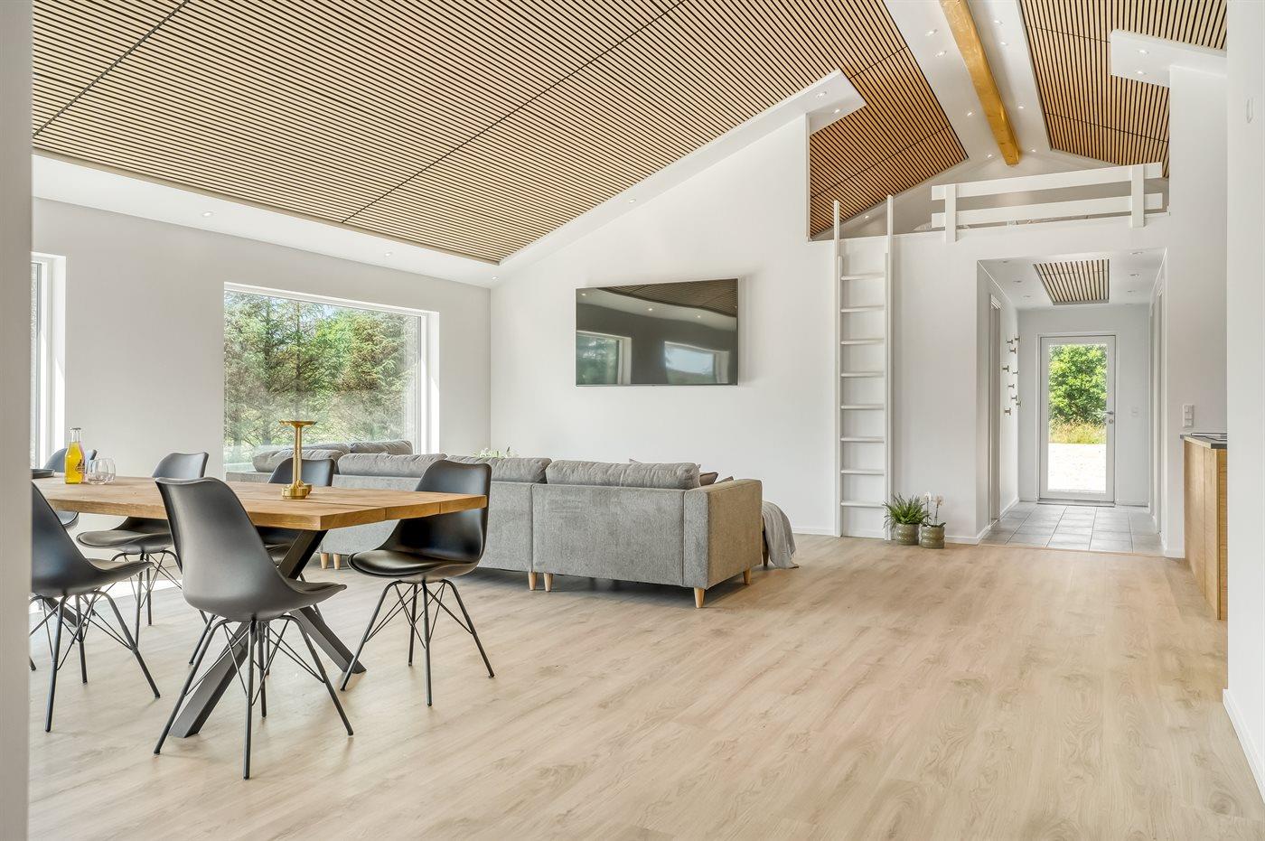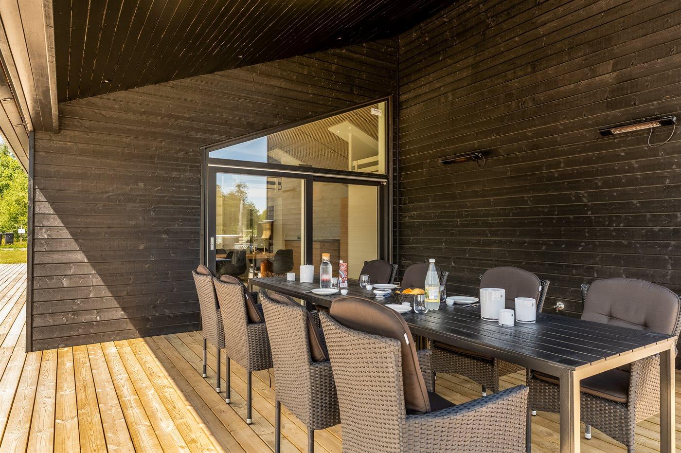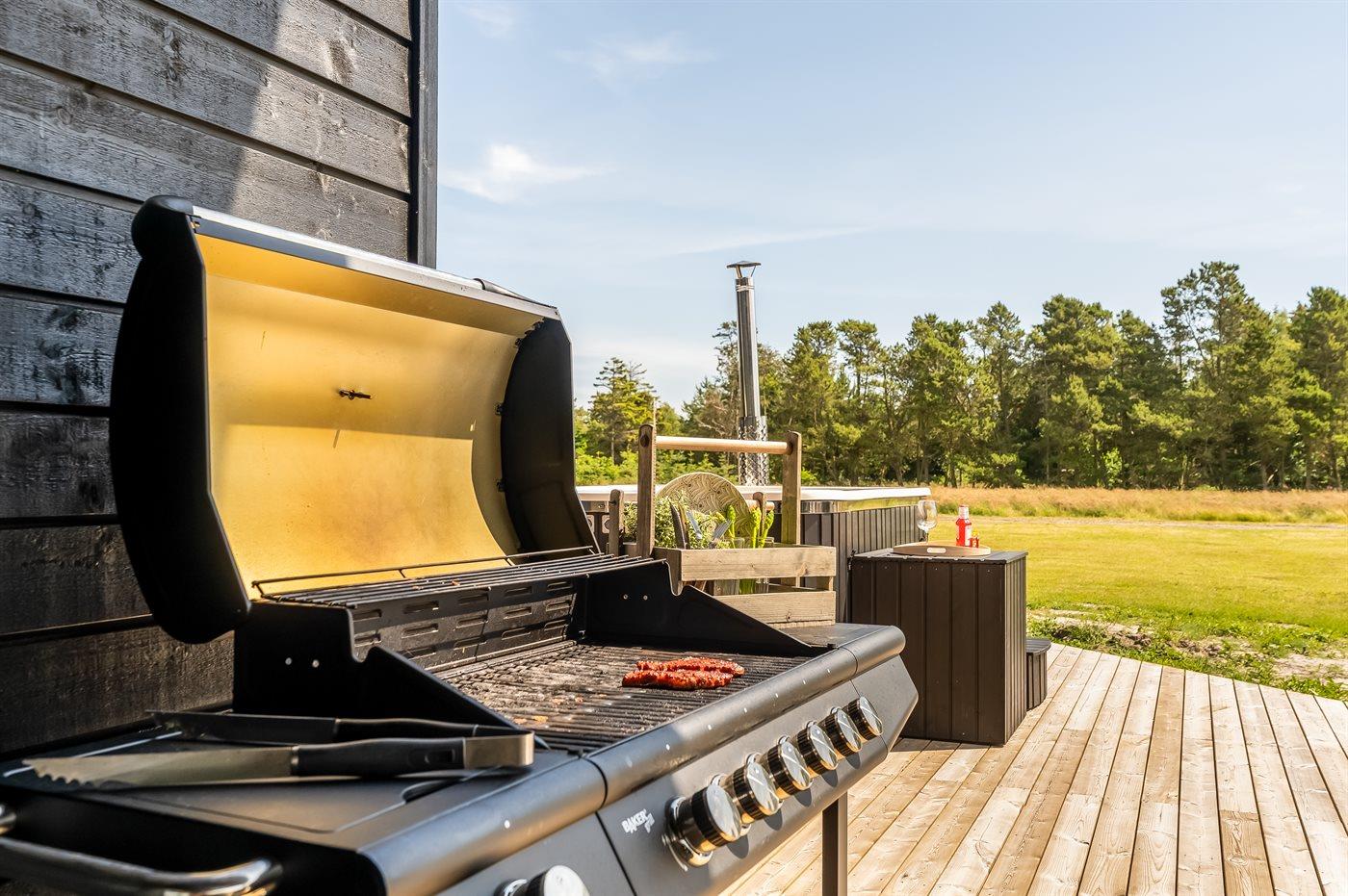 Den store terrasse omkranser hele huset og giver mulighed for at nyde solen hele dagen, mens den overdækkede terrasse skaber en hyggelig ramme til de lune sommeraftener. Her finder I også en luksuriøs udesauna, udendørs bruser og et vildmarksbad, der sikrer afslapning under åben himmel. Med en grill til rådighed kan I nyde hyggelige middage på terrassen og skabe skønne ferieminder i naturskønne omgivelser.