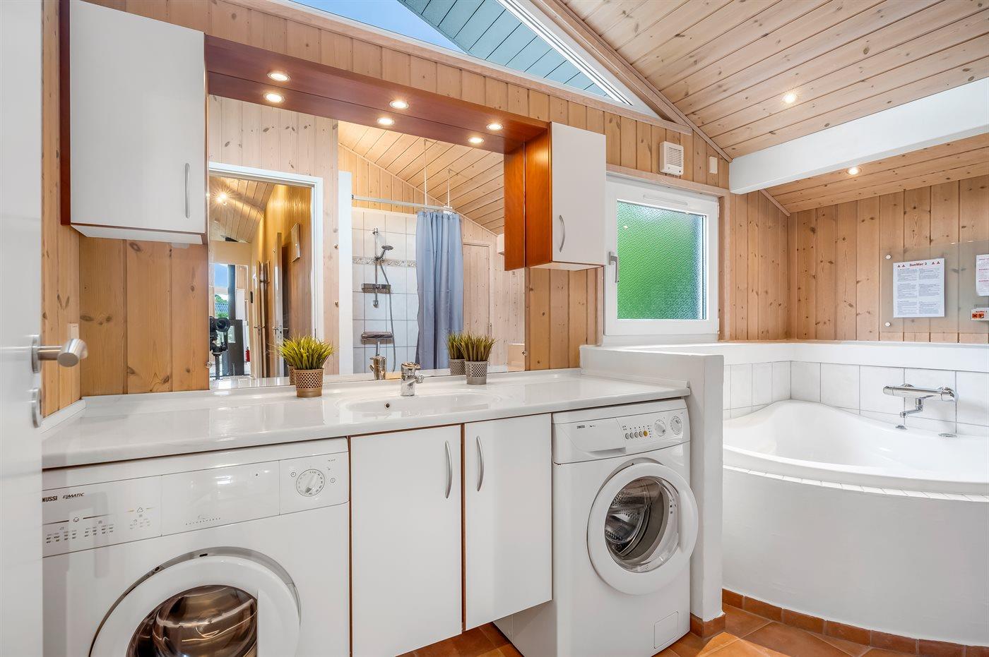 Der er 2 badeværelser med bruseniche og 2 toiletter. Der er gulvvarme på 2 badeværelser. I saunaen er der mulighed for afslapning.