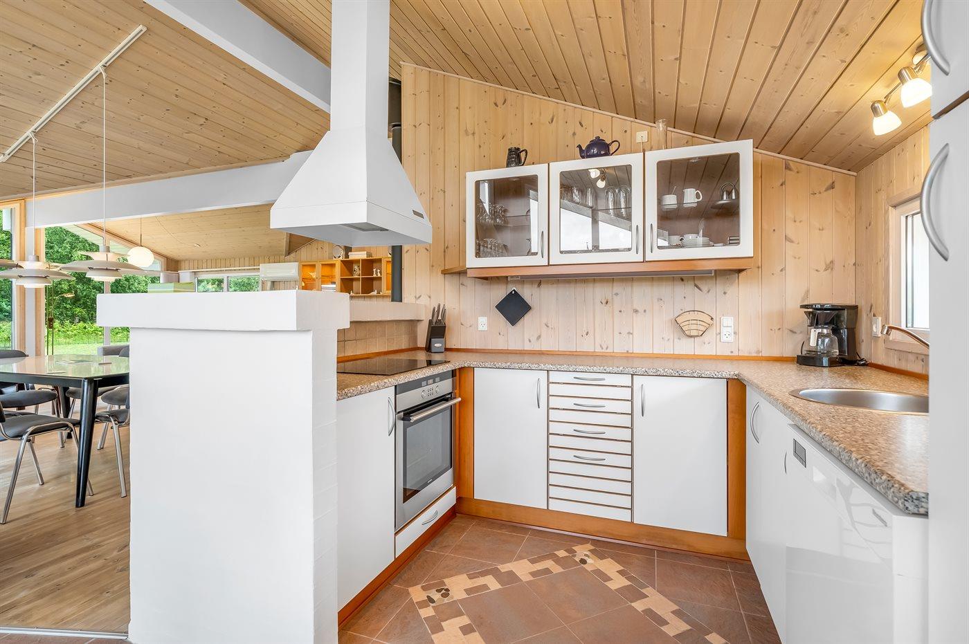 Køkkenet er udstyret med 1 køleskab. Der er 4 induktionskogeplader, varmluftovn samt opvaskemaskine.