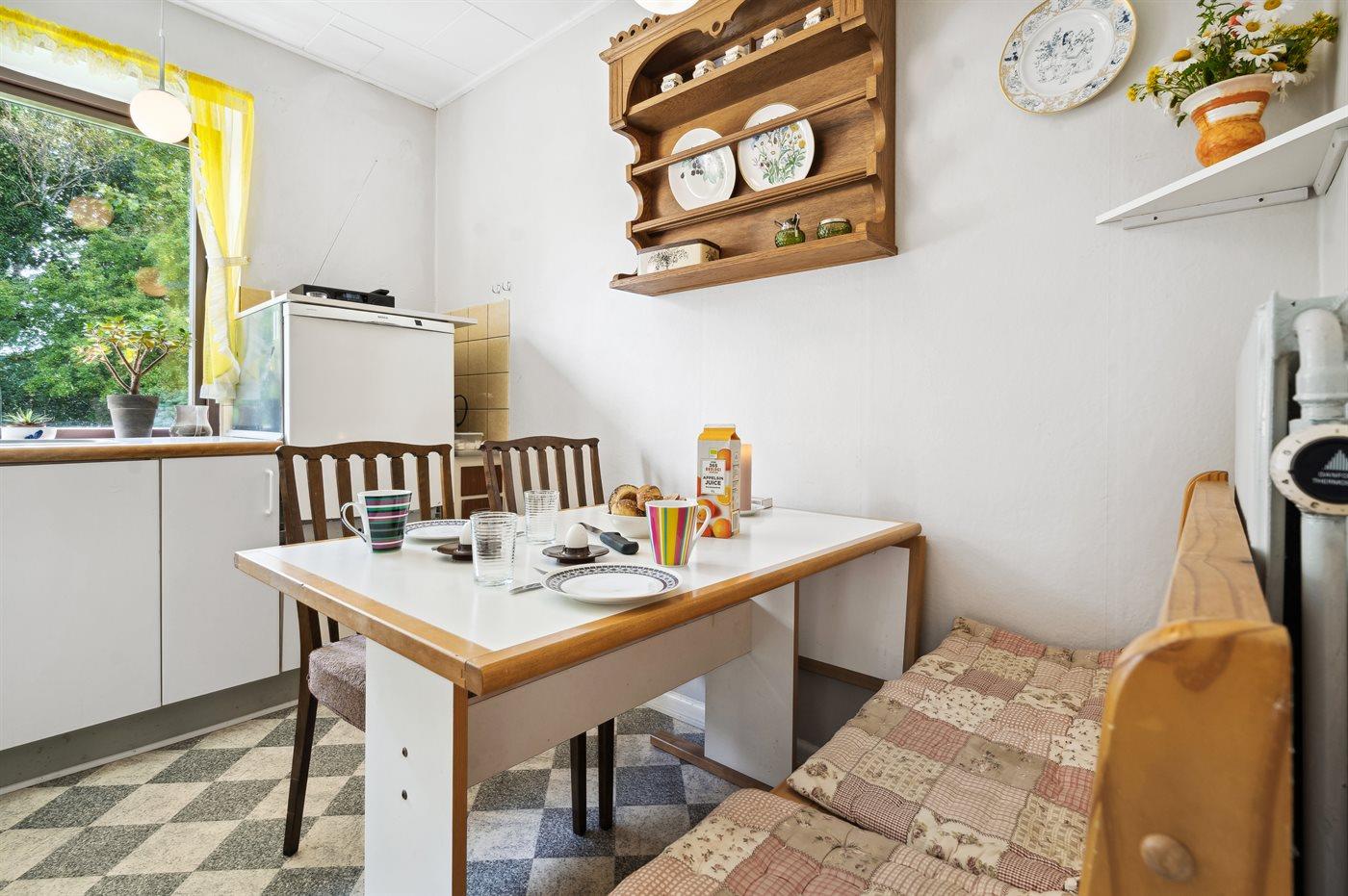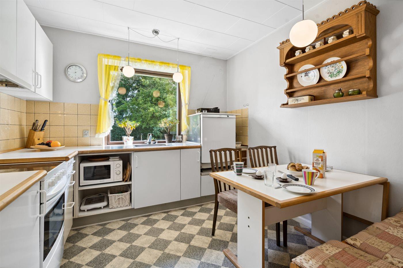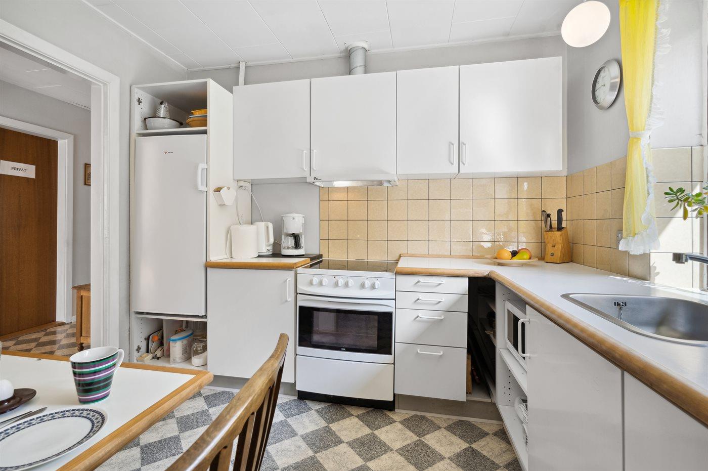 Køkkenet er udstyret med 1 køleskab. Der er 4 elkogeplader, varmluftovn, mikrobølgeovn samt opvaskemaskine.