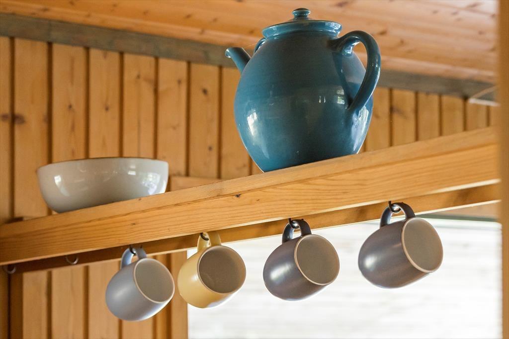 Stuen er hyggeligt indrettet med komfortable møbler og store gulv til loft vinduer mod terrassen, der giver et dejligt lysindfald og udsigt til de grønne omgivelser. Du kan også tænde op for varmen og hyggen i brændeovnen i de kolde perioder. I stuen er et TV uden kanaler men med en Chromecast, så du kan se dit eget indhold via din telefon.