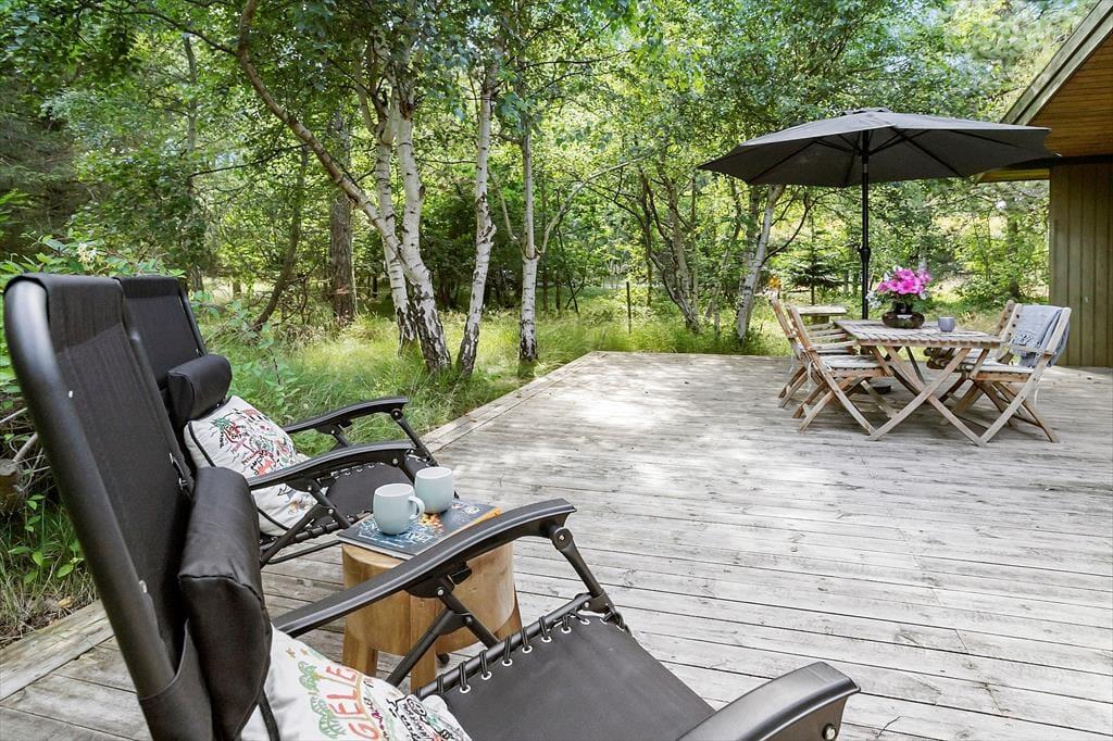Mårup Skov er et attraktivt sommerhusområde, da man både er omgivet af skov og du er helt tæt på havet. Sommerhuset har kun 100 meter til en dejlig sandstrand, hvor man kan gå lange ture eller hoppe i bølgen blå. Omkring sommerhuset er skoven helt tæt på, så du befinder dig på en naturgrund med lyng og højt græs. Sommerhusets delvist overdækkede terrasse mod syd har gode havemøbler, og her finder man både læ og udsigt til skoven og havet.