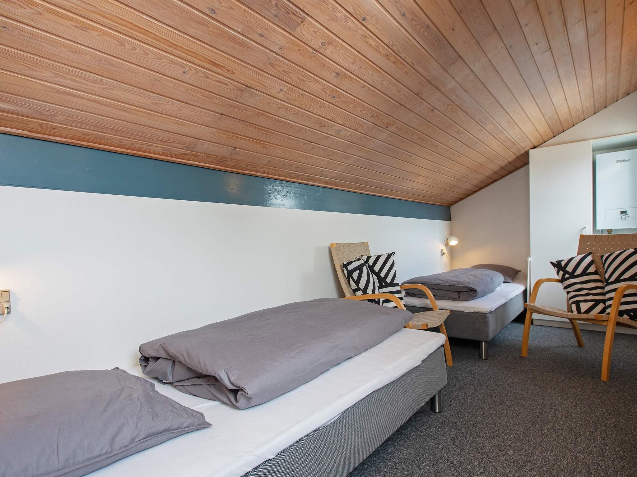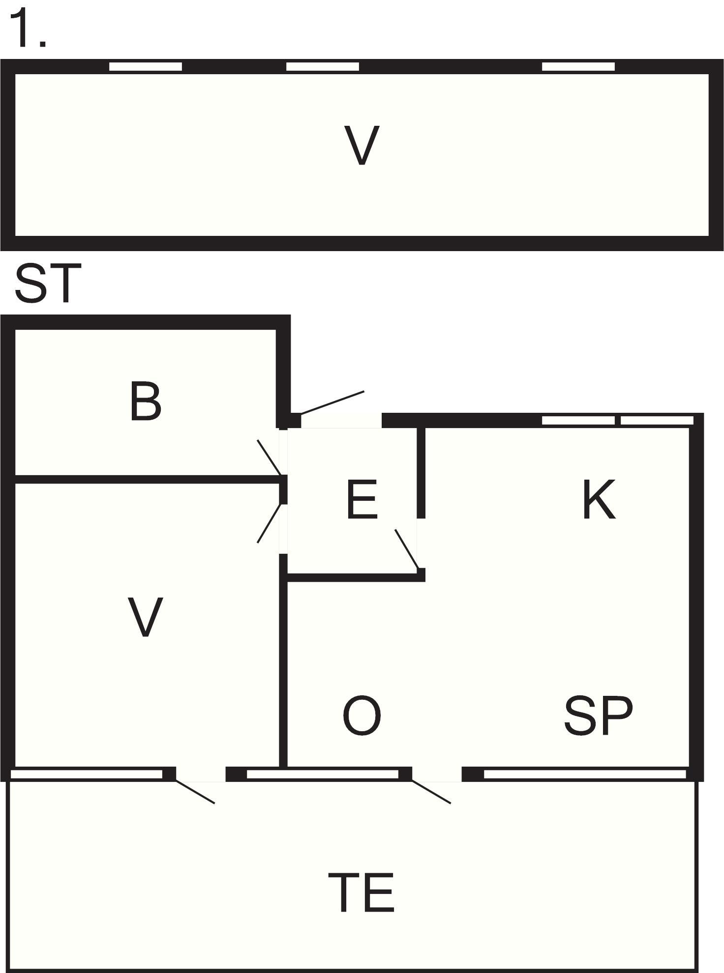 I stueplan er der entre, åbent køkken til stuen, soveværelse med dobbeltseng og badeværelse. Fra stuen er der udgang til egen terrasse, hvor I kan grille. Der er trappe til 1. salen, hvor sovepladserne er fordelt med 2 enkeltsenge.