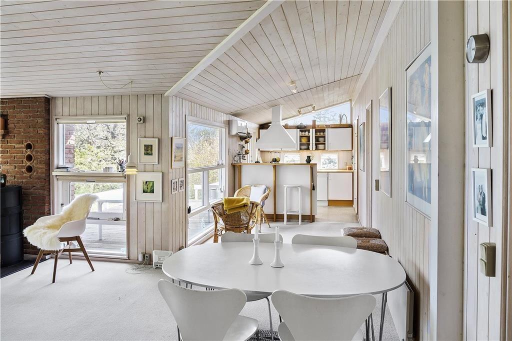 Fra stuen er der også udgang til den, delvist, overdækkede terrasse, samt haven som fører direkte ned til stranden.